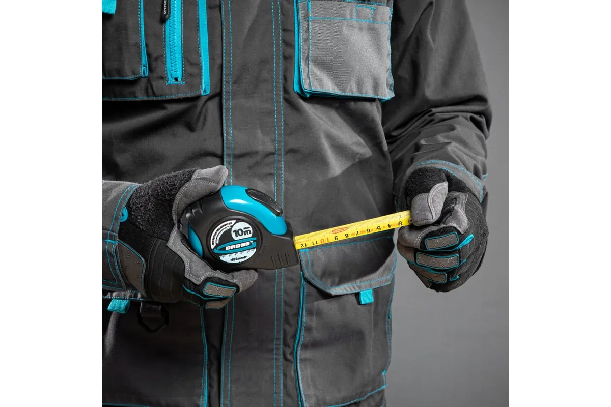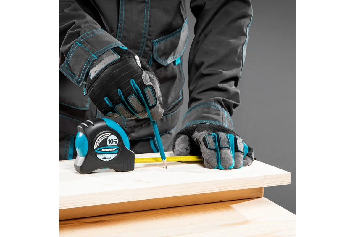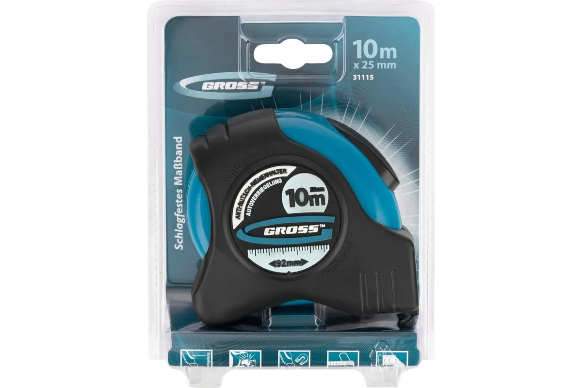 Рулетка Gross «Schlagfest» 31115 с магнитным обрезиненным зацепом, двухсторонней шкалой и функцией автоматической фиксации полотна, 10 м х 25 мм, позволяет определять размеры материалов, вычислять площадь помещения и проводить другие измерительные работы Карманная рулетка — незаменимый инструмент в хозяйстве и на строительной площадке. Магнитный обрезиненный зацеп обеспечивает возможность захвата скользких и металлических поверхностей со сложной формой.