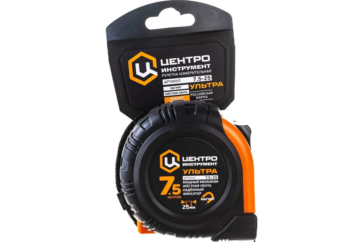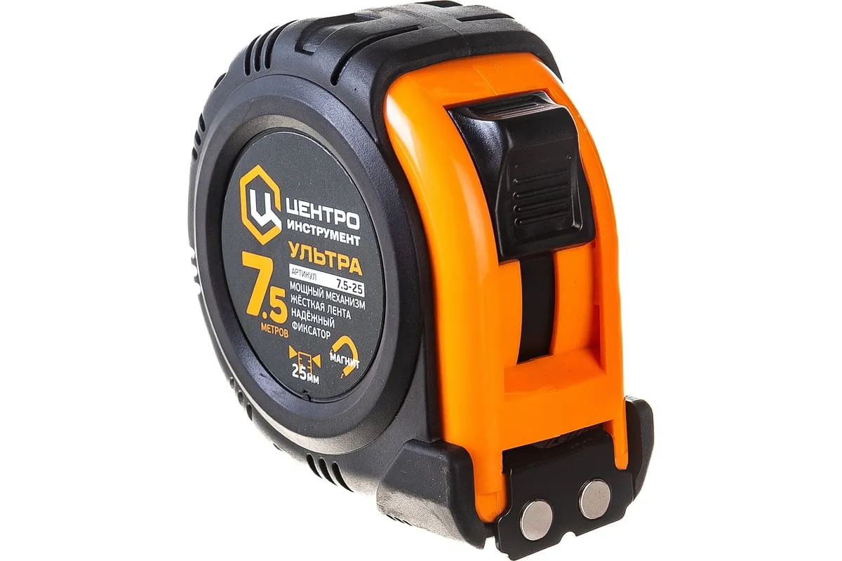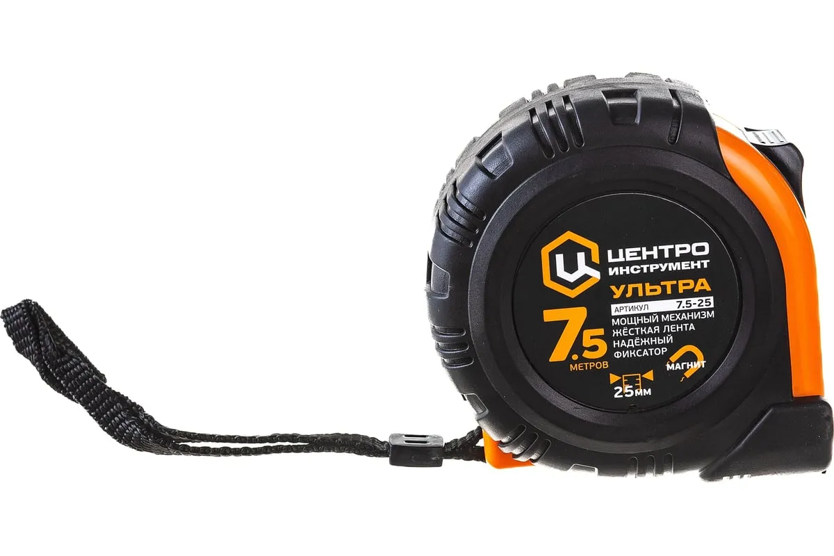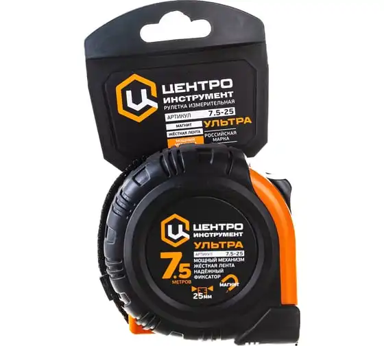 Рулетка 7.5мх25мм Центроинструмент ULTRA служит для проведения линейных замеров в строительных или ремонтных работах. Оснащена фиксатором мерной ленты, который позволяет делать точные замеры. Мощный механизм возврата ленты обеспечивает быстрое окончание работы. Обрезиненный корпус защищает рулетку от повреждений при падении. Ремешок на запястье необходим, чтобы освободить руки или подвесить изделие на пояс.