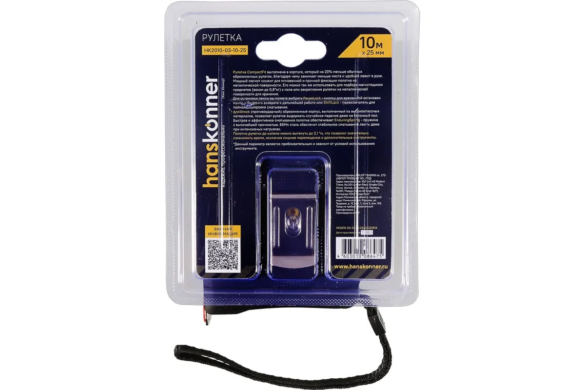 Рулетка оснащена полотном из углеродистой стали С60 с увеличенной толщиной по сравнению с обычными рулетками. Это обеспечивает более дальний вылет без излома ленты. Предельная длина достигает 280 см при вертикальном вылете и 210 - при горизонтальном. Пружина для сматывания полотна также изготовлена из HiQ стали и увеличивает ресурс на количество сматываний в 2,5 раза. TPR покрытие корпуса из ударопрочного пластика обеспечивает надежное удержание инструмента в мокрых ладонях. Небольшой вес корпуса также способствует облегченному удержанию в течение продолжительного периода времени. Благодаря четкой разметке ленты инструмент удобен для измерений даже при слабом освещении. Рулетка обеспечивает удержание веса до 800 г, что позволяет работать с металлическими конструкциями в одиночку. Также магнит допускает удержание двух развернутых лент общей длиной до 20 метров.