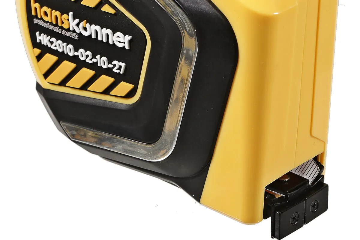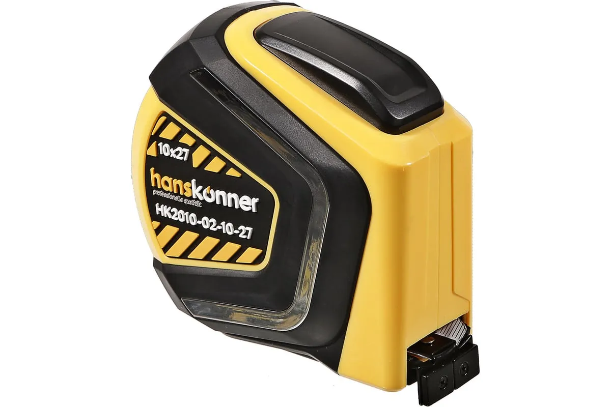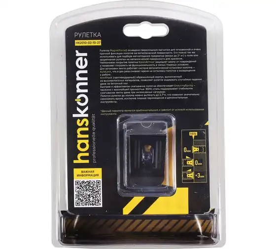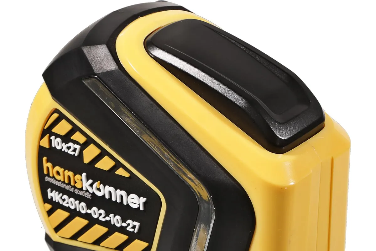 Рулетка Hanskonner 10x27 HK2010-02-10-27 оснащена полотном из хромванадиевой стали с увеличенной толщиной по сравнению с обычными рулетками. Это обеспечивает более дальний вылет без излома ленты. Предельная длина достигает 270 см. Пружина для сматывания полотна также изготовлена из CrV стали и увеличивает ресурс на количество сматываний в 2,5 раза. TPR покрытие корпуса из ударопрочного пластика обеспечивает надежное удержание инструмента в мокрых ладонях. Небольшой вес корпуса также способствует облегченному удержанию в течение продолжительного периода времени. Наличие двойного неодимового магнита позволяет удерживать груз массой до двух килограммов или соединять между собой до 20 метров ленты суммарно на двух рулетках. Для удобства транспортировки инструмент дополнительно оснащен металлическим зацепом.