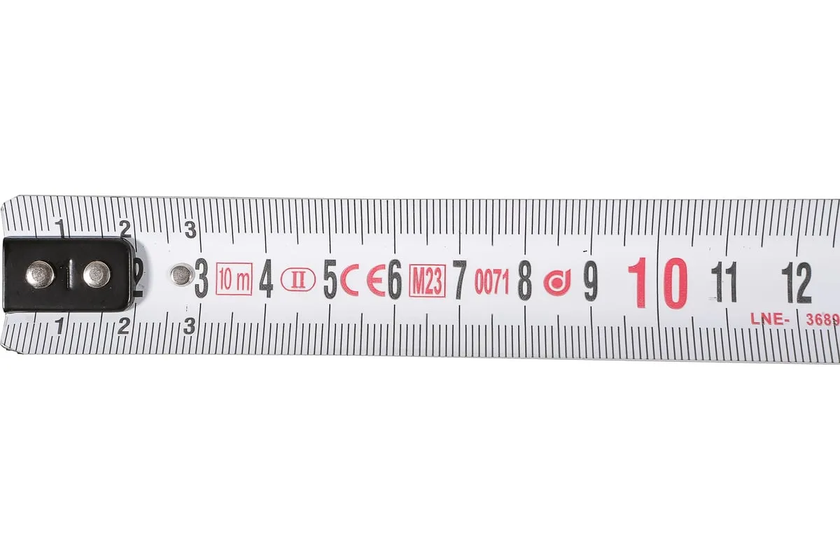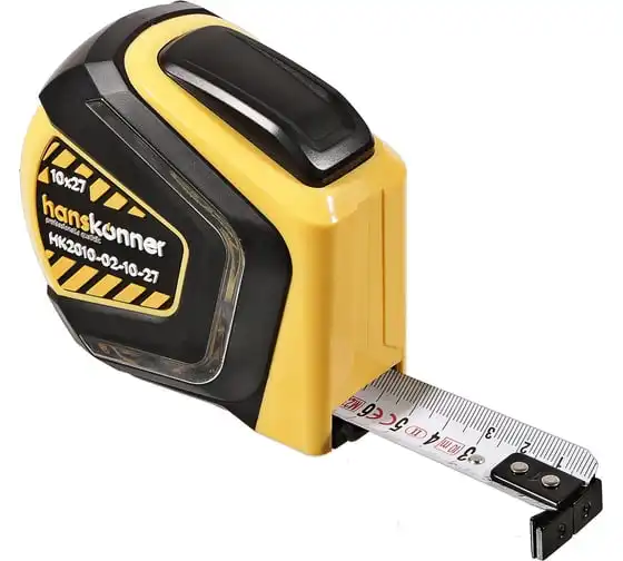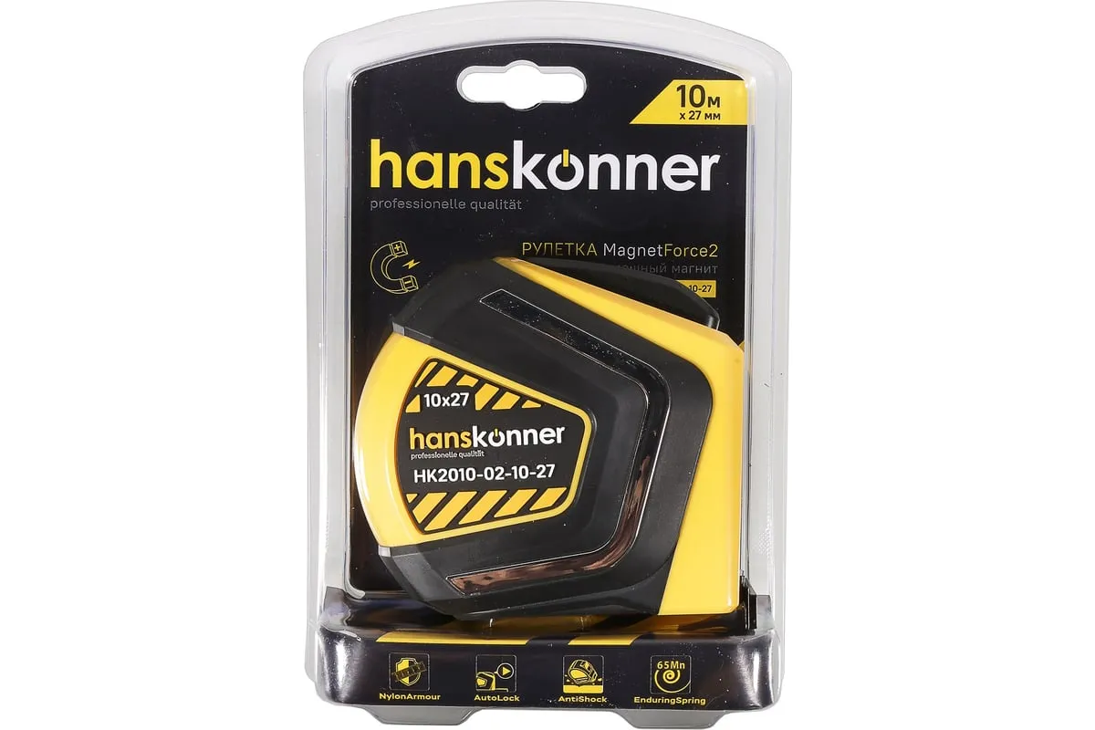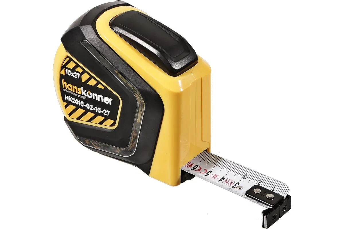 Рулетка Hanskonner 10x27 HK2010-02-10-27 оснащена полотном из хромванадиевой стали с увеличенной толщиной по сравнению с обычными рулетками. Это обеспечивает более дальний вылет без излома ленты. Предельная длина достигает 270 см. Пружина для сматывания полотна также изготовлена из CrV стали и увеличивает ресурс на количество сматываний в 2,5 раза. TPR покрытие корпуса из ударопрочного пластика обеспечивает надежное удержание инструмента в мокрых ладонях. Небольшой вес корпуса также способствует облегченному удержанию в течение продолжительного периода времени. Наличие двойного неодимового магнита позволяет удерживать груз массой до двух килограммов или соединять между собой до 20 метров ленты суммарно на двух рулетках. Для удобства транспортировки инструмент дополнительно оснащен металлическим зацепом.