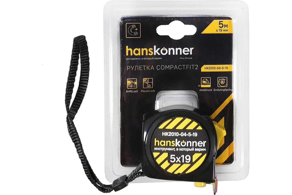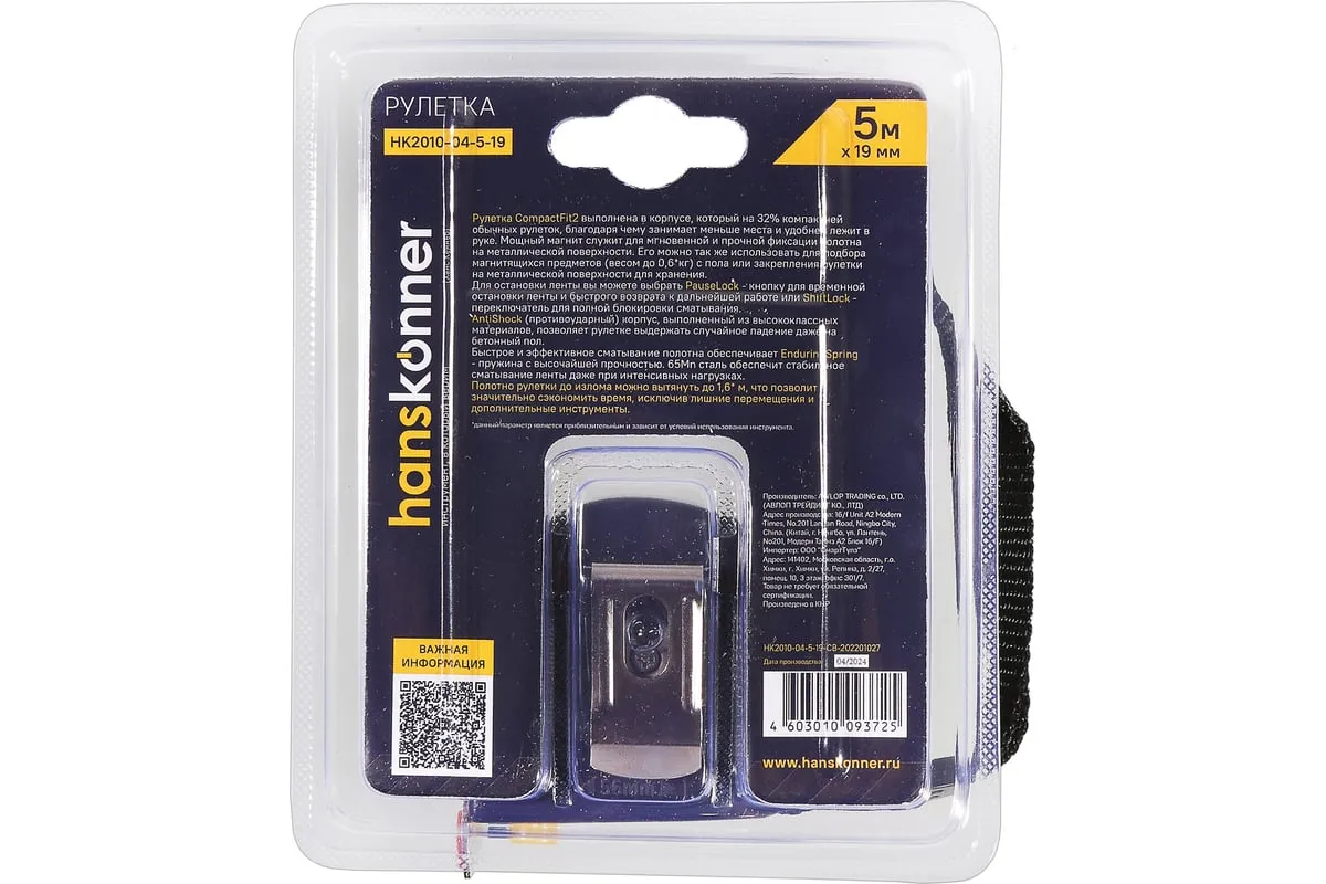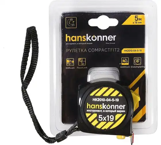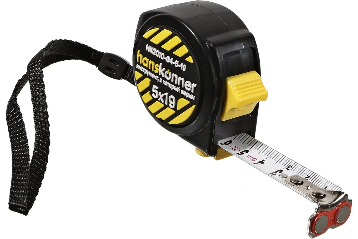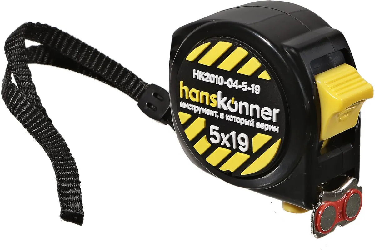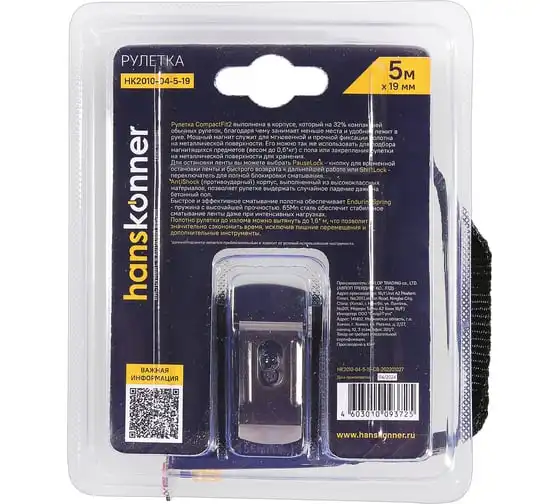 Рулетка Hanskonner 5x19 HK2010-04-5-19 используется для измерительных работ в промышленности и в быту. Корпус рулетки на 32% меньше стандартного, что обеспечивает удобное использование и хранение. Полотно изготовлено из 60C стали, что гарантирует более дальний вылет без излома и устойчивость к внешнему воздействию. Мощный магнит служит для мгновенной и прочной фиксации полотна на металлической поверхности. Также магнит можно использовать для подбора магнитящихся предметов весом до 0.8 кг с пола или закрепления рулетки на металлической поверхности для хранения. Пружина EnduringSpring с высочайшей прочностью, изготовленная из стали Мп65, обеспечивает стабильное сматывание ленты даже при интенсивных нагрузках. Полотно рулетки до излома можно вытянуть до 1.6 метров, что значительно сэкономит время, исключит лишние перемещения и привлечение дополнительных инструментов. Дополнительные характеристики: