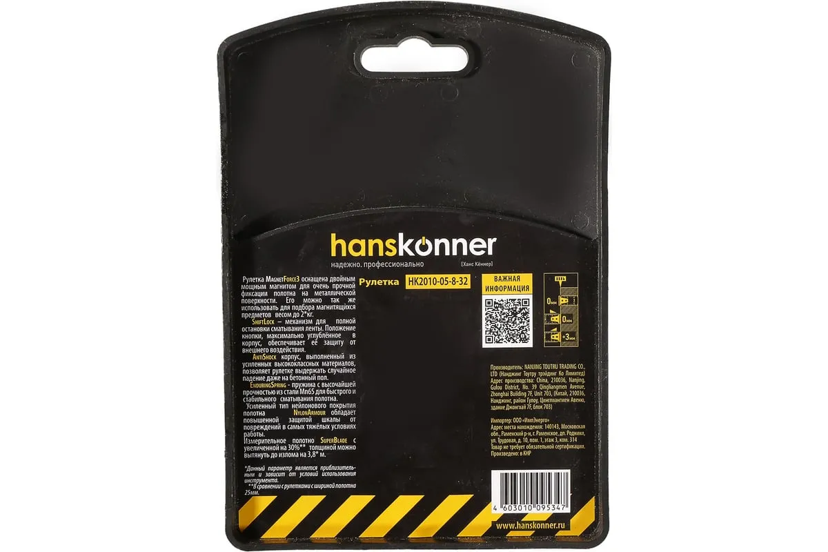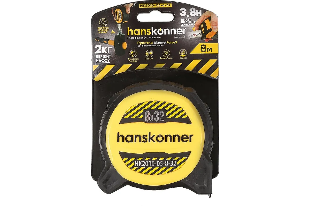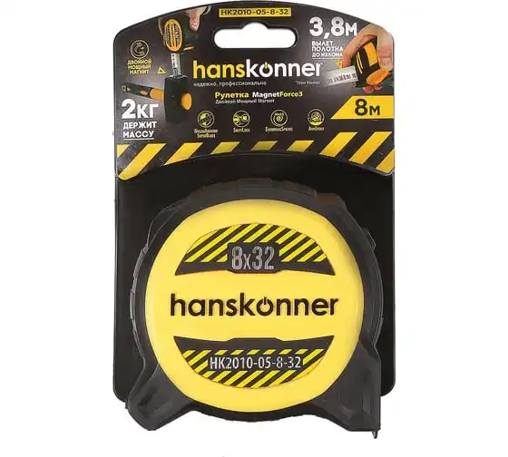 Рулетка Hanskonner 8x32 HK2010-05-8-32 используется для измерительных работ в промышленности и в быту. Полотно изготовлено из хром-ванадиевой стали, что гарантирует более дальний вылет без излома, устойчивость к внешнему воздействию и максимальную гибкость. Мощный двойной магнит служит для мгновенной и прочной фиксации полотна на металлической поверхности. Также магнит можно использовать для подбора магнитящихся предметов весом до 2 кг с пола или закрепления рулетки на металлической поверхности для хранения. Корпус изготовлен из прочного TPR-пластика производства ProFlex, который обладает высокой стойкостью к истиранию и усиленными амортизационными свойствами для защиты от внешнего воздействия. Пружина EnduringSpring с высочайшей прочностью, изготовленная из стали Мп65, обеспечивает стабильное сматывание ленты даже при интенсивных нагрузках. Полотно рулетки до излома можно вытянуть до 3.8 метров, что значительно сэкономит время, исключит лишние перемещения и привлечение дополнительных инструментов. Дополнительные характеристики:
