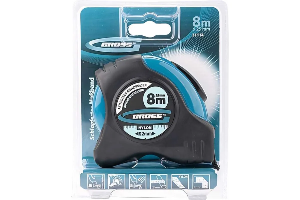 Рулетка благодаря обрезиненному корпусу удобна в использовании, не выскальзывает из руки и при падении защищена от повреждений. Зацеп задерживается на предмете любой формы и с любой поверхностью. Нейлоновое покрытие на полотне обеспечивает стойкость к износу и стиранию.