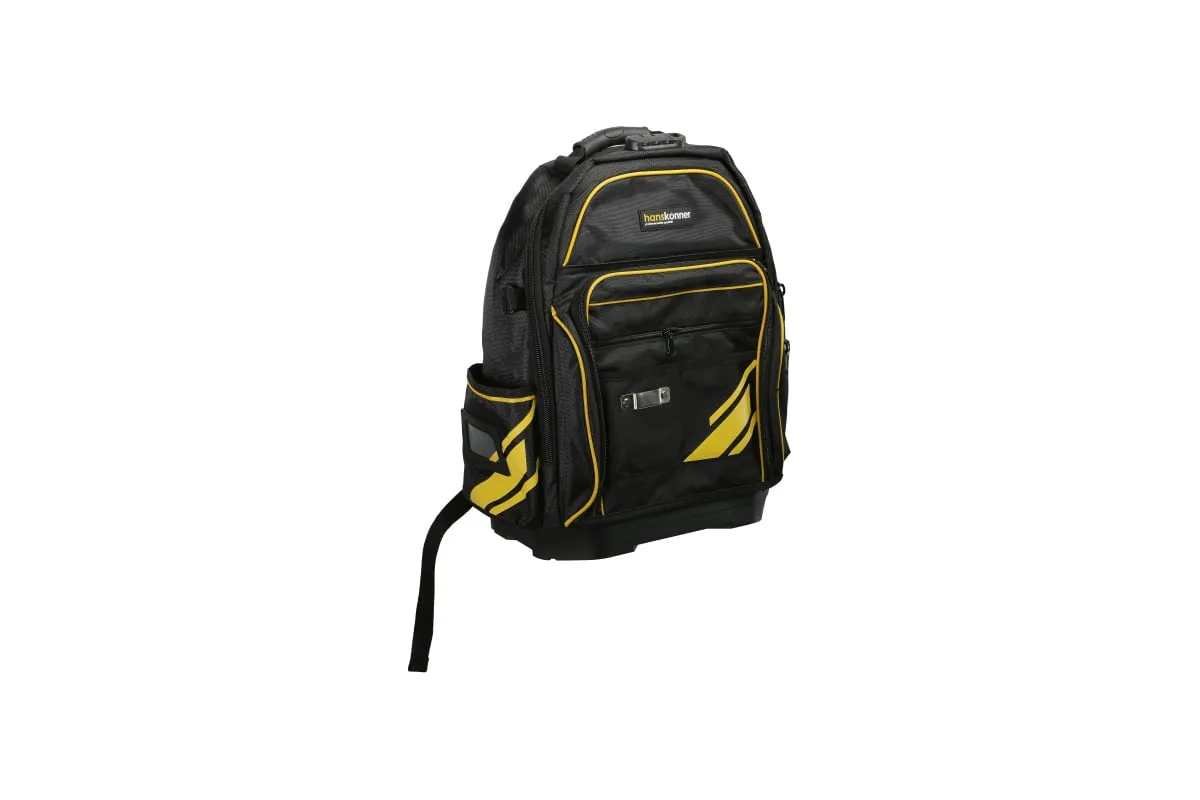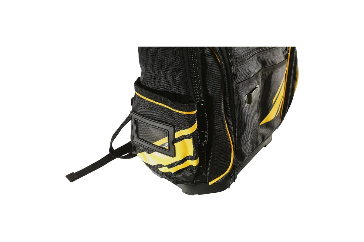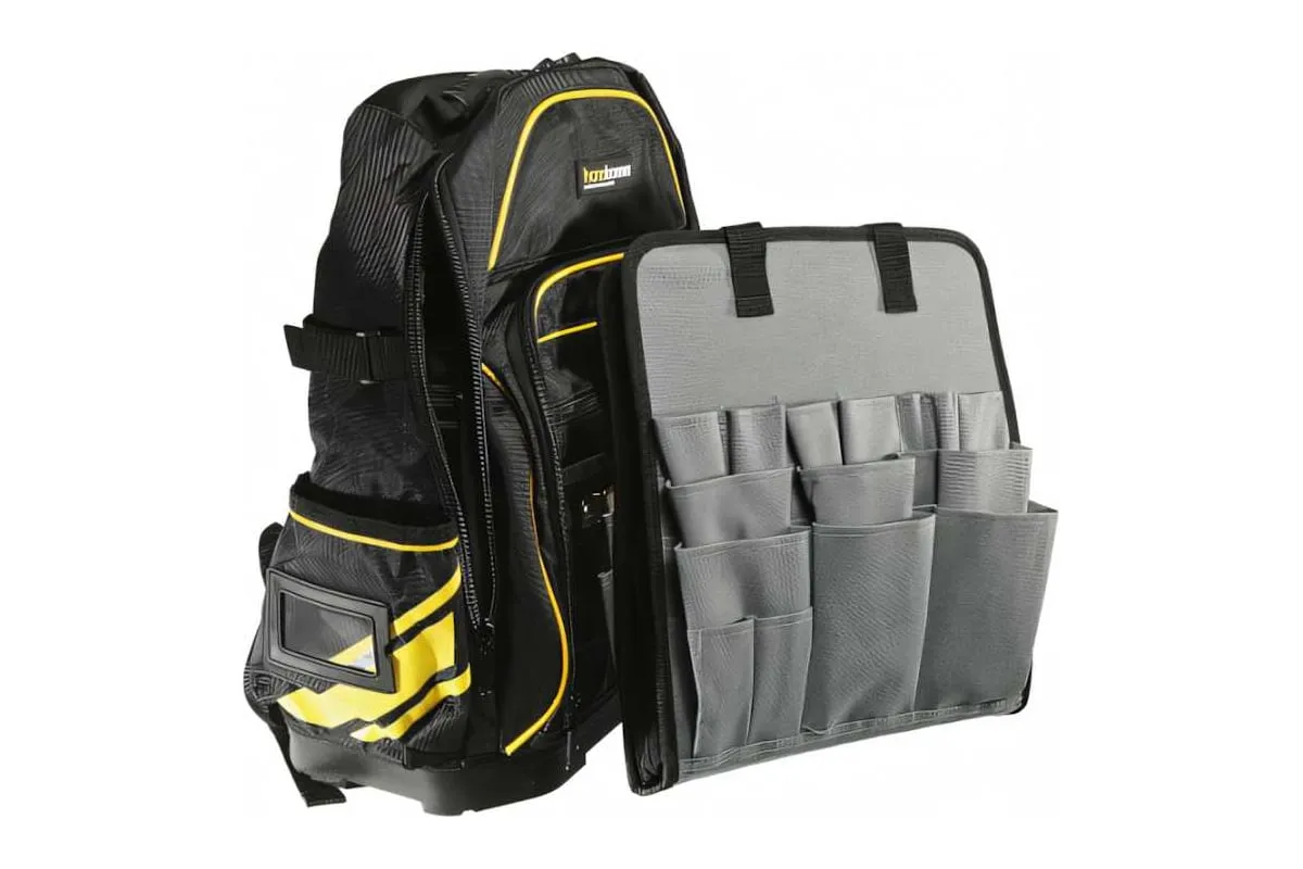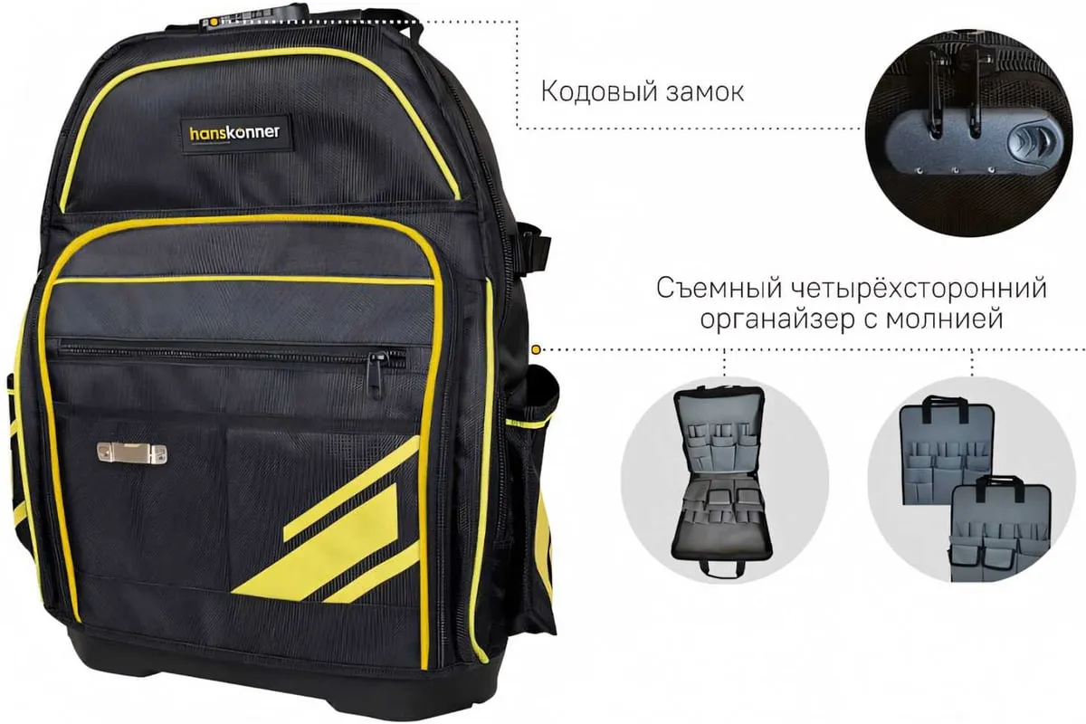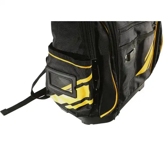Рюкзак оснащён кодовым замком для безопасного хранения инструмента внутри. 100% полиэстер выдерживает нагрузку в 30 кг, устойчив к растяжению и стиранию. Быстрая широкая молния позволяет мгновенно открыть рюкзак и получить доступ к инструменту. Съёмный органайзер во внутреннем отделе сумки помогает зонировать пространство для инструмента, а так же сам снабжен карманами. Возможность его извлечения позволяет полностью контролировать эргономику хранения инструмента. Дополнительные вставки в стенки и дно рюкзака позволяют ему лучше держать эргономичную форму при переноске инструментов. Удобная скоба для хранения рулетки обеспечивает быстрый доступ к ней. Сетчатая система вентиляции спинки рюкзака и текстурный рисунок контролируют отвод нагретого и насыщенного влагой воздуха. Этим предотвращается перегрев спины пользователя при переноске инструмента.