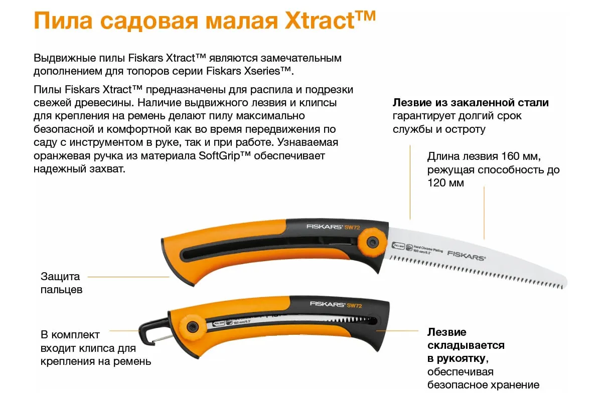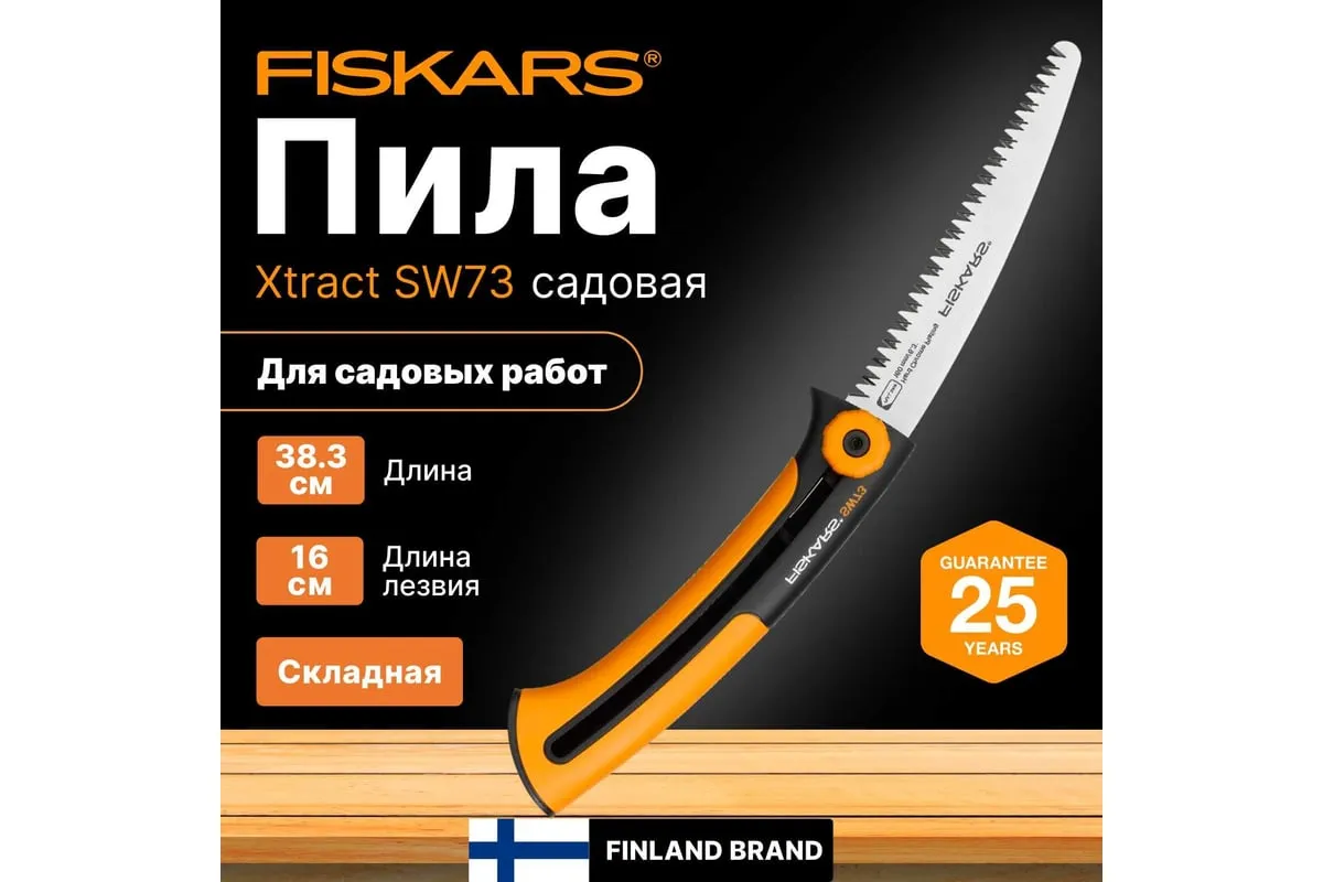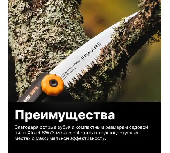 Садовая пила Fiskars Xtract SW 73 1000613 (123870) идеальна как для различных плотницких работ, так и для работ в саду. Она одинаково хорошо справляется с распилом досок и реек, а также с сучьями и ветками в саду. Удобная, приятная на ощупь рукоять из полиамида исключает возможность получения травмы во время работы. Складная конструкция существенно продлевает срок службы лезвия, ведь внутри рукояти ему просто не обо что затупиться. Малый размер и вес делают пилу нетребовательной к хранению и транспортировке.