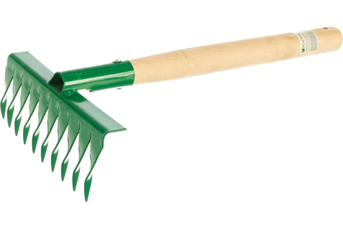Садовые грабельки РОСТОК 10 витых зубцов, 200x62x405 мм 39614 просты и надежны в эксплуатации. Рабочая часть выполнена из стали с защитным покрытием, что обеспечиваетдолгий срок службы. Деревянная рукоятьудобно лежит в руке.