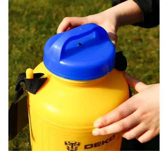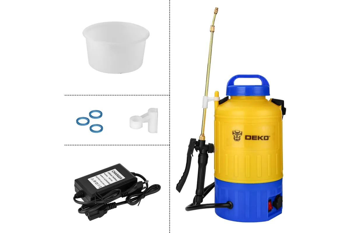 Опрыскиватель садовый аккумуляторный DEKO DKSP09 используется для распыления воды и удобрений, дезинфекции, дезинсекции, мытья окон, машин и стен, защиты растений от вредителей. Оснащен аккумулятором 12В и сетевым адаптером, который обеспечивает быструю зарядку. Регулируемый ремень обеспечивают удобство перемещения опрыскивателя.