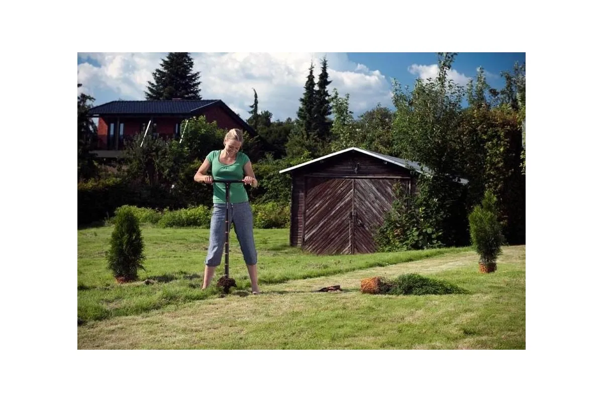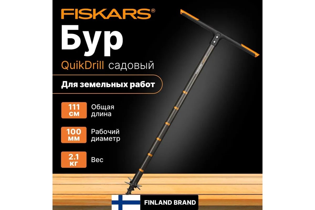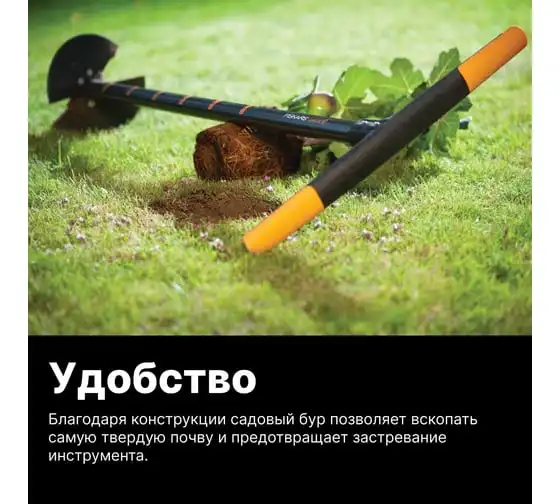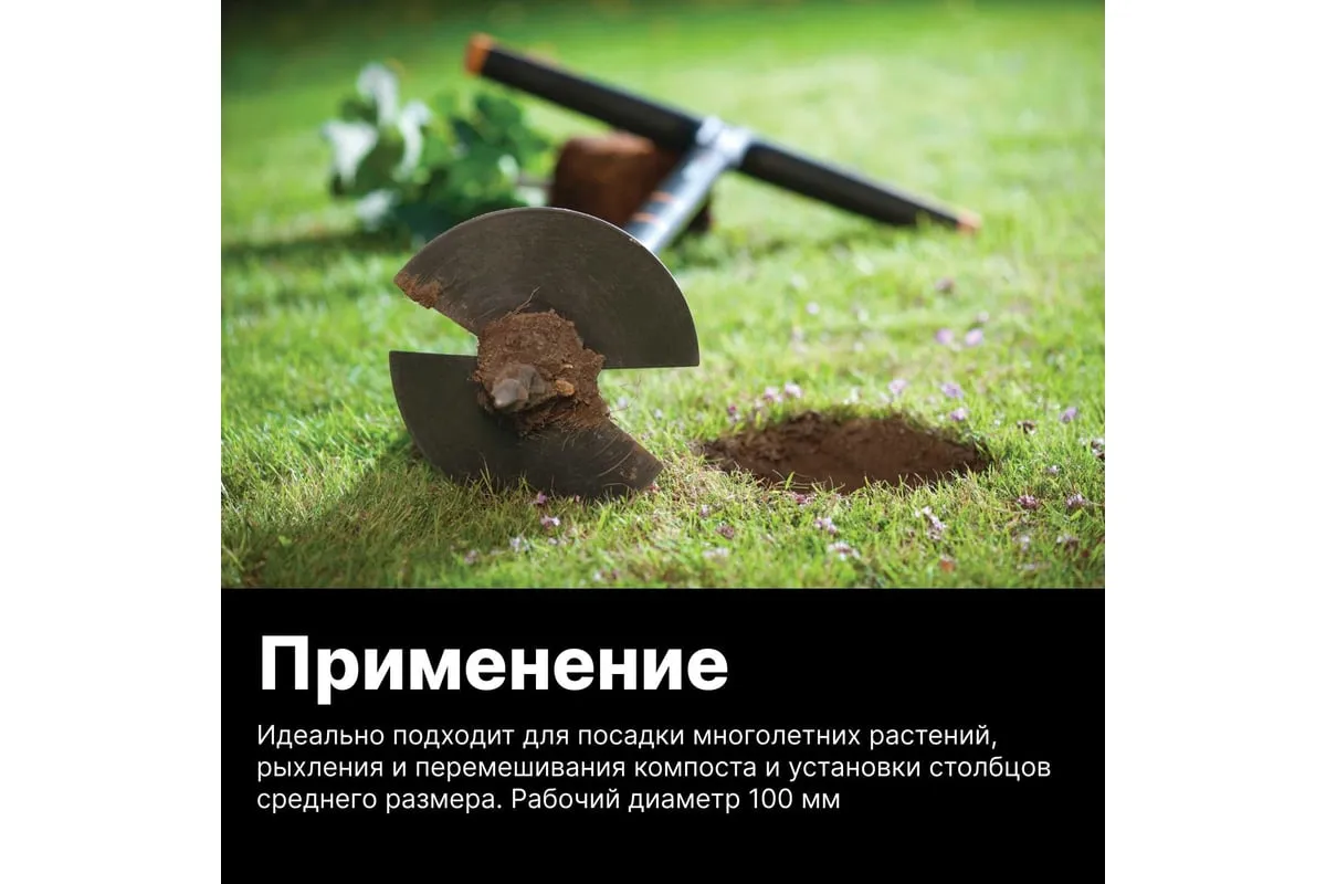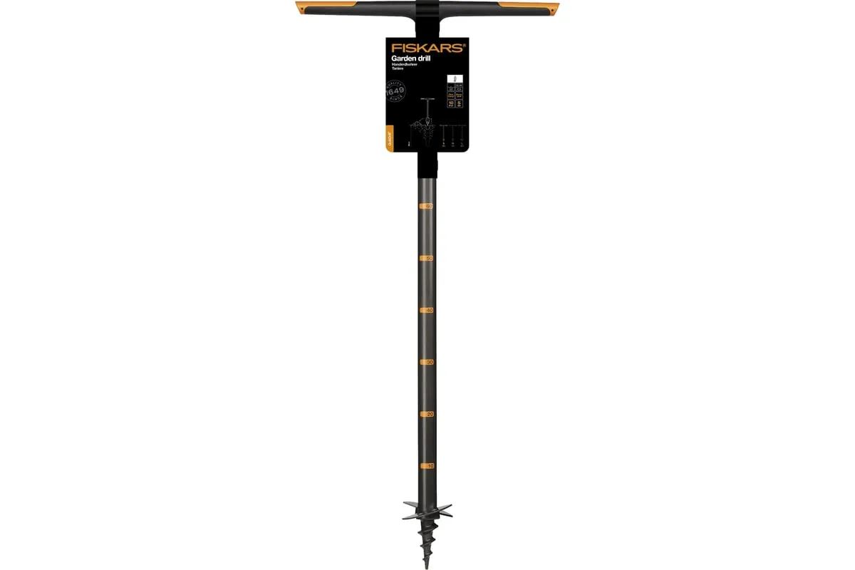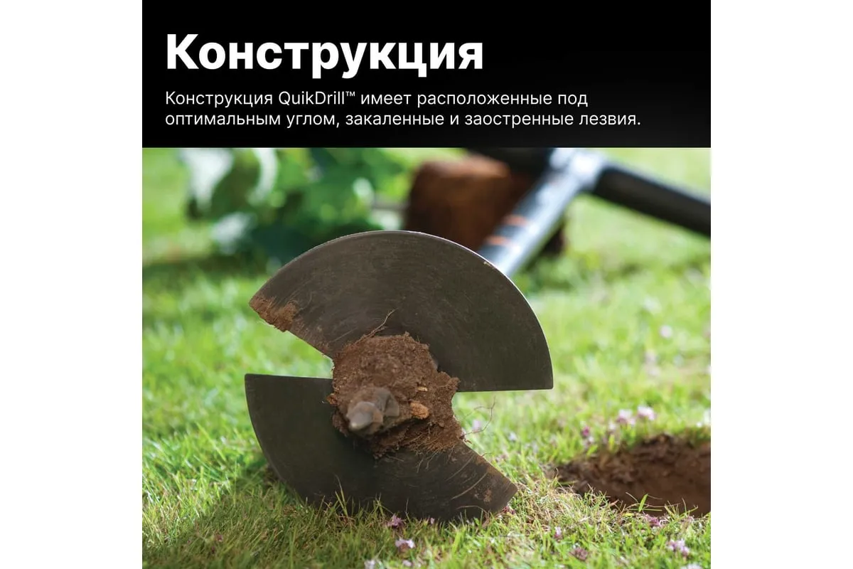 Садовый бур Fiskars QuikDrill 134710/1000636 используется для бурения скважин. Ножи особого профиля имеют заточенную режущую кромку, что позволяет бурить почву без особых усилий. Длинная ручка увеличивает рычаг вращения, заметно снижая энергоемкость работы. Рукоятка из специального материала выдерживает существенные нагрузки. Винтовое крепление лезвий к черенку позволяет быстро и легко производить замену лезвий.