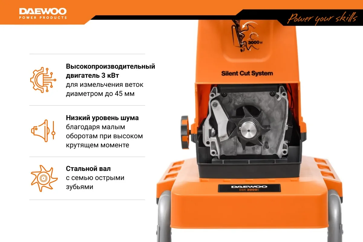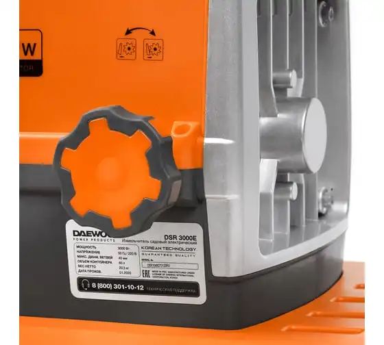 Садовый электрический измельчитель DAEWOO DSR 3000E подходит для растительных отходов: веток, листьев, цветов, травы и т.д. Благодаря работе от электросети отсутствует выброс вредных веществ в атмосферу.