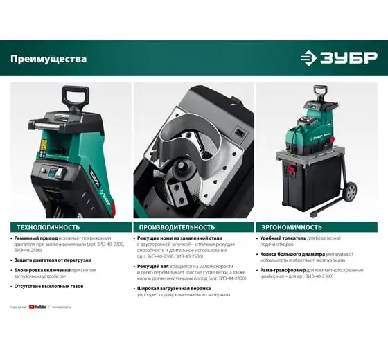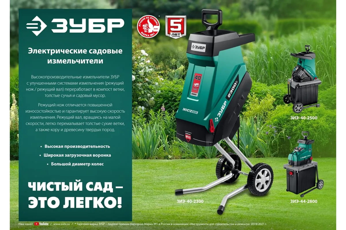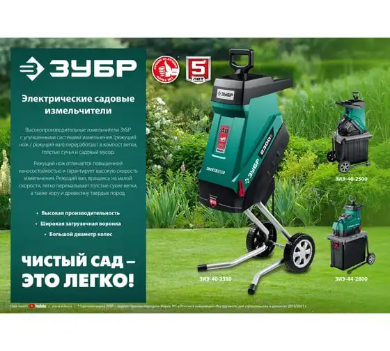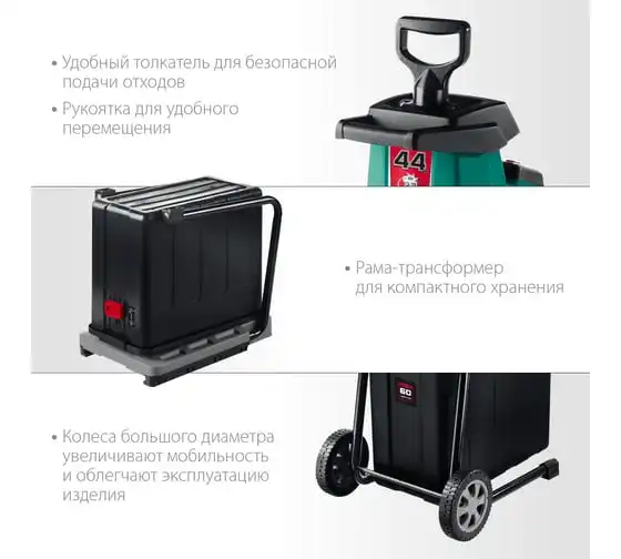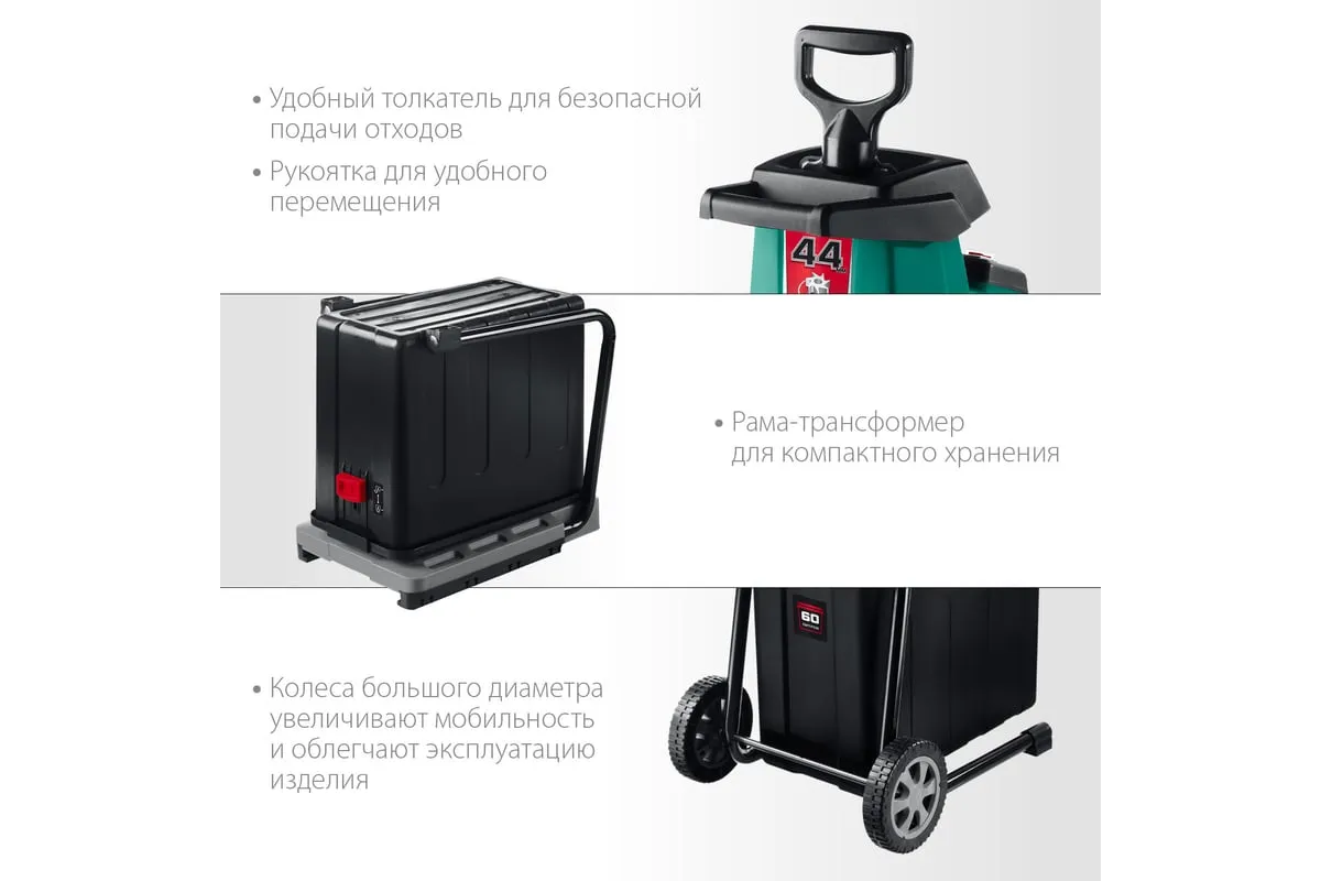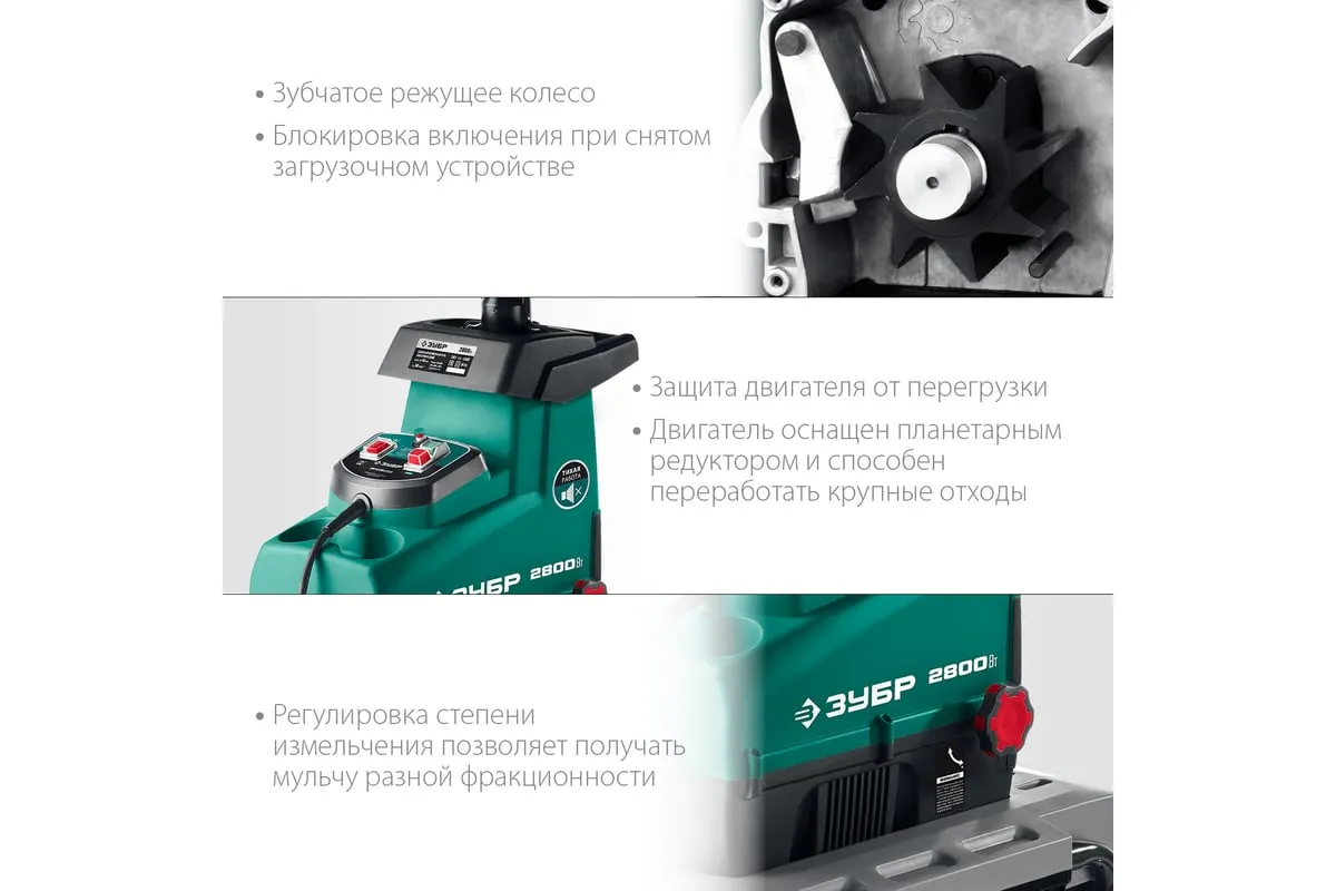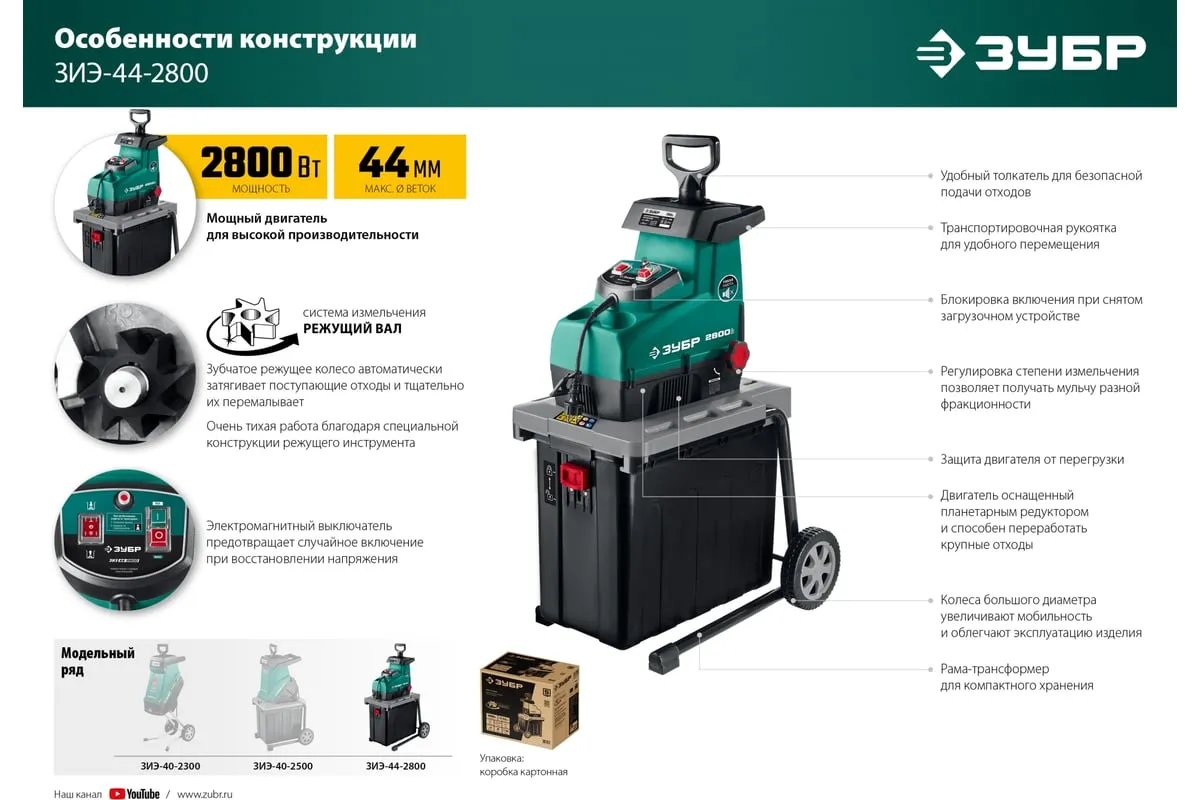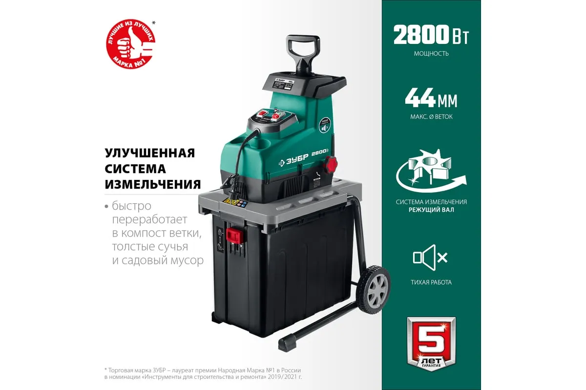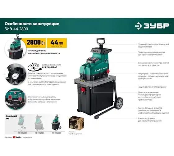 Садовый электрический измельчитель Зубр ЗИЭ-44-2800 используется для переработки травы и веток диаметром до 44 мм. Отличается высокой производительностью, малошумностью и удобством эксплуатации. Двигатель агрегата защищен от перегрева, что повышает срок службы. Контейнер вмещает до 60 литров отходов. Измельчитель оснащен колесами, что обеспечивает легкость перемещения по участку.