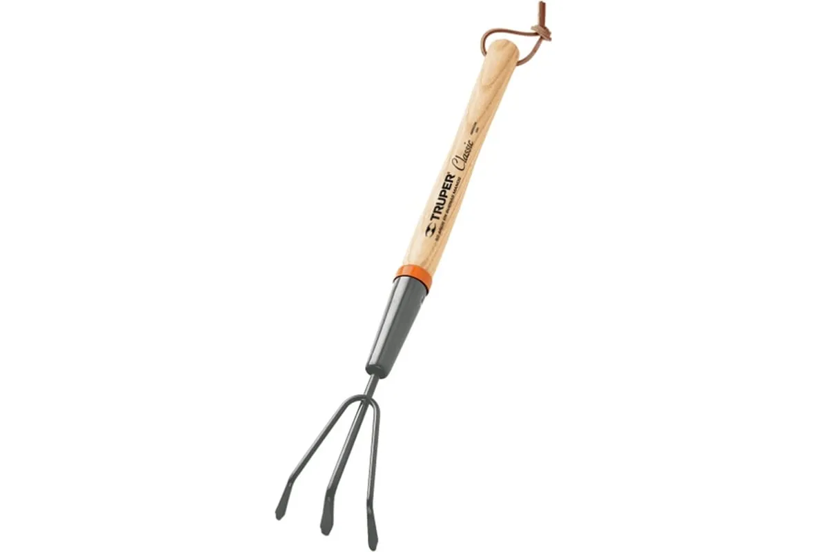 Садовый культиватор Truper GTL-CV 15036 используется для ручной аэрации почвы на грядках и клумбах. Инструмент прост и удобен в работе. Он состоит из металлической рабочей части с тремя зубцами и деревянной ручки, которая надежно закреплена в манжете.