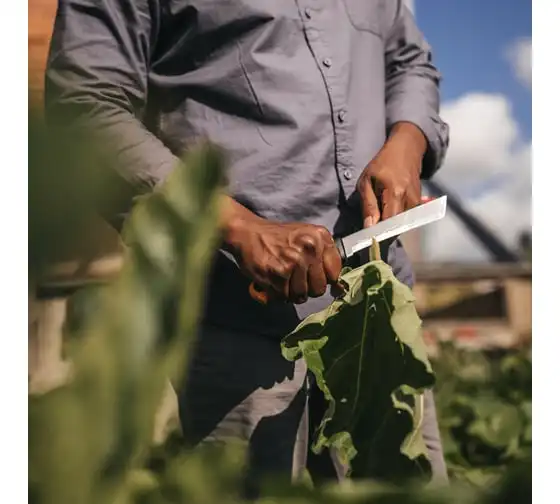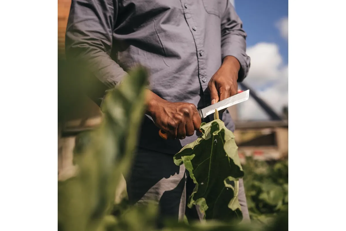 Лезвие из нержавеющей стали с прецизионной заточкой имеет плоский наконечник для быстрой резки и зубчатую часть для разрезания волокнистых стеблей.