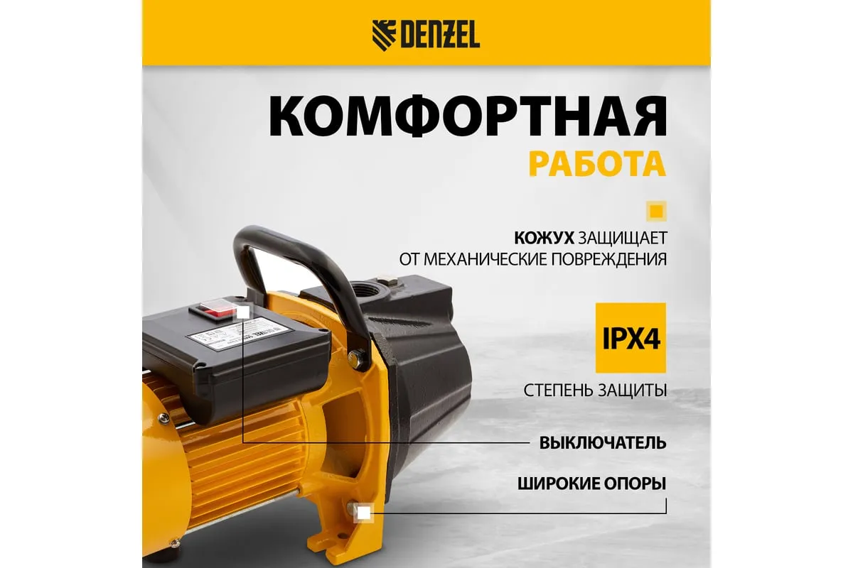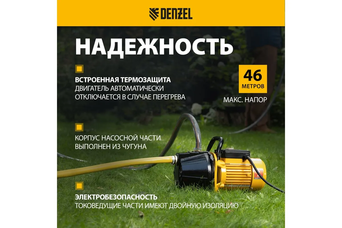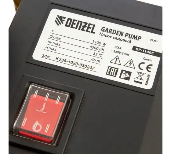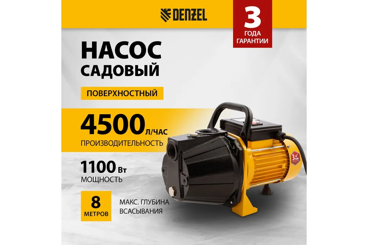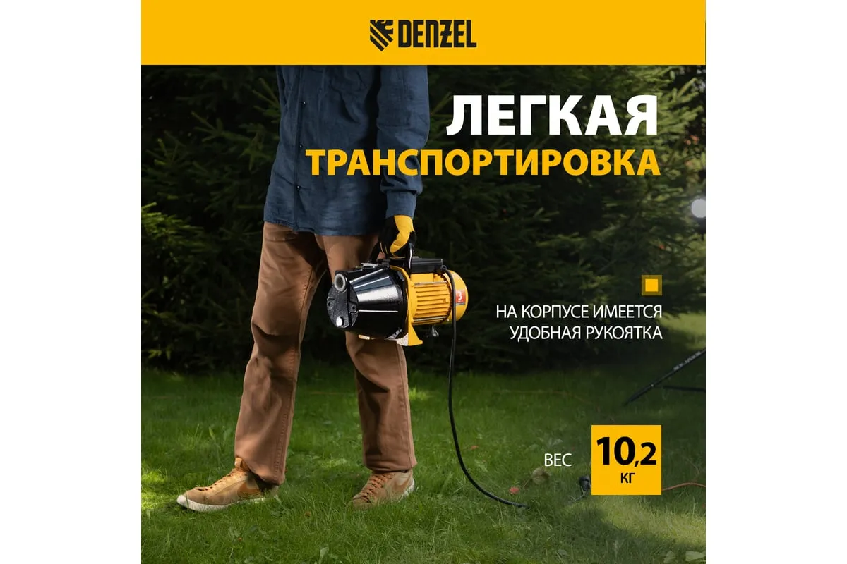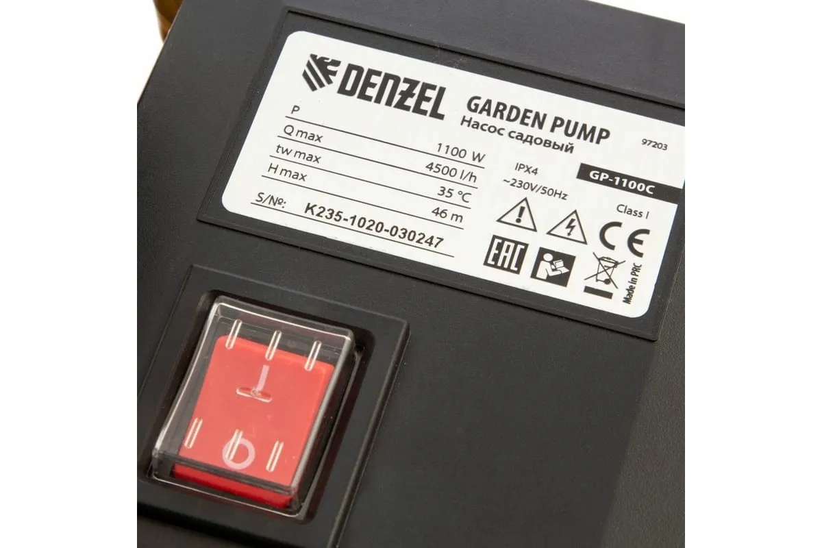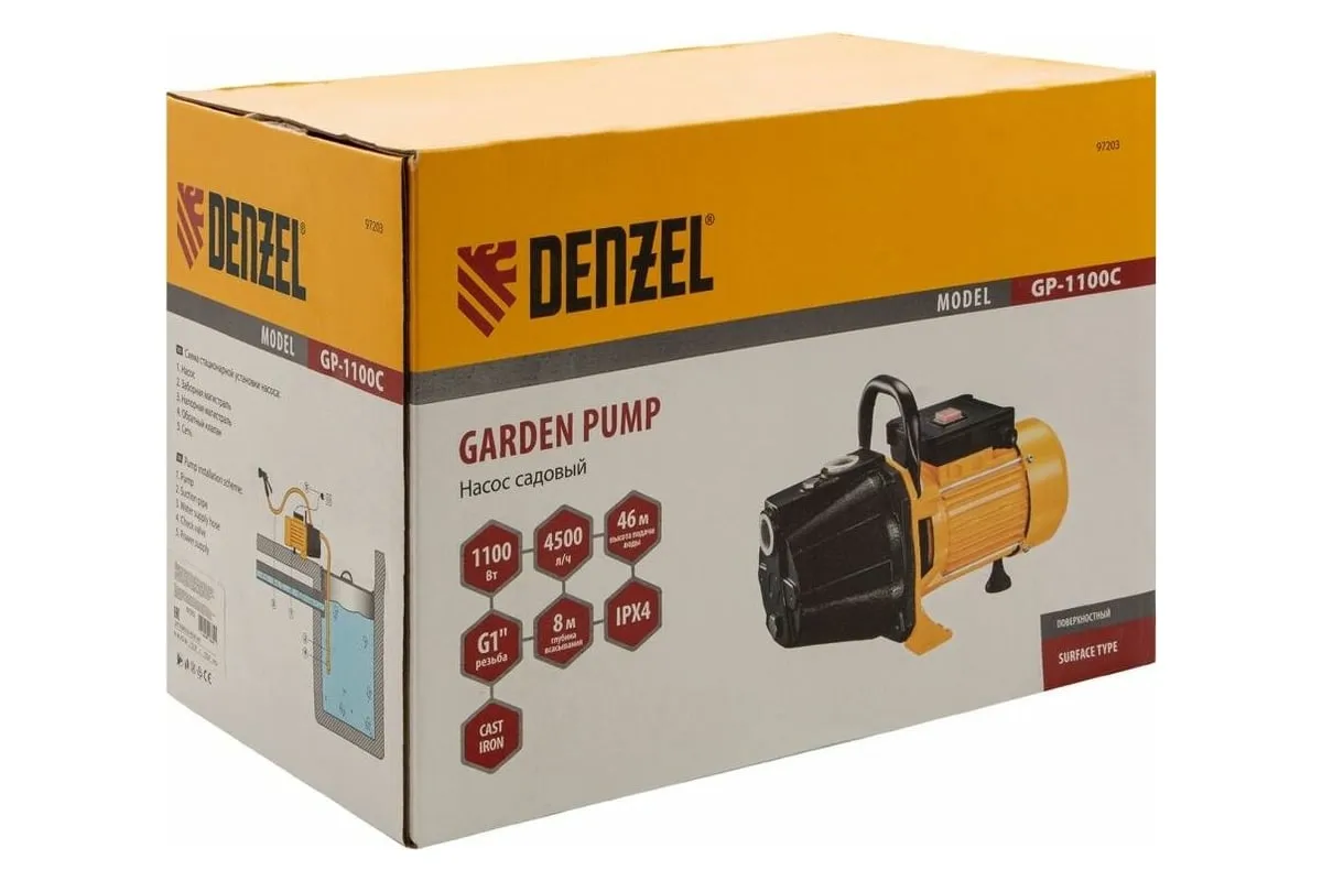 Садовый поверхностный насос DENZEL GP1100C 97203 перекачивает чистые жидкости из колодцев, резервуаров и открытых водоёмов.