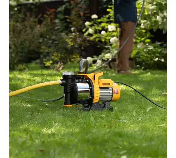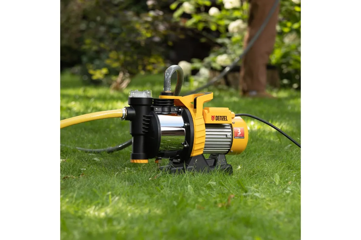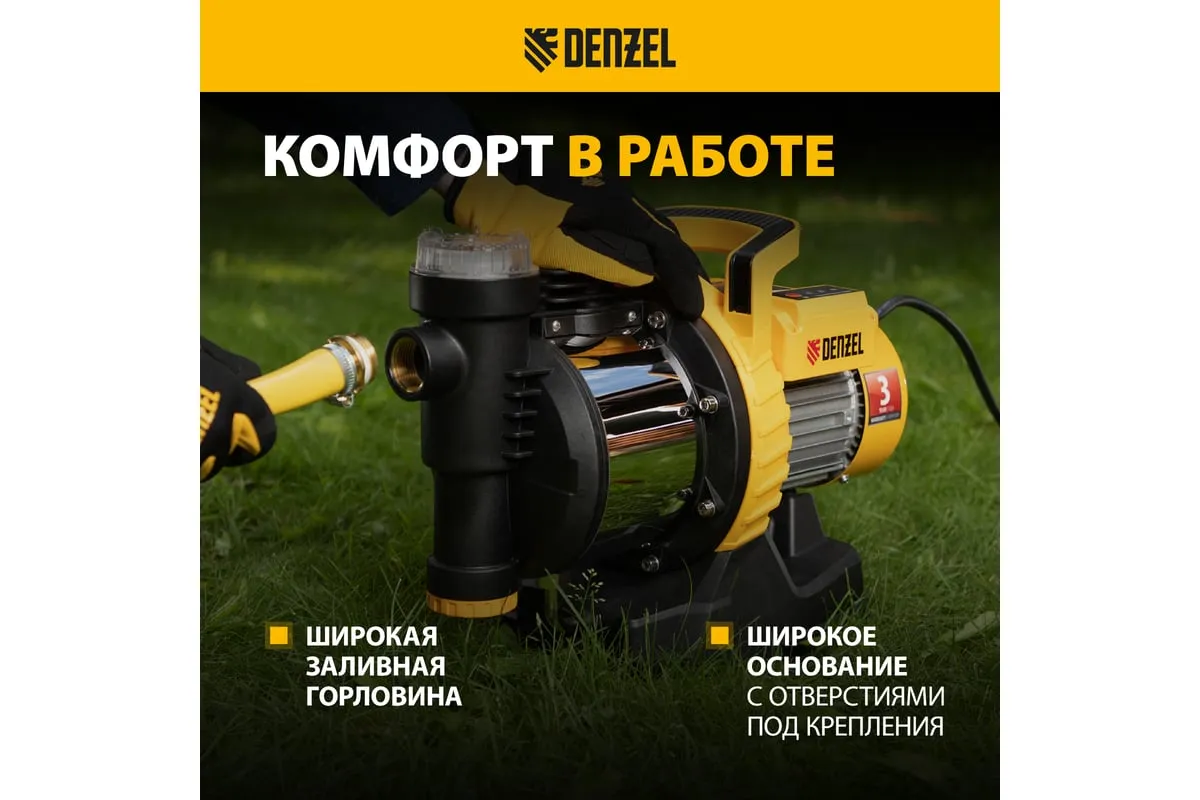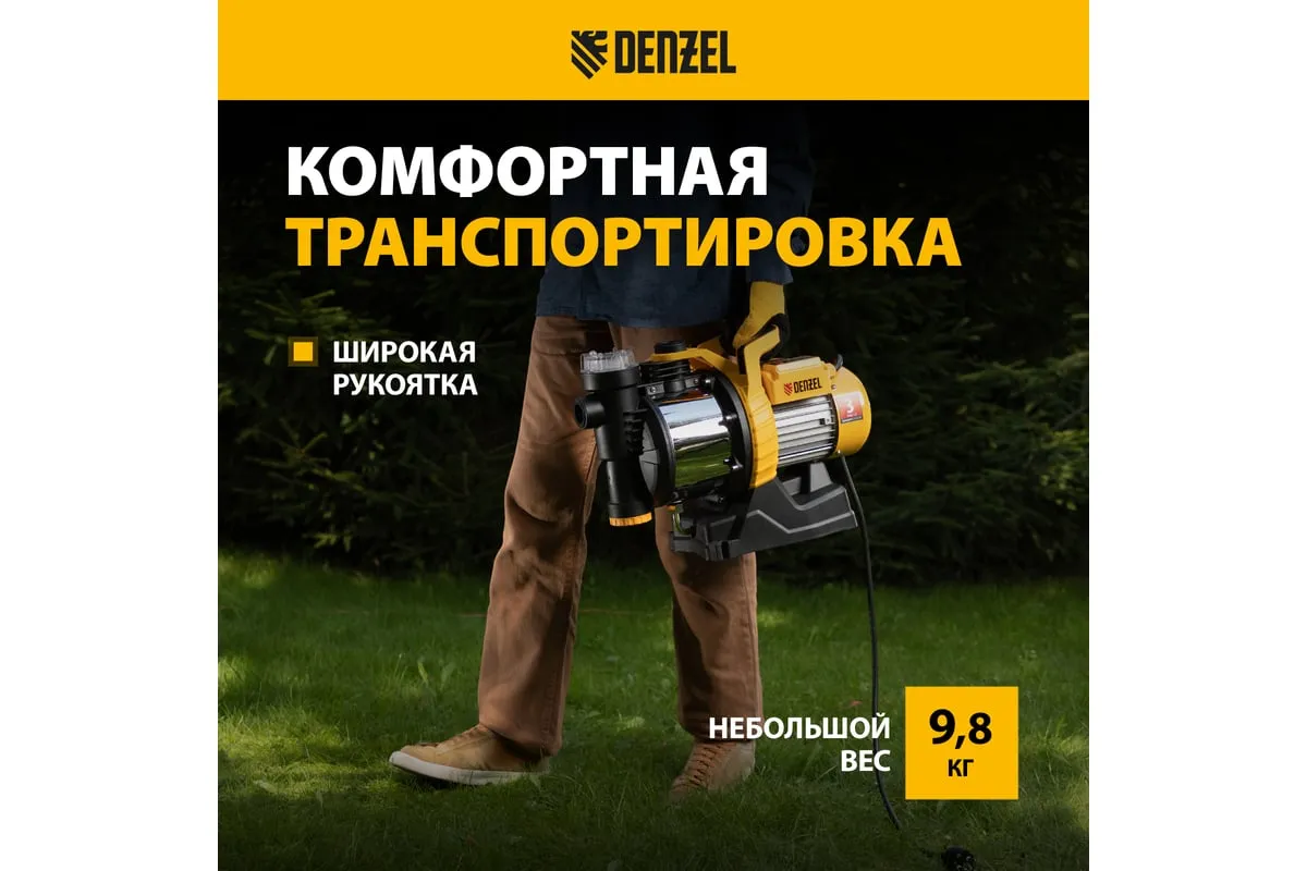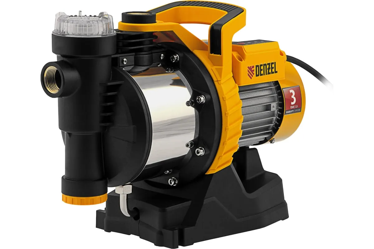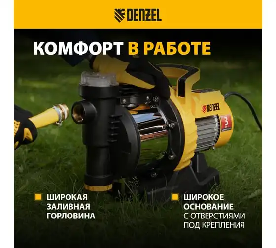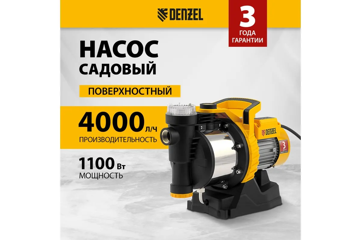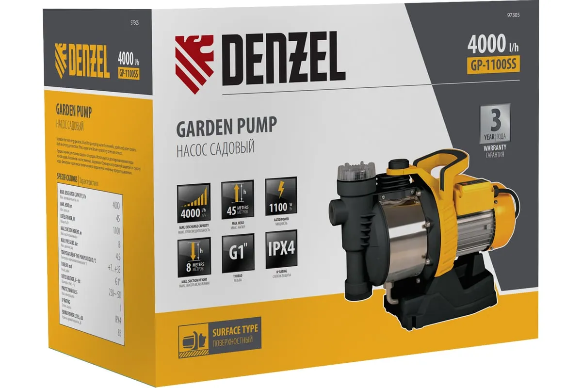 Садовый поверхностный насос Denzel GP1100SS 97305 используется для забора чистой воды из колодцев, емкостей и водоемов, а также для организации системы полива и водоснабжения на даче.