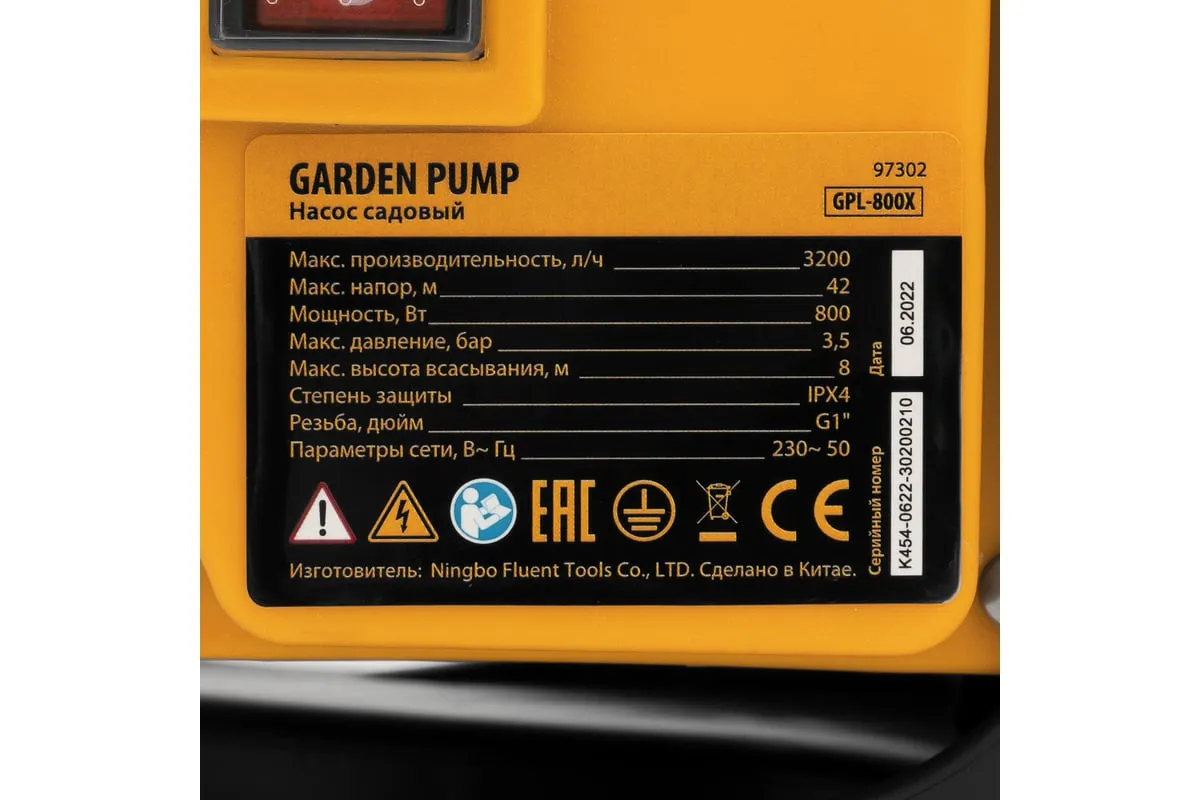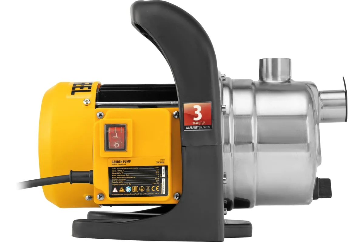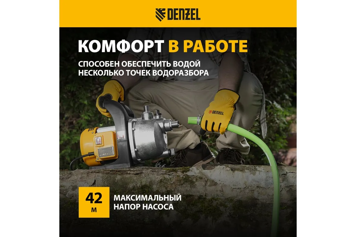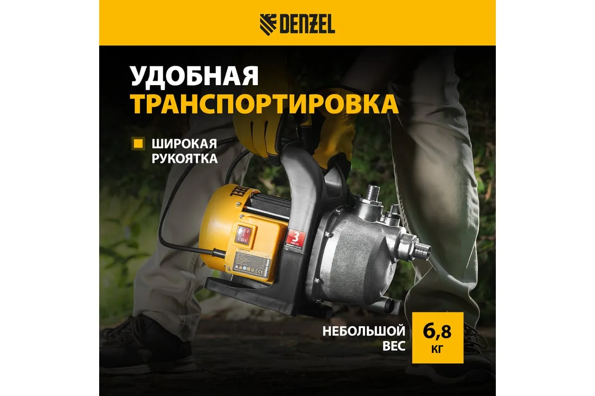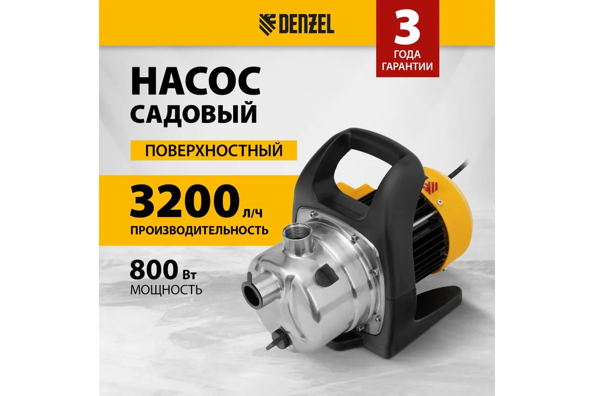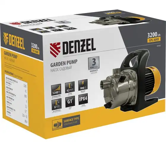 Садовый поверхностный насос Denzel gpl800х 97302 предназначен для забора чистой воды из колодцев, водоемов, различных резервуаров, и подъема ее на высоту до 42 м. Используется для проведения поливочных работ или организации системы водоснабжения в загородном доме. Способен обеспечить водой несколько точек водоразбора.