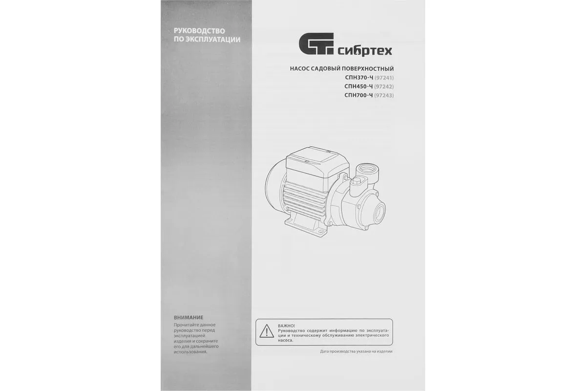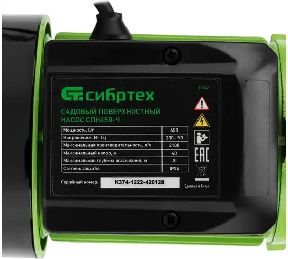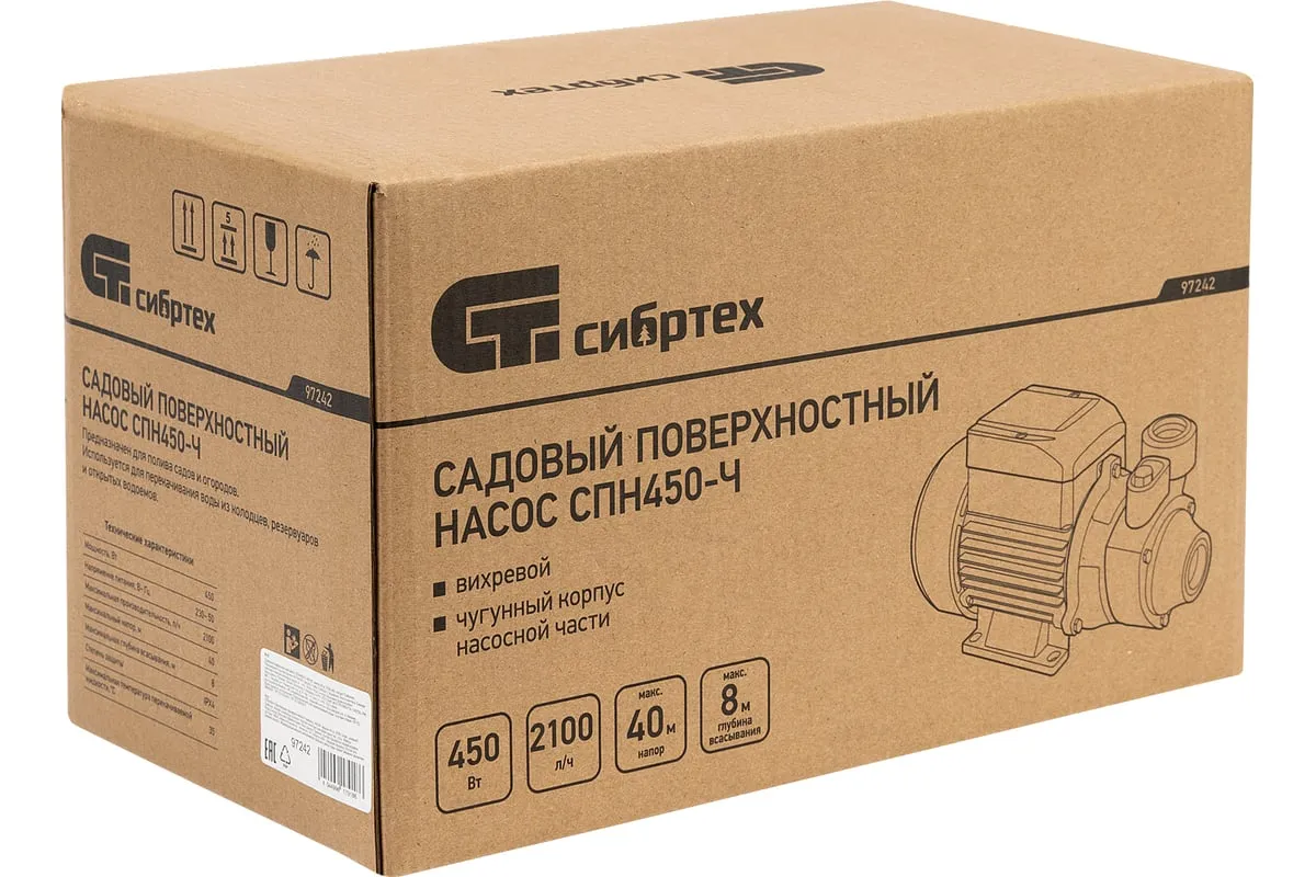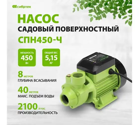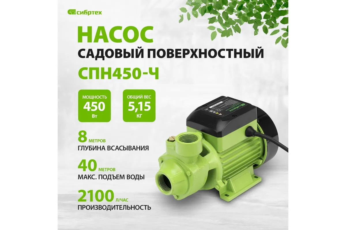 Садовый поверхностный насос СИБРТЕХ СПН450-Ч 97242 применяется для полива садов, огородов, земельных участков и т.д. Возможен забор воды из колодцев, водоемов и других накопительных емкостей. Корпус выполнен из чугуна,устойчивого к коррозии и механическим повреждениям. Имеетустойчивые ножки, что обеспечивает надёжную установку во время работы.