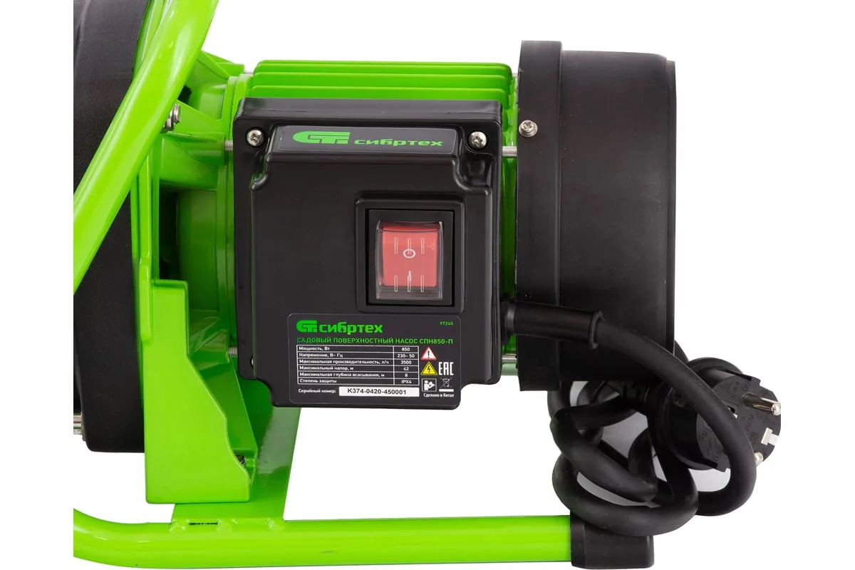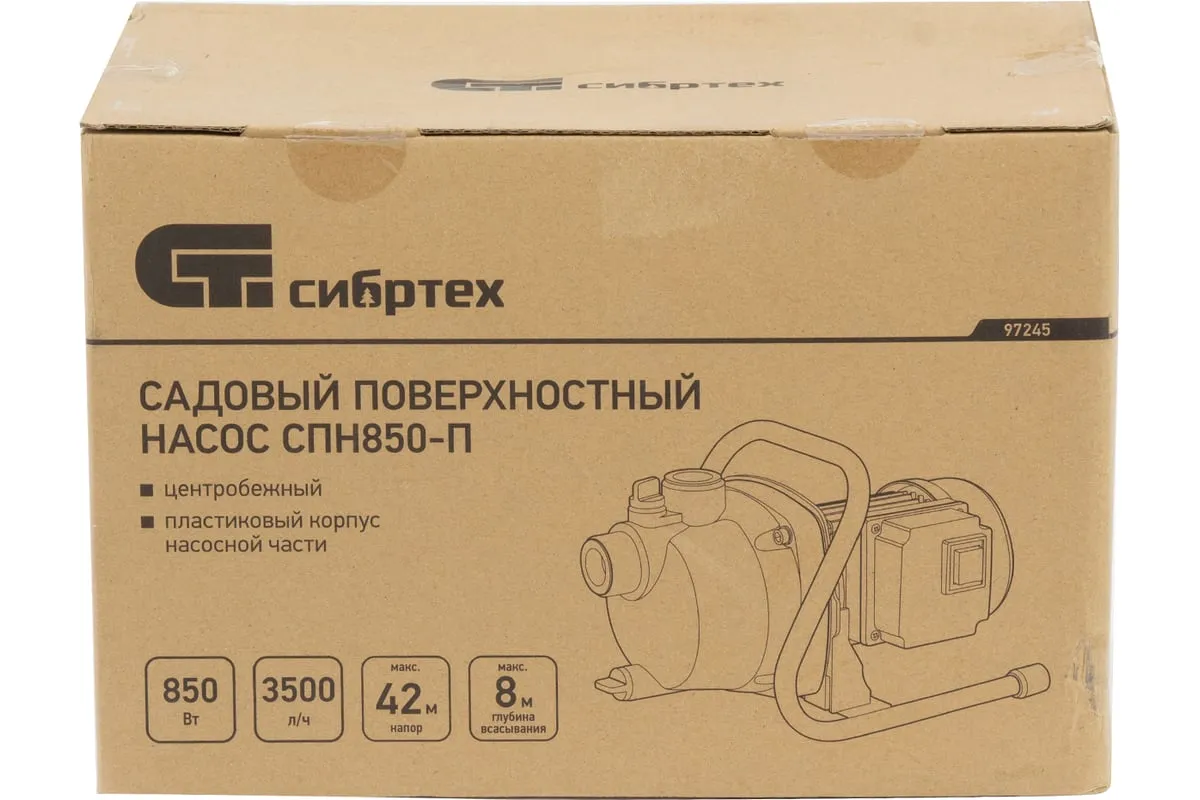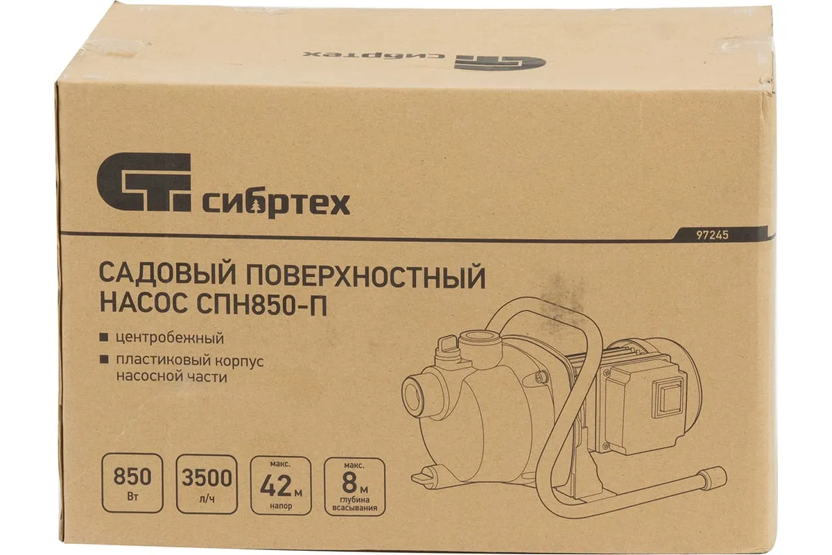 Садовый поверхностный насос СИБРТЕХ СПН850-П 97245 применяется для водоснабжения жилых помещений и полива различных территорий. Забор воды возможен из колодцев, водоемов и резервуаров. Корпус из пластика. Малый вес конструкции - повышенная мобильность. Двигатель мощностью 850 Вт способствует подъему воды с глубины 8 метров.