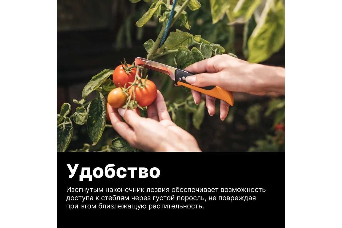 Лезвие из нержавеющей стали с прецизионной заточкой имеет изогнутый наконечник, что обеспечивает легкий доступ к стеблям через густой поросль, не повреждая при этом близлежащую растительность.