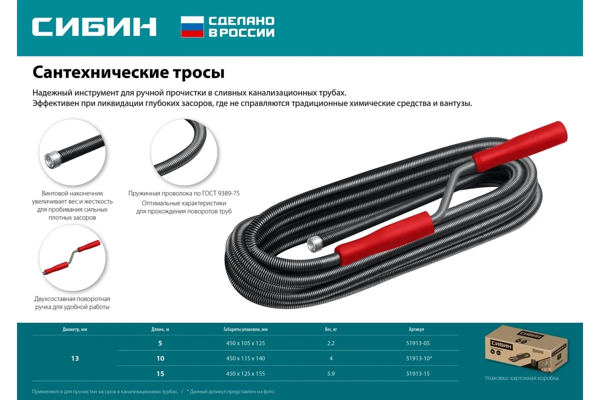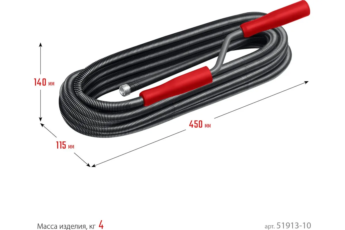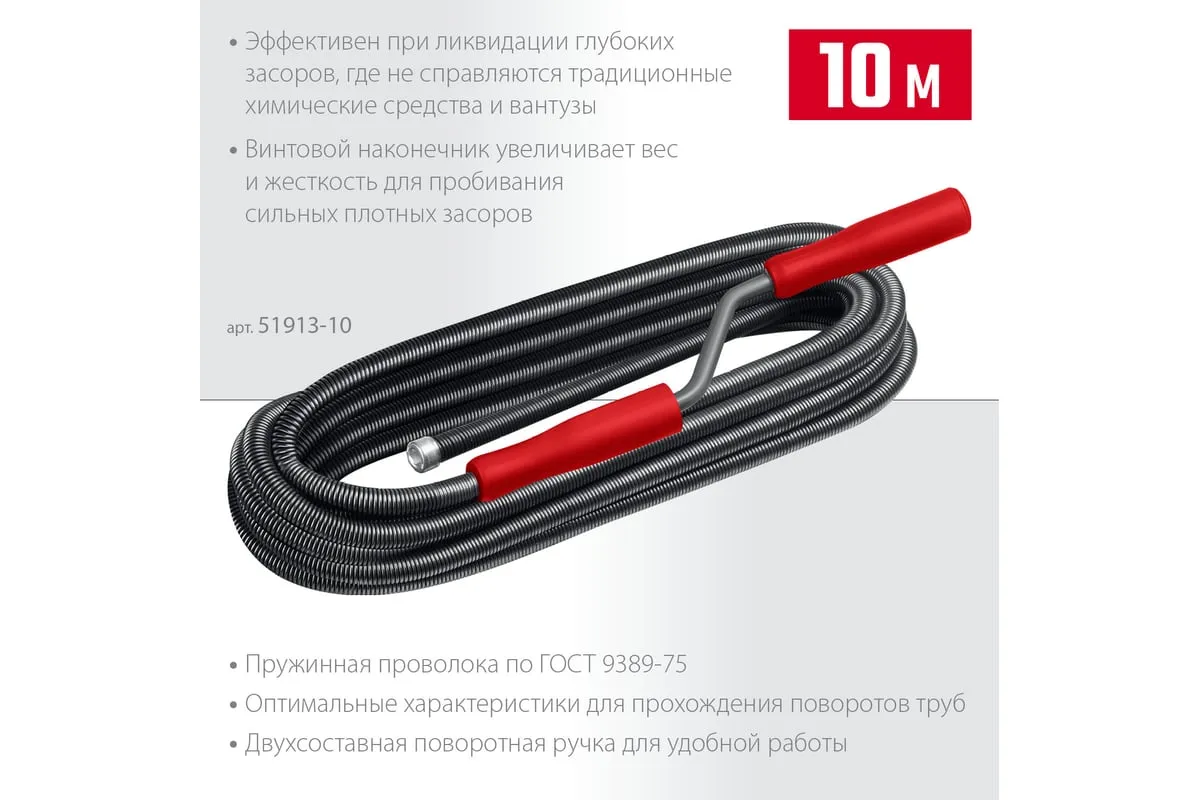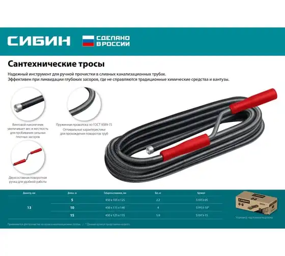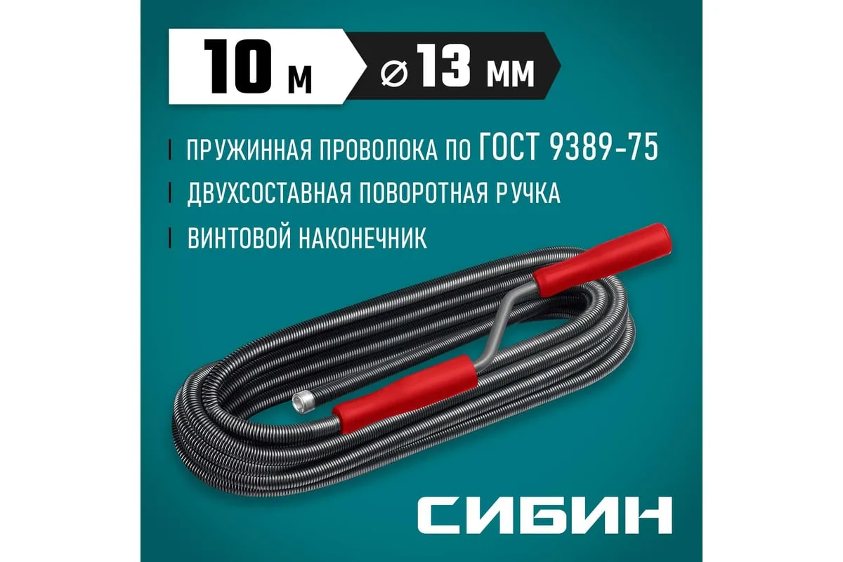 Сантехнический трос 10 м, d 13 мм СИБИН 51913-10 предназначен для ручной прочистки в сливных канализационных трубах. Эффективен при ликвидации глубоких засоров, где не справляются традиционные химические средства и вантузы.