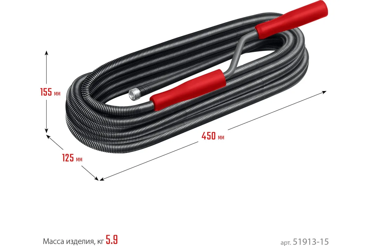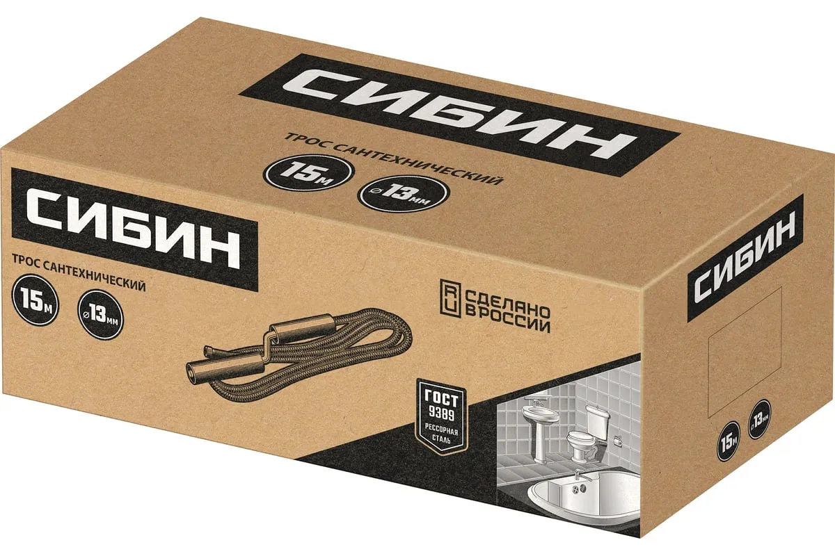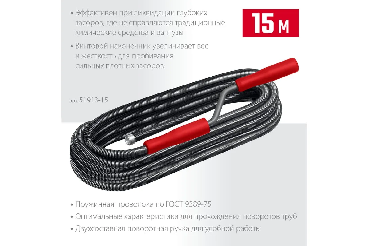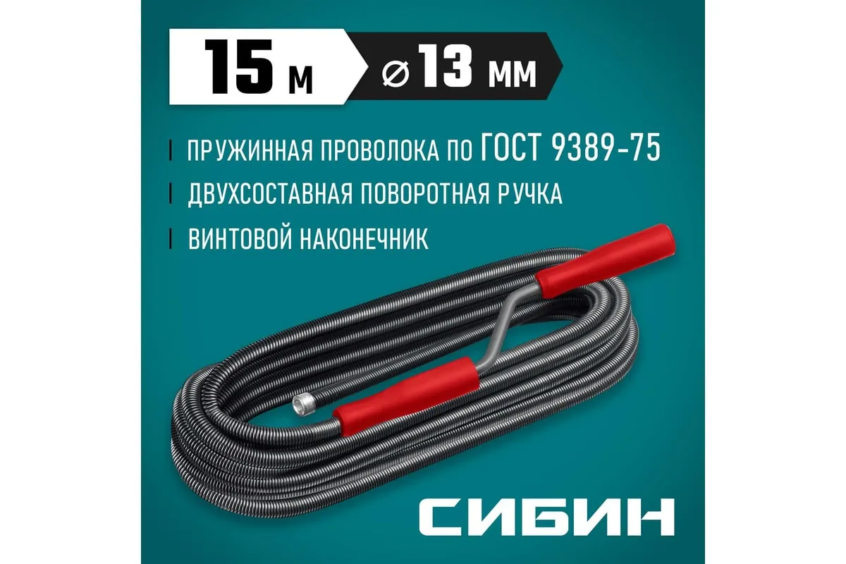 Сантехнический трос 15 м, d 13 мм СИБИН 51913-15 предназначен для ручной прочистки в сливных канализационных трубах. Эффективен при ликвидации глубоких засоров, где не справляются традиционные химические средства и вантузы.