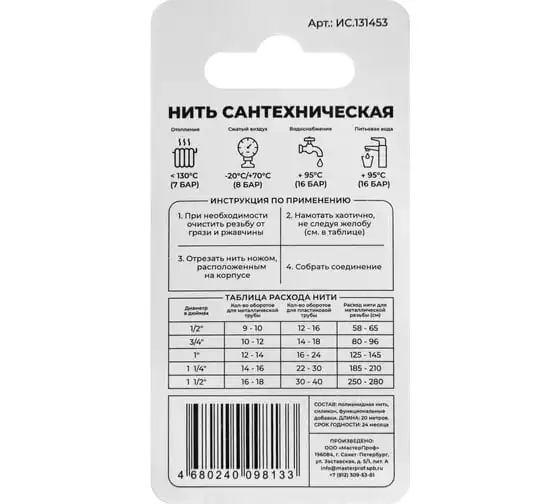 Нить сантехническая уплотнительная для резьбовых соединений 20м MPF ИС.131453