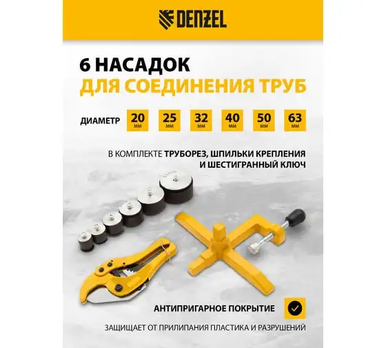 Аппарат для сварки пластиковых труб Denzel DWP-1500 1500Вт, 260-300 град. компл насадок, 20-63 мм 94205