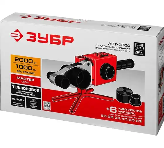 Сварочный аппарат для полипропиленовых труб, 1000/2000Вт, 50-300С, насадки 20, 25, 32, 40 , 50, 63мм, металлический кейс, 220В ЗУБР МАСТЕР АСТ-2000