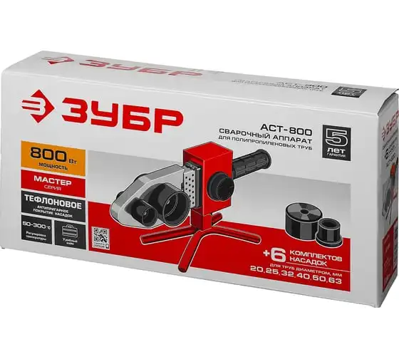 Сварочный аппарат для полипропиленовых труб, 800Вт, 50-300С, насадки 20, 25, 32, 40 , 50, 63мм, металлический кейс, 220В ЗУБР МАСТЕР АСТ-800