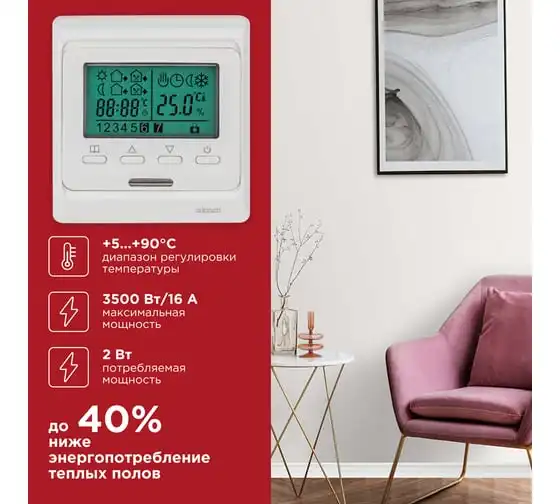 Терморегулятор для теплого пола IQWATT CLIMATIQ PT с ЖК-дисплеем и функциями программирования, белый 20665