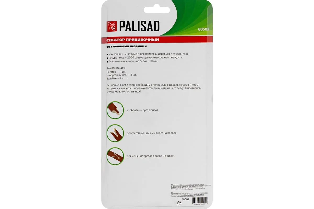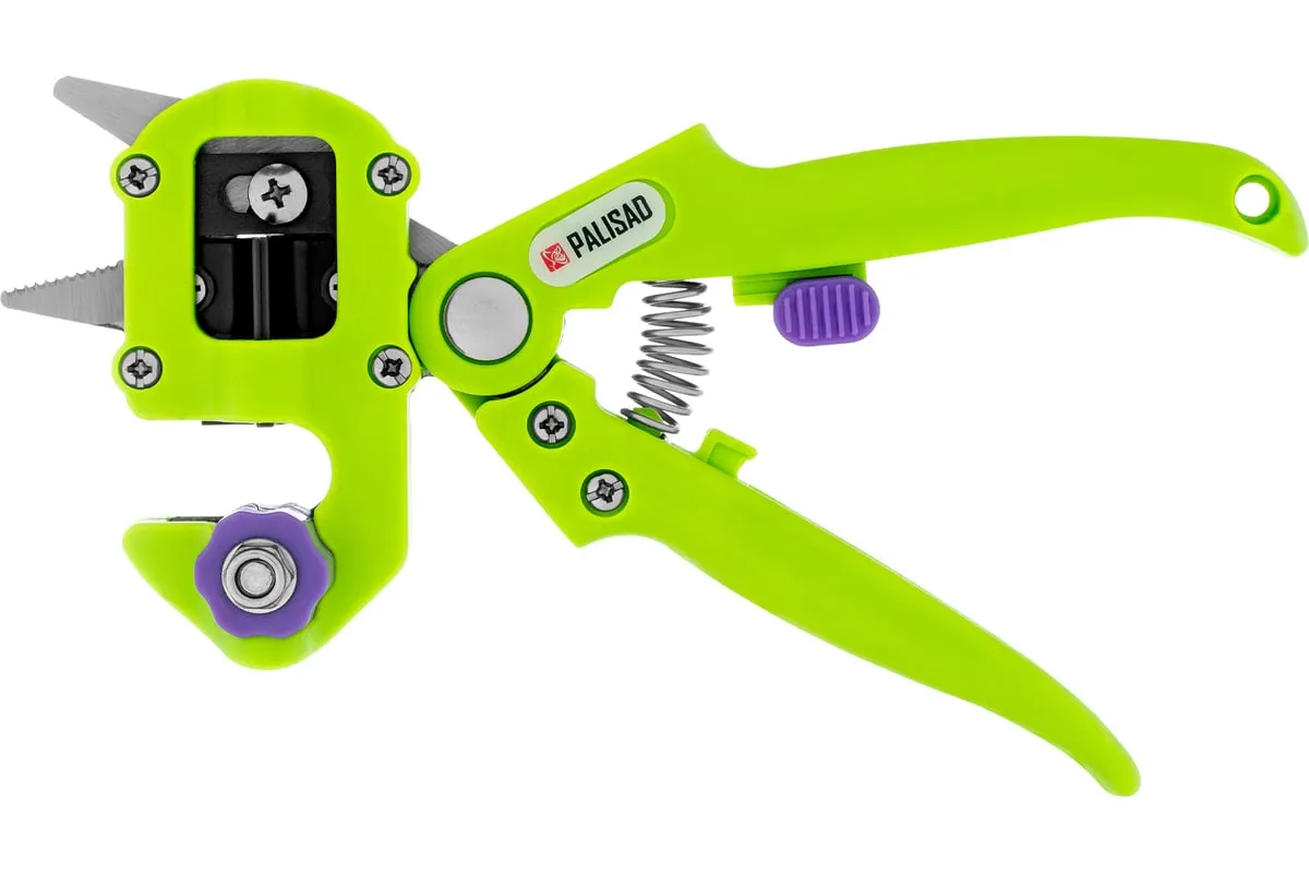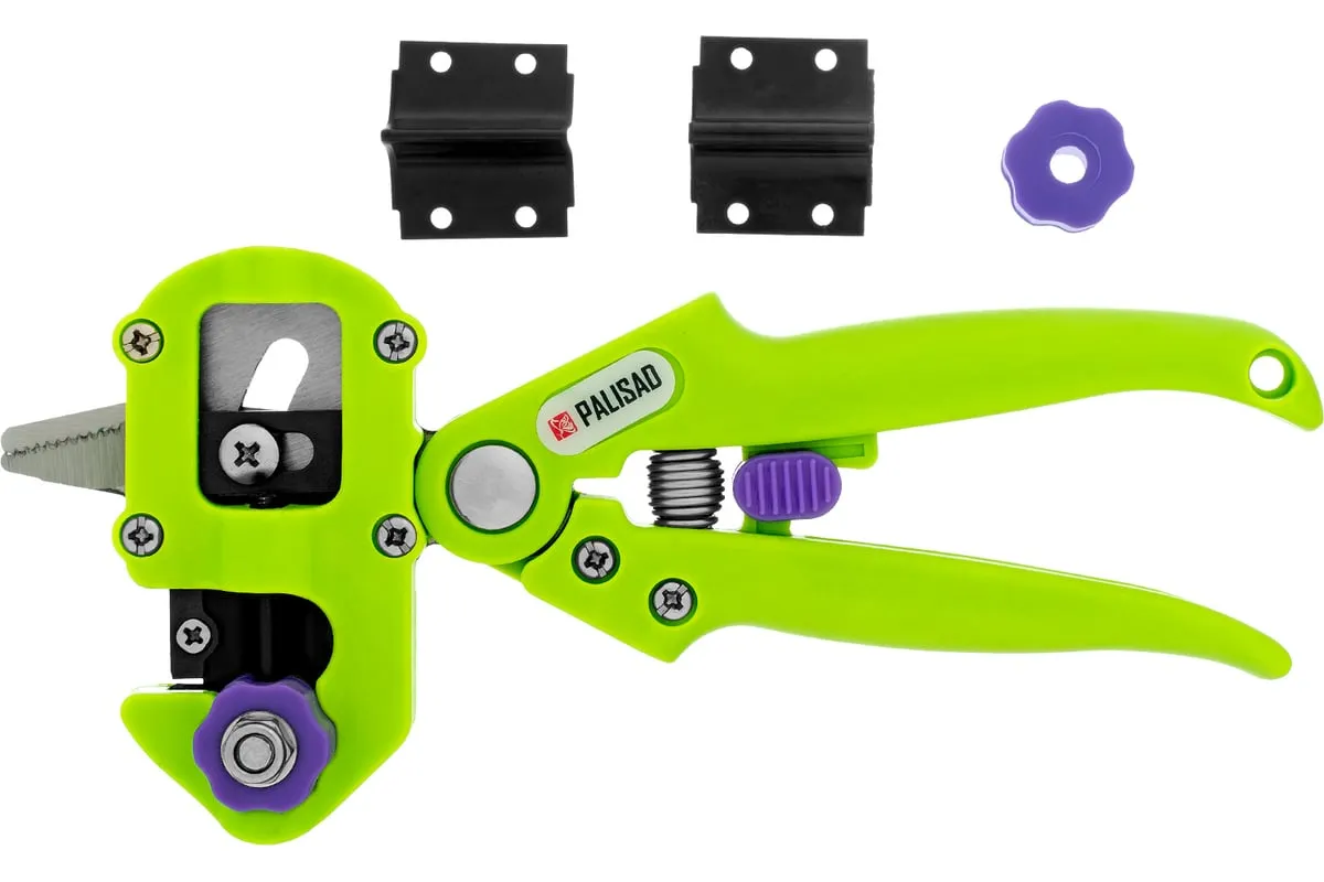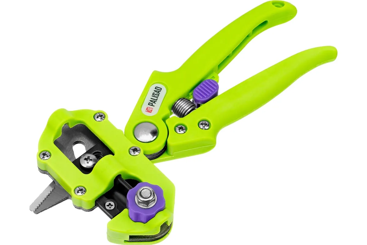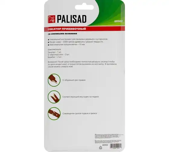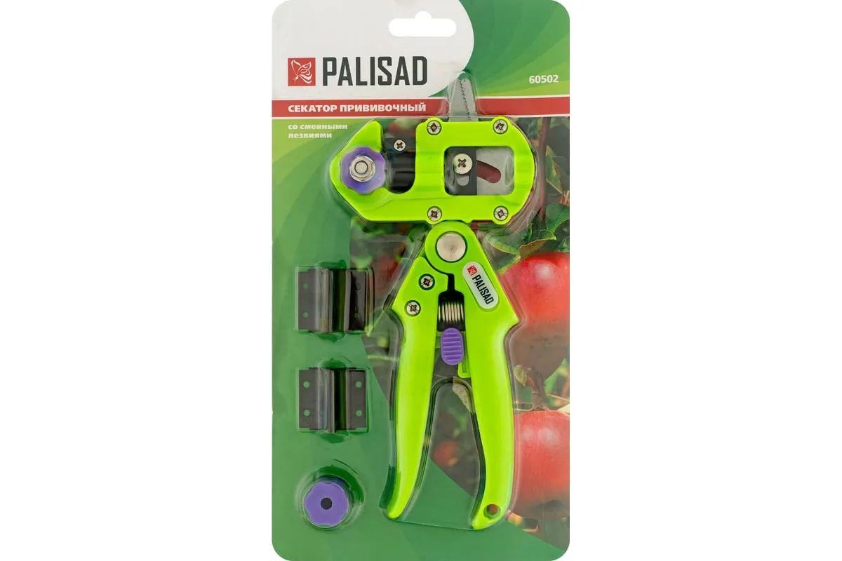 Прививочный секатор Palisad 60502 длиной 215 мм, со сменными ножами, используется для прививки плодовых растений черенком. Фигурные ножи секатора изготовлены из рессорно-пружинной стали, поэтому обладают высоким ресурсом (рассчитаны на 5000 срезов без дополнительной заточки). В комплекте U-образный, V-бразный и Ω-образный ножи, что позволяет работать с черенками различной толщины и плотности. Вырезы, сделанные на подвое и привое, идеально совместимы друг с другом, дополнительная подгонка им не требуется.