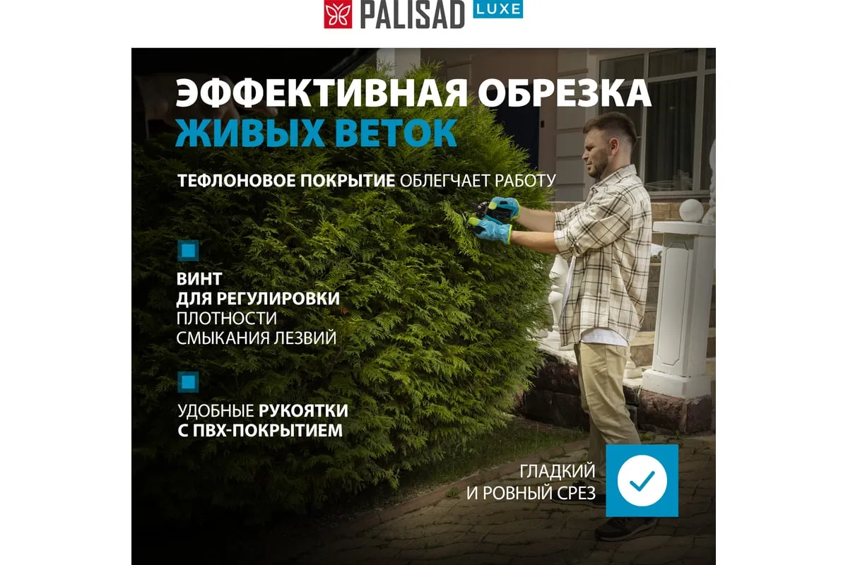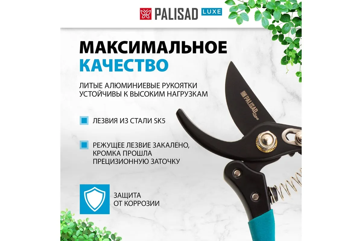 Секатор прямого реза Palisad LUXE 60473 длиной 220 мм, с алюминиевыми рукоятками, используется для срезания живых веток диаметром до 22 мм. Гладкость и аккуратность среза достигается благодаря лезвиям, перемещающимся в параллельных плоскостях. Тефлоновое покрытие режущего лезвия облегчает рез, а также защищает рабочую поверхность от коррозии. Обрезка веток таким секатором является максимально щадящей для растения.
