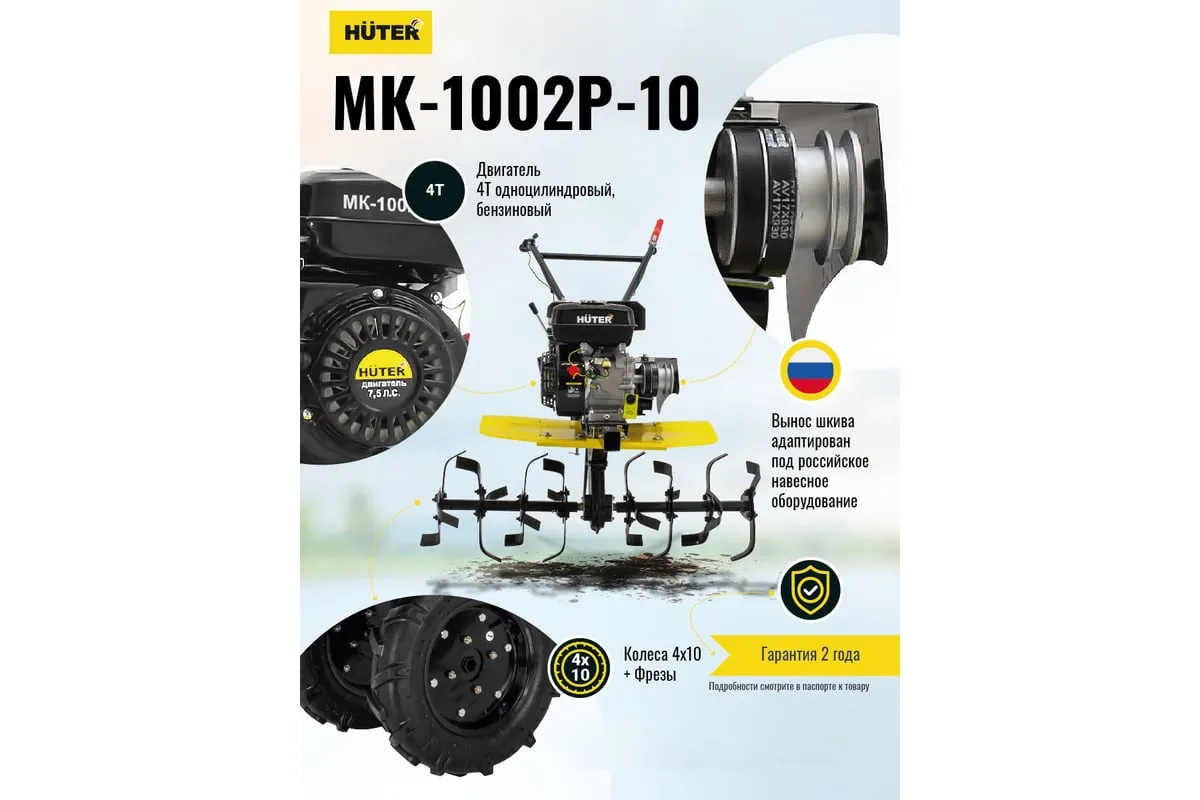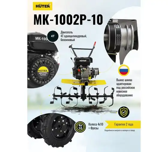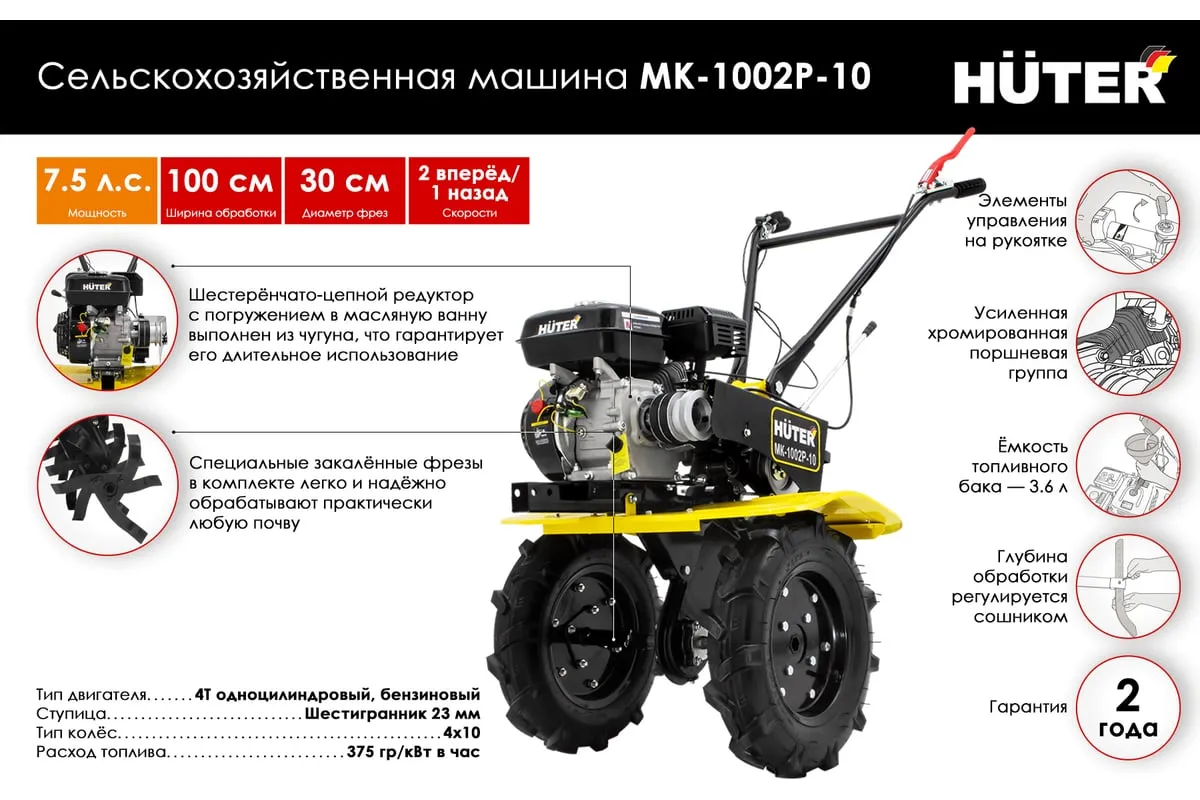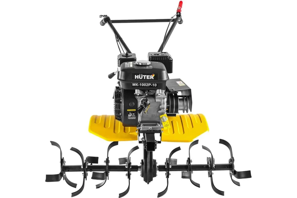 HUTER МК-1002Р-10 заправляется бензином АИ-92, емкость бака составляет 3,6 л., расход топлива — 375 г/кВтч, благодаря чему обеспечивается долгая работа инструмента. СХМ имеет ременной тип привода, что позволяет подключить различные виды навесного оборудования. Шестеренчато-цепной редуктор с погружением в масляную ванну выполнен из чугуна, это гарантирует его длительно использование.