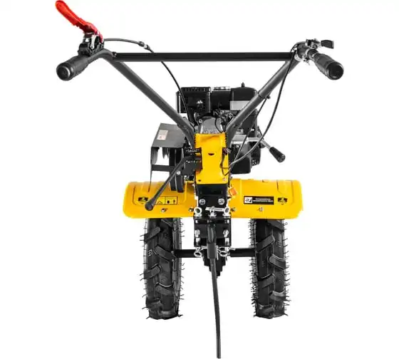 Удобство управления обеспечивает вынесенный на рукоятку переключатель. Машина имеет несколько скоростей: две — при движении вперед для более быстрой работы, и одну — для мягкого извлечения сельскохозяйственной техники из грунта. Оператор во время вспашки защищен от попадания комков земли большими крыльями. Широкий протектор колес не дает инструменту увязнуть в земле.