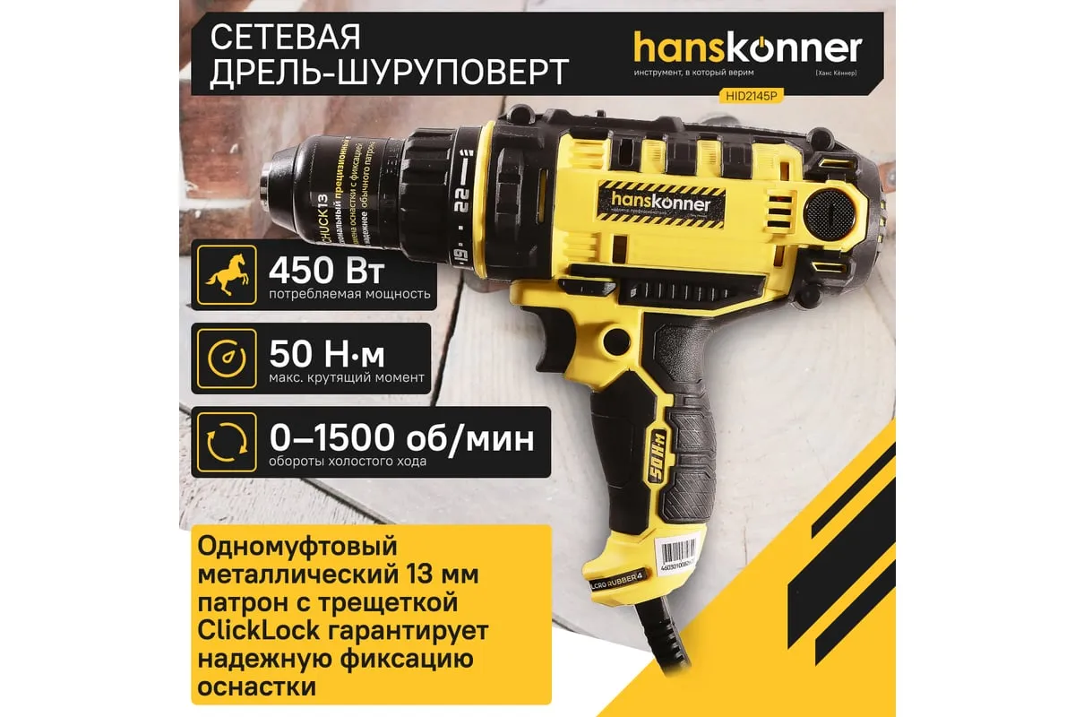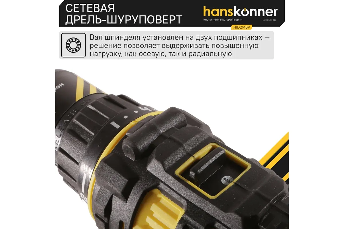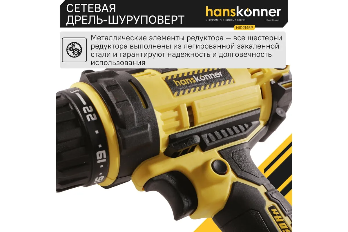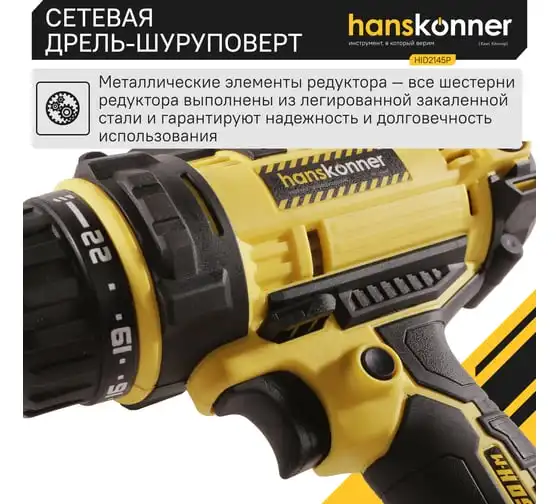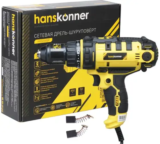 Hanskonner HID2145P – мощный универсальный двухскоростной сетевой шуруповерт. Благодаря повышенным надежности и ресурсу отлично подойдет, как для домашних работ, так и для активного применения в условиях мастерских, ремонтных баз, стройплощадок, станций сервисного обслуживания и т д. Модель имеет современный дизайн и оптимальную компоновку со смещенной вперед рукоятью, что обеспечивает нейтральный центр тяжести и положительно сказывается на удобстве использования. Прорезиненные накладки на элементах корпуса и рукояти способствуют надежному хвату, а также обладают защитными функциями. Шуруповерт оснащен производительным 450 Вт электромотором и в тандеме с мощным планетарным механизмом демонстрирует высокие показатели по крутящему моменту (макс. крутящий момент 45 Н м), позволяя эффективное использование при работах с крепежом средней и большой длины. Модель имеет две скорости: режим пониженных оборотов (0 – 400 об / мин) предназначен для работ с крепежом, режим повышенных оборотов (0 – 1500 об / мин) – для сверления отверстий в различных материалах. Благодаря муфте регулировки усилия c 22 фиксированными положениями, значение момента затяжки на валу шпинделя можно изменять в широком диапазоне –это дает возможность максимально гибко подстраивать инструмент применимо к используемым крепежным элементам и их размеру, а также, материалу заготовки.