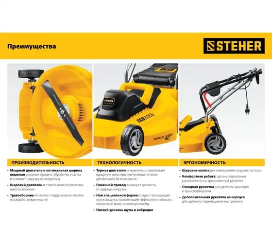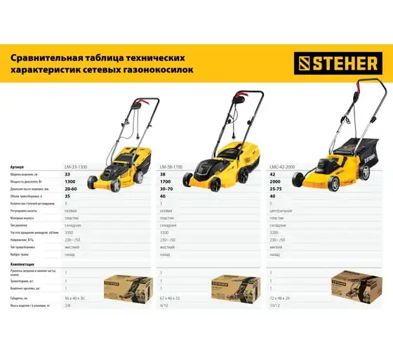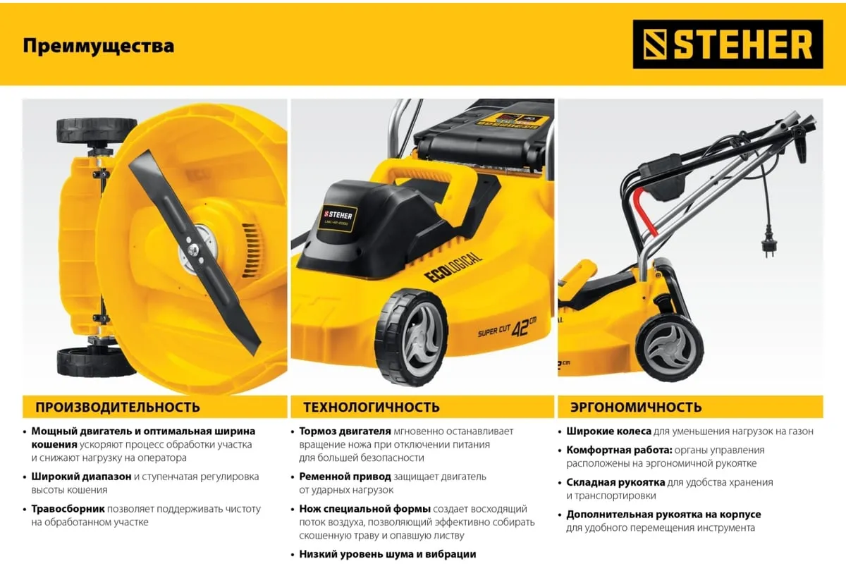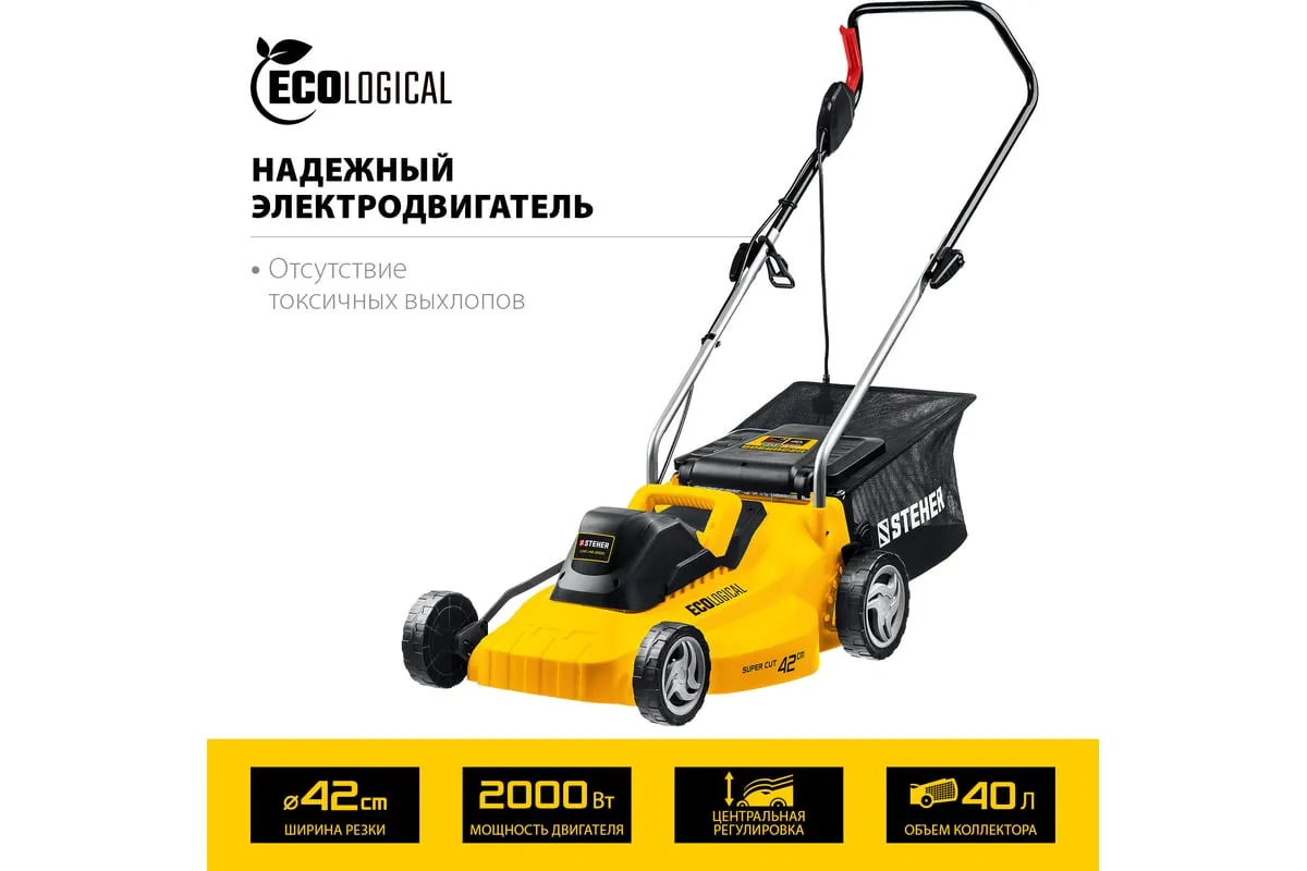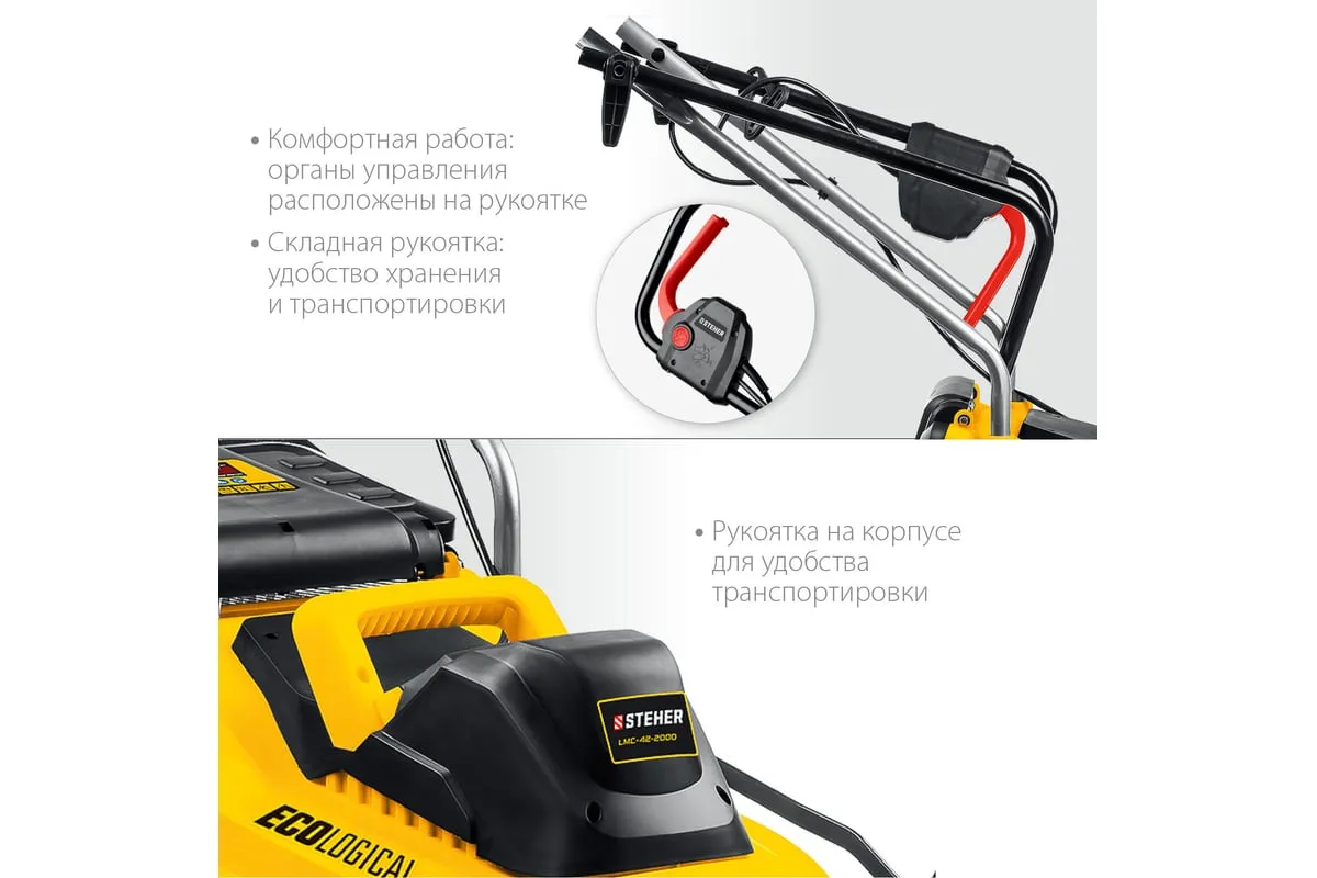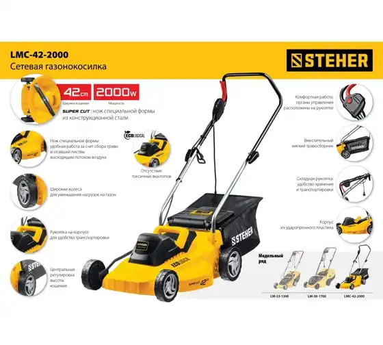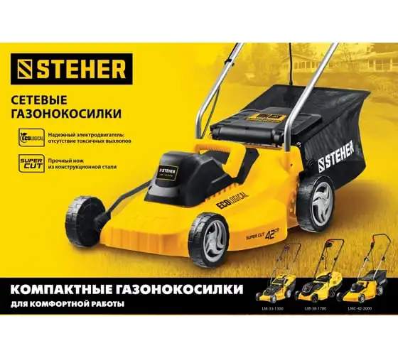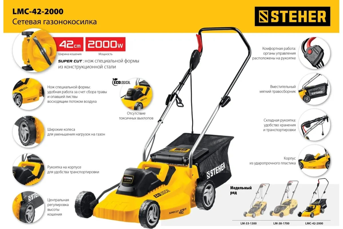 Сетевая газонокосилка STEHER LMC-42-2000 - безупречный уход за газоном с комфортом и без малейших затруднений.Мощный электрический двигатель, простое управление, а также прочный и легкий корпус служат гарантом этого. Применяется для подстригания травы при уходе за газоном (с вращающимся ножом). Имеетфункции кошения со сбором травы и регулировки высоты кошения. На корпусе имеется специальная ручка для легкой переноски. Является прекрасной альтернативой бензиновой газонокосилке: меньшее потребление энергии при той же режущей способности, отсутствие необходимости постоянной покупки ГСМ и контроля уровня топлива и масла, простота эксплуатации и ремонта, а такжеменьшие шум и вибрация и полное отсутствие вредных выбросов.