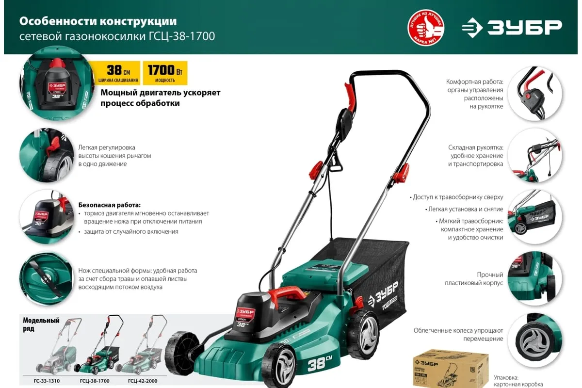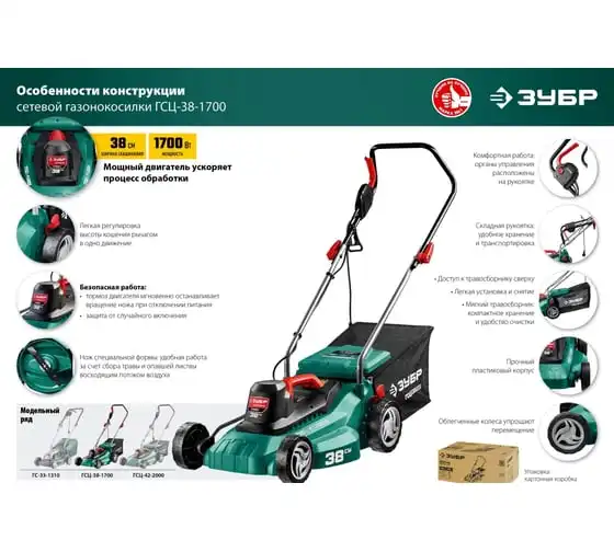 Сетевая газонокосилка ЗУБР 1700 Вт ГСЦ-38-1700 служит для ухода за небольшим по площади газоном на садовых и придомовых территориях. Модель оснащена ножом специальной формы, он поднимает полегшую траву и направляет скошенную в травосборник, чтообеспечивает качественную обработку. Пять ступеней регулировки высотыскашивания позволят привести траву на участке в желаемый вид. Переключение производится с помощью специального рычага. Складная рукояткапозволяет экономить место при транспортировке и храненииинструмента.