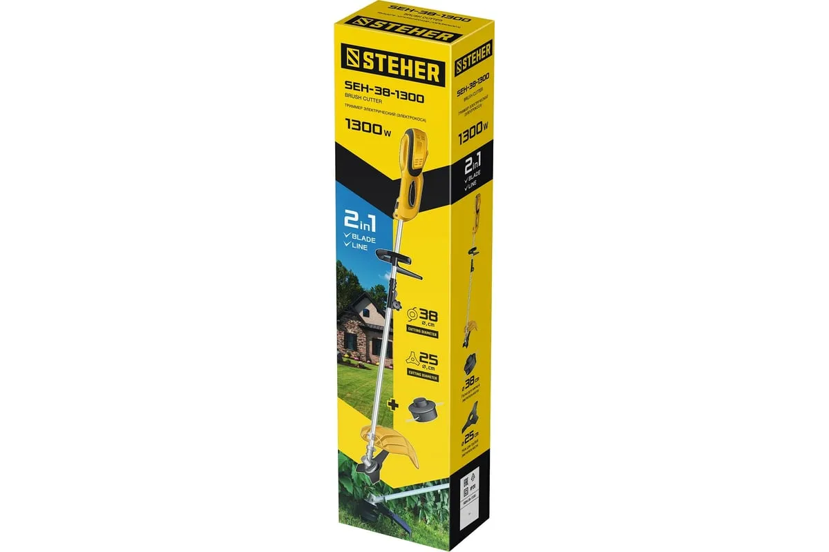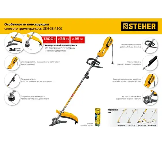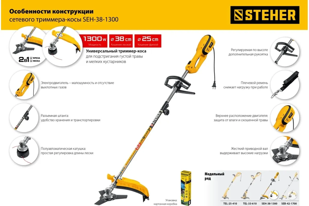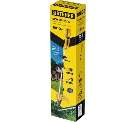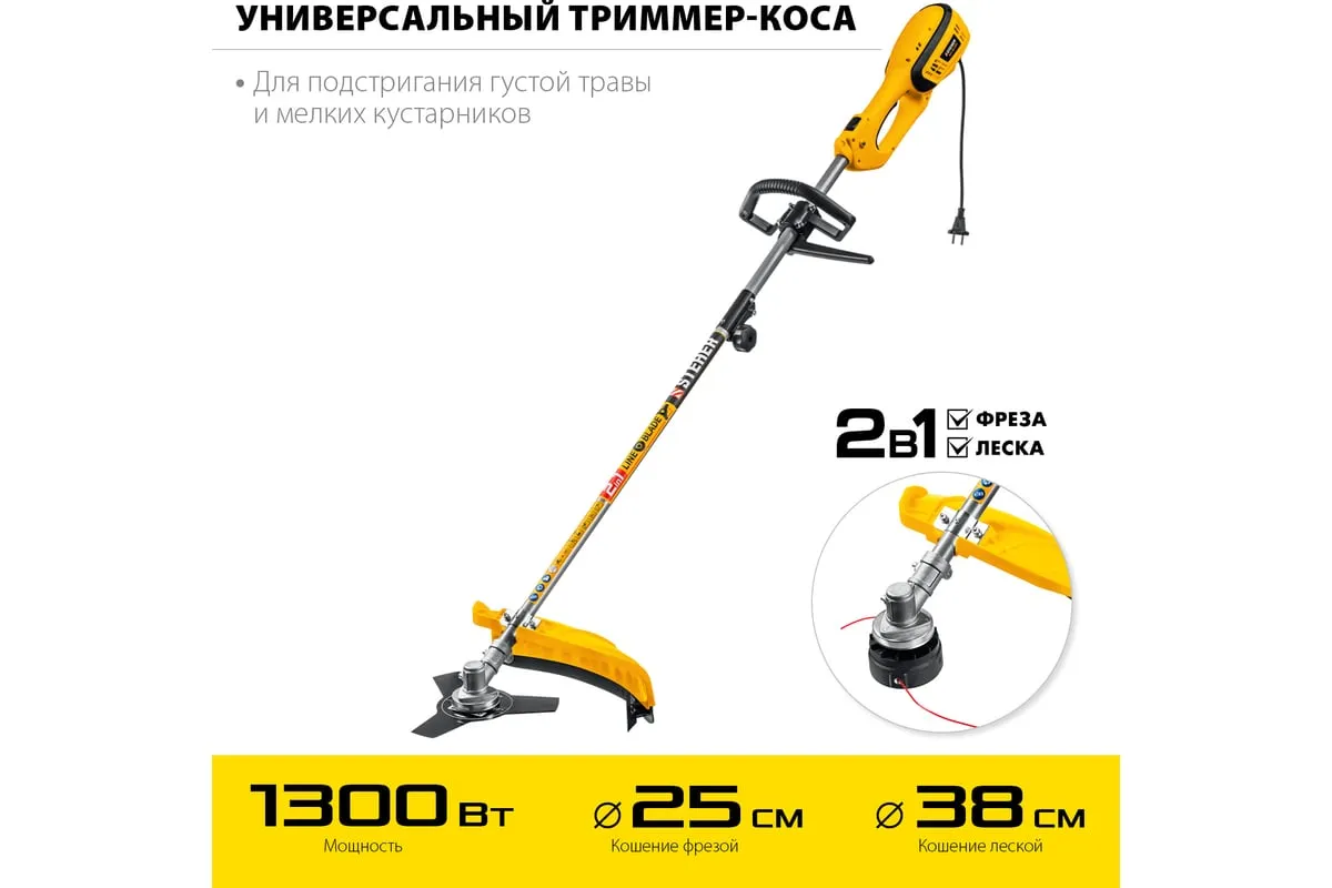 Сетевая коса STEHER SEH-38-1300 - универсальный инструмент на участке. Способна заменить газонокосилку и триммер, так как оснащается катушкой с леской (для мягкой растительности) и ножом (для грубой растительности). Большая мощность двигателяпозволяет косить довольно густую и грубую растительность, а небольшие размеры - добраться до самых труднодоступных мест.
