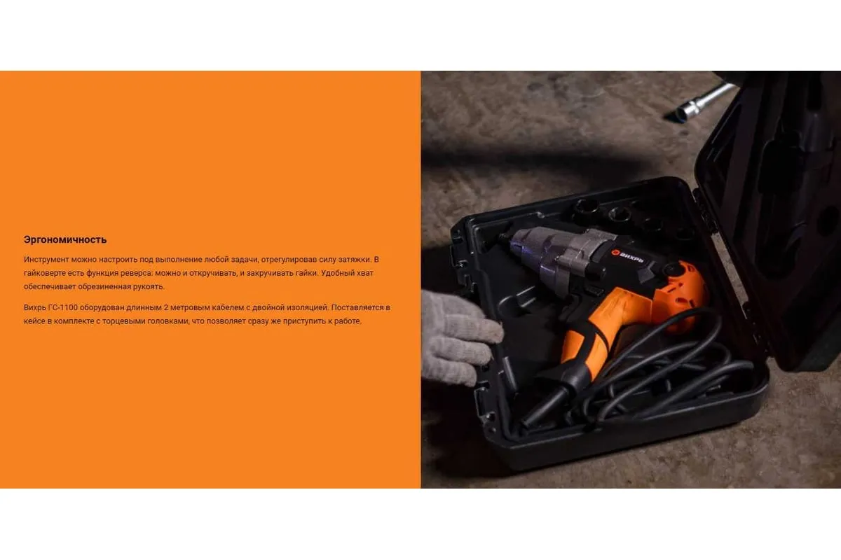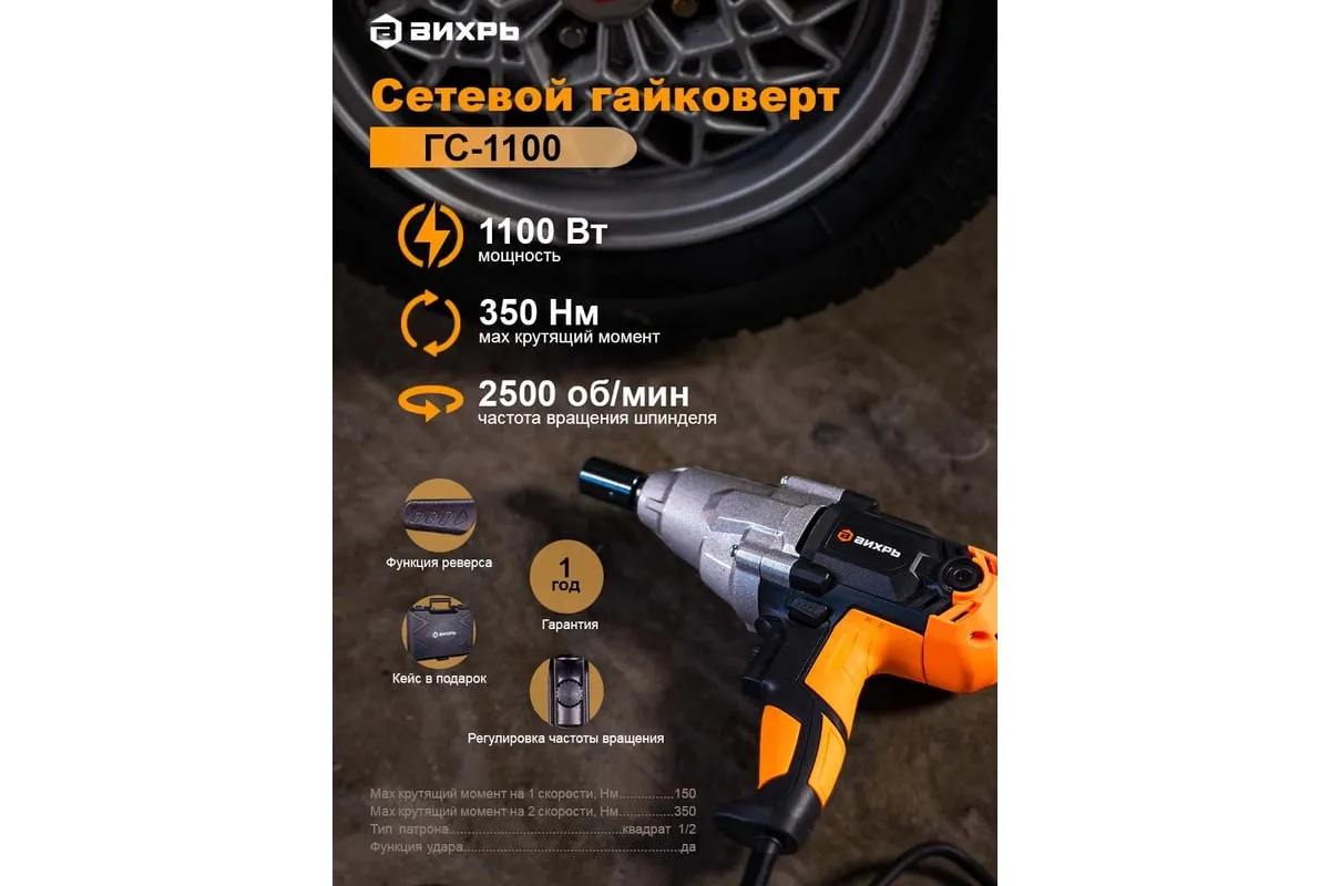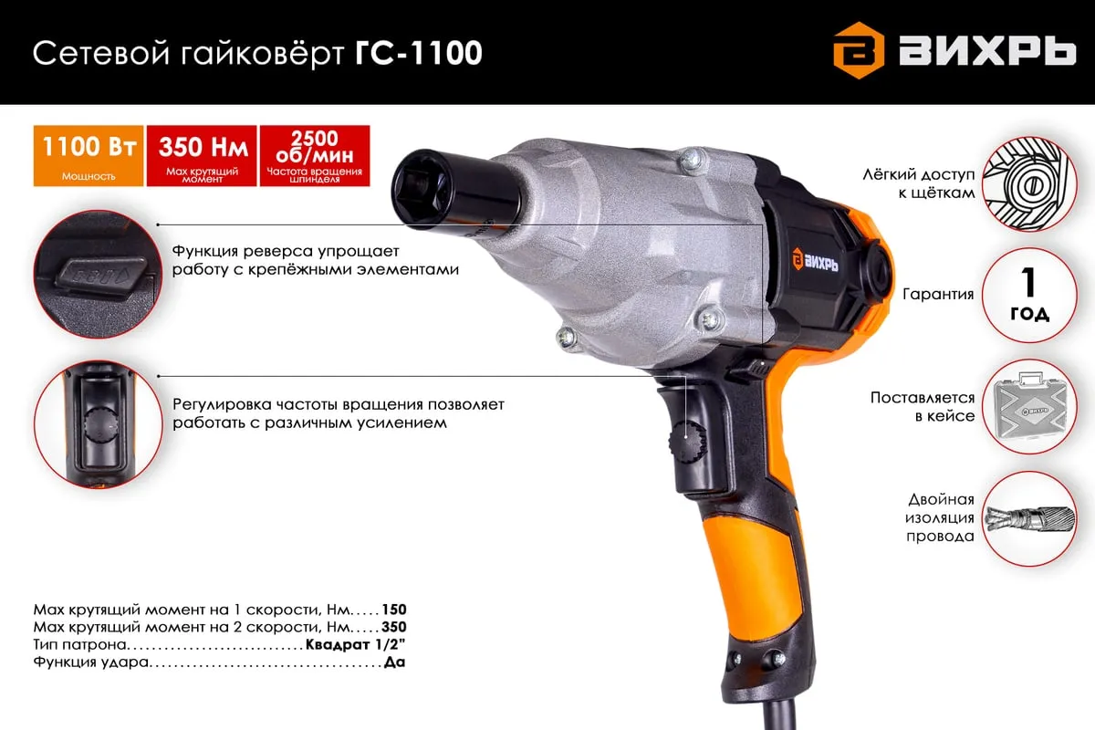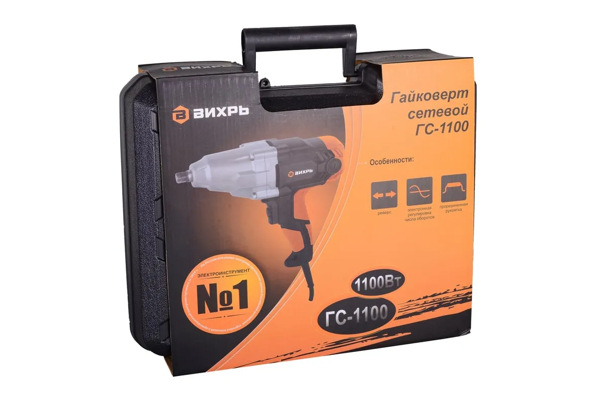 Ударный сетевой гайковерт Вихрь ГС-1100 – удобный в использовании электроинструмент. Основное назначение – закручивание различных болтов и гаек. Благодаря наличию функции реверса, также может использоваться для откручивания крепежей. Упрощает снятие колес с автомобиля владельцами и в автосервисе, но также может применяться и для других поставленных задач.