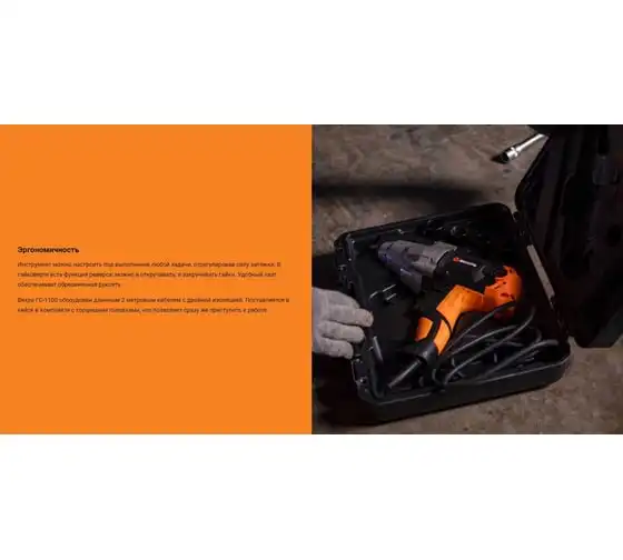 В комплектацию электроинструмента входит набор торцевых головок, поэтому его можно эксплуатировать сразу после приобретения без покупки необходимой оснастки. Для удобства применения предусмотрена прорезиненная эргономичная ручка. Инструмент продается в пластиковом кейсе, в котором его удобно хранить и перевозить. Кабель длиной 2 м с хорошей изоляцией обеспечивает удобство при выполнении работы.