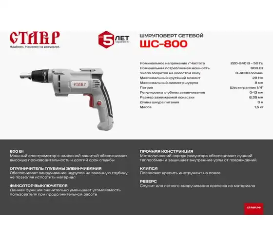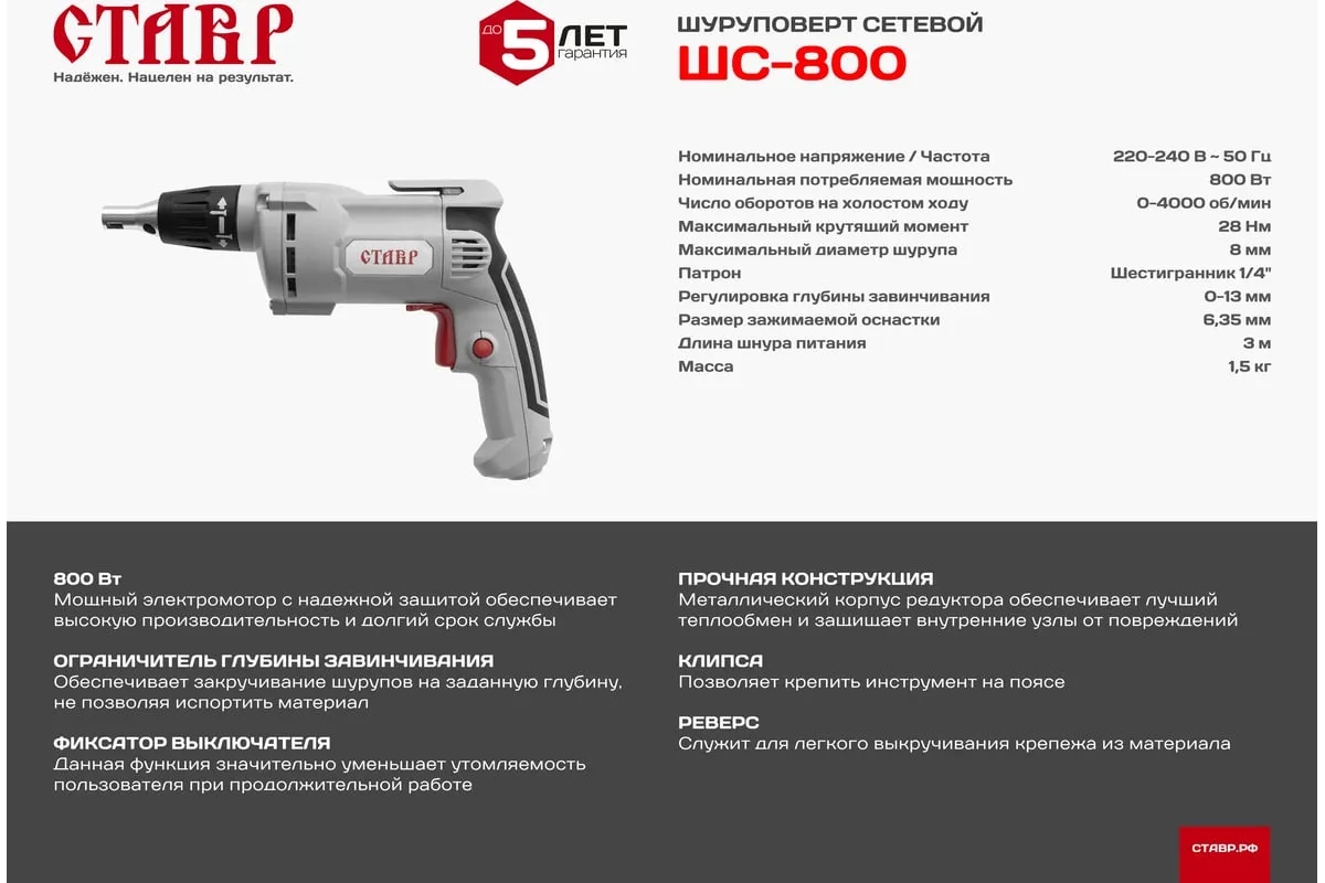 Сетевой шуруповерт Ставр ШС-800 ст800шс применяется для завинчивания/вывинчивания различных видов крепежного материала при монтаже гипсокартонных и деревосодержащих панелей на металлические или деревянные каркасы, в том числе без предварительного засверливания.