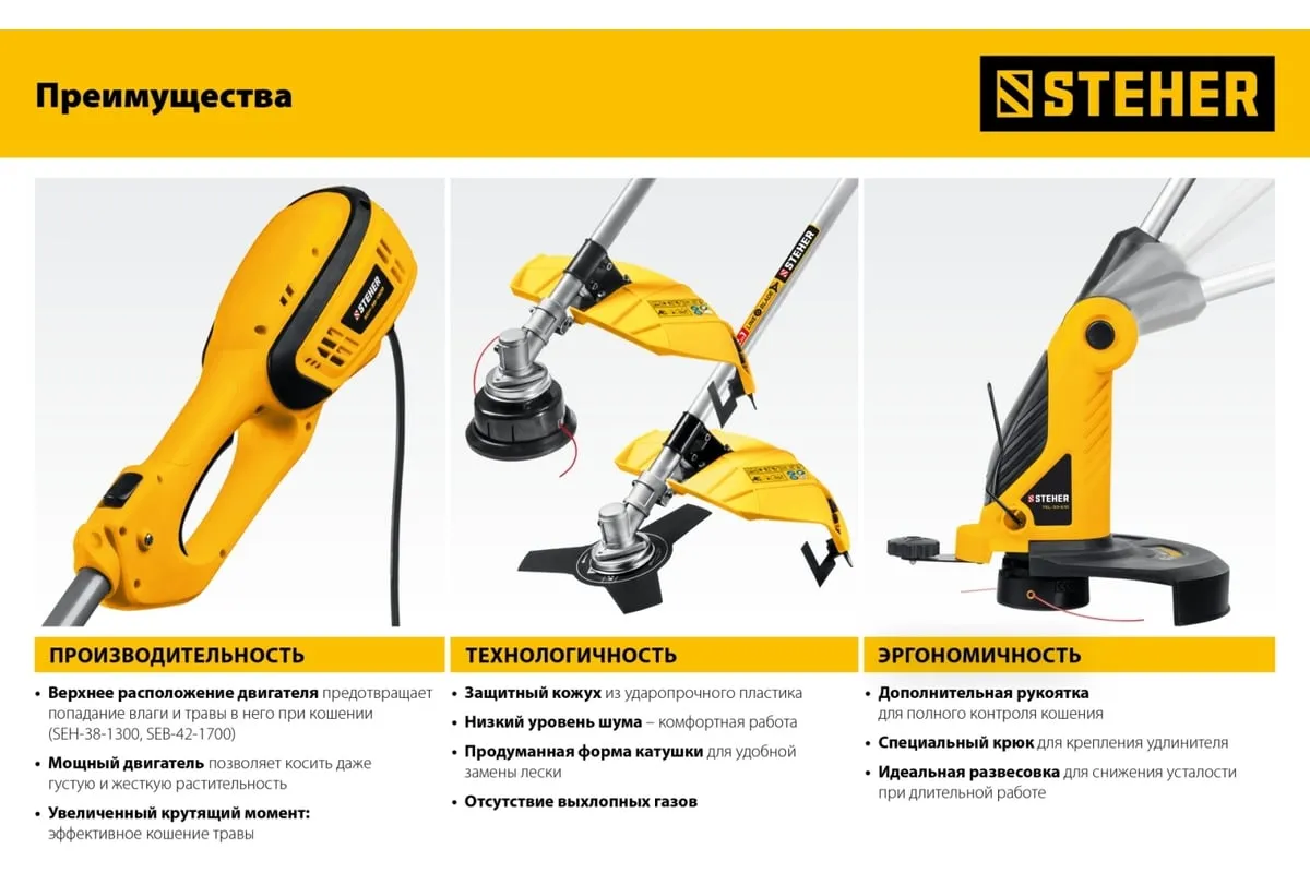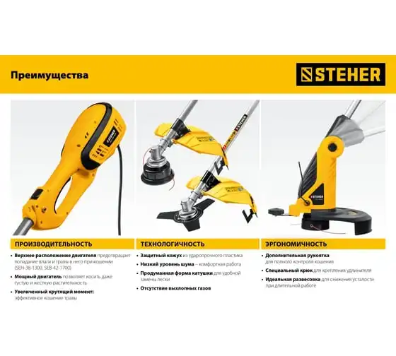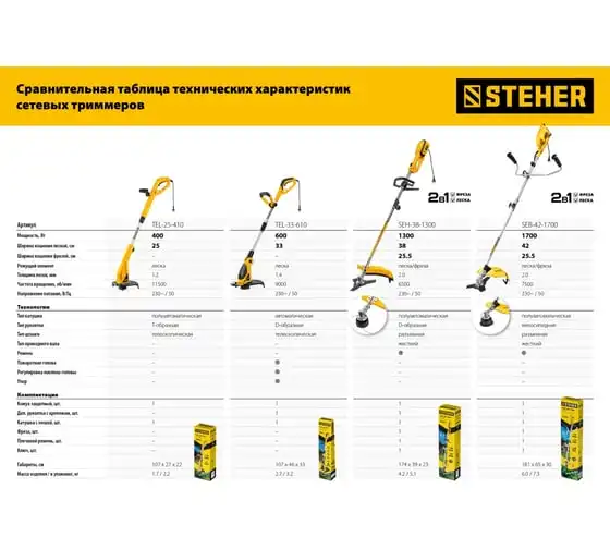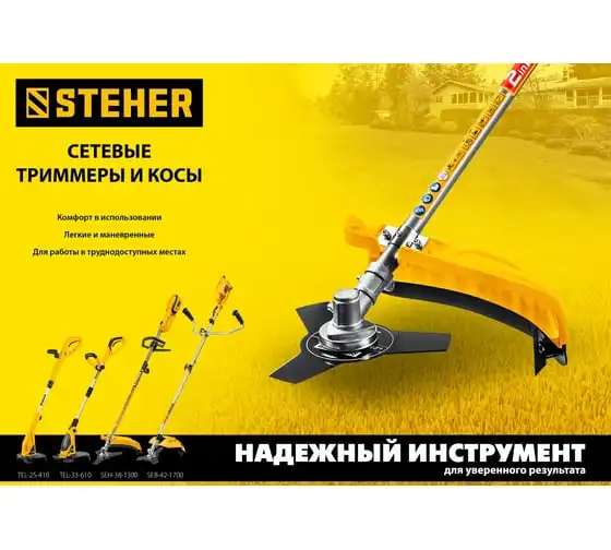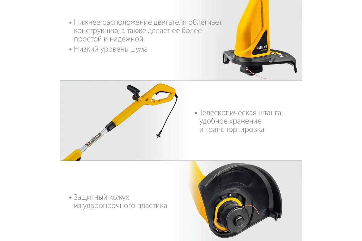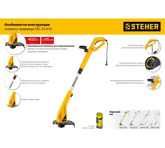 Сетевой триммер STEHER TEL-25-410 - удобный инструмент для поддержания участка в порядке. Аккуратное, чистое и быстрое кошение в укромных уголках сада - эта работа у него отлично получается. Прекрасная альтернатива бензиновому триммеру: легче и компактнее, меньшая мощность при той же режущей способности, отсутствие необходимости постоянной покупки ГСМ и приготовления смеси, легкость и компактность, а также меньшие шум и вибрация и полное отсутствие вредных выбросов.
