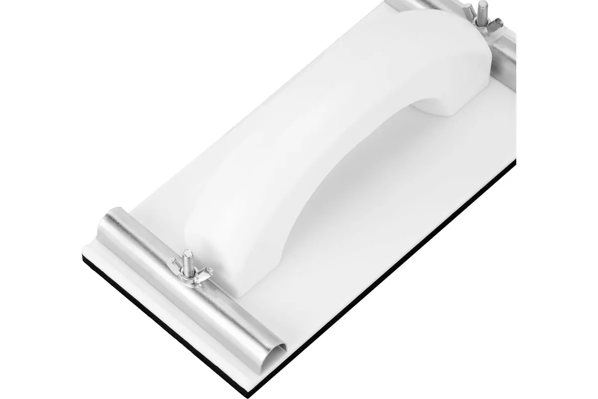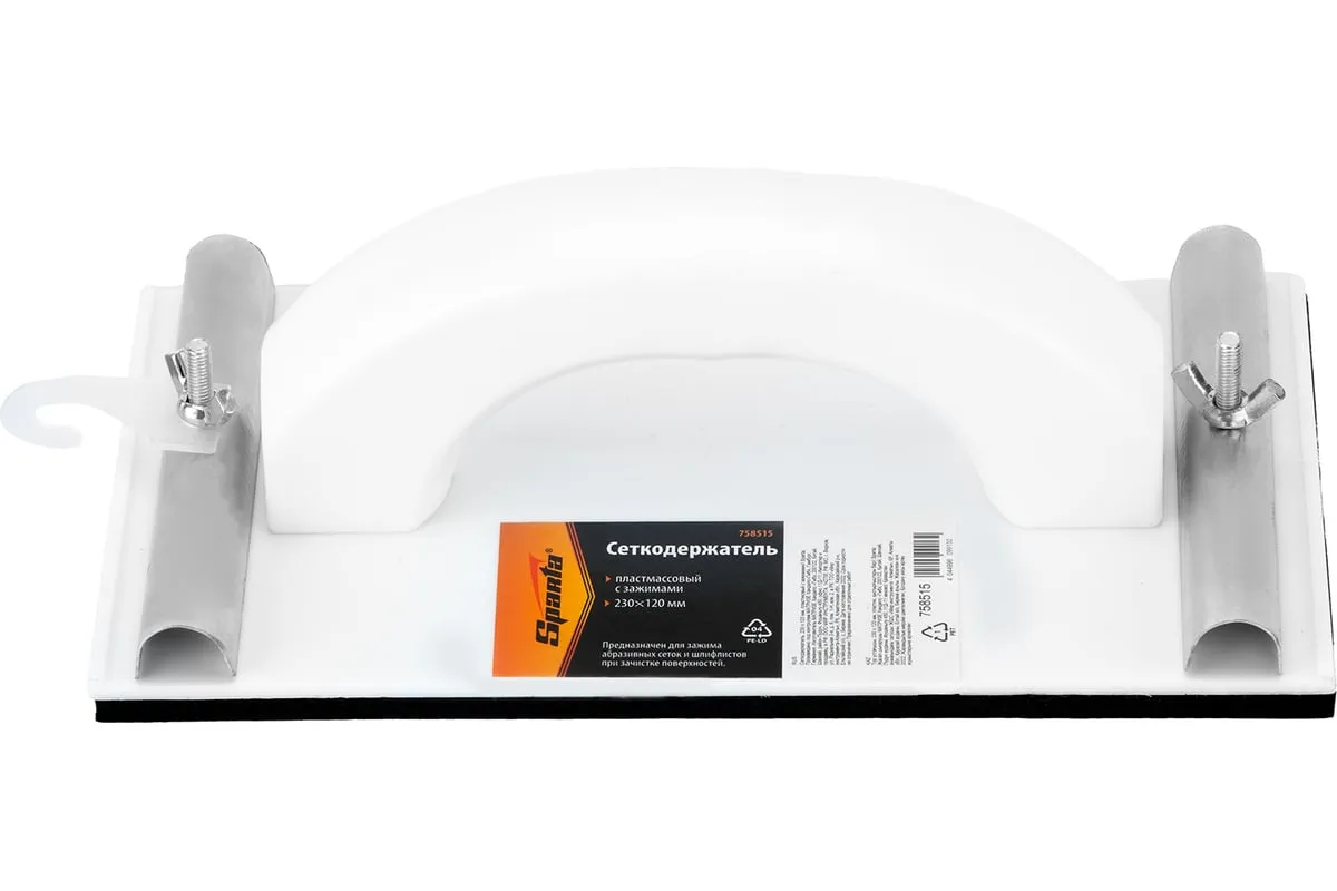 Сеткодержатель Sparta 758475, 230 х 105 мм, пластиковый с зажимами, используется для ручного шлифования деревянных, шпатлеванных, металлических, пластмассовых и прочих твердых поверхностей. Сеткодержатель фиксирует абразивную стеклосетку или шлифлист и позволяет удалять старые отделочные покрытия, подготавливать поверхность под покраску, а также выполнять чистовую обработку.