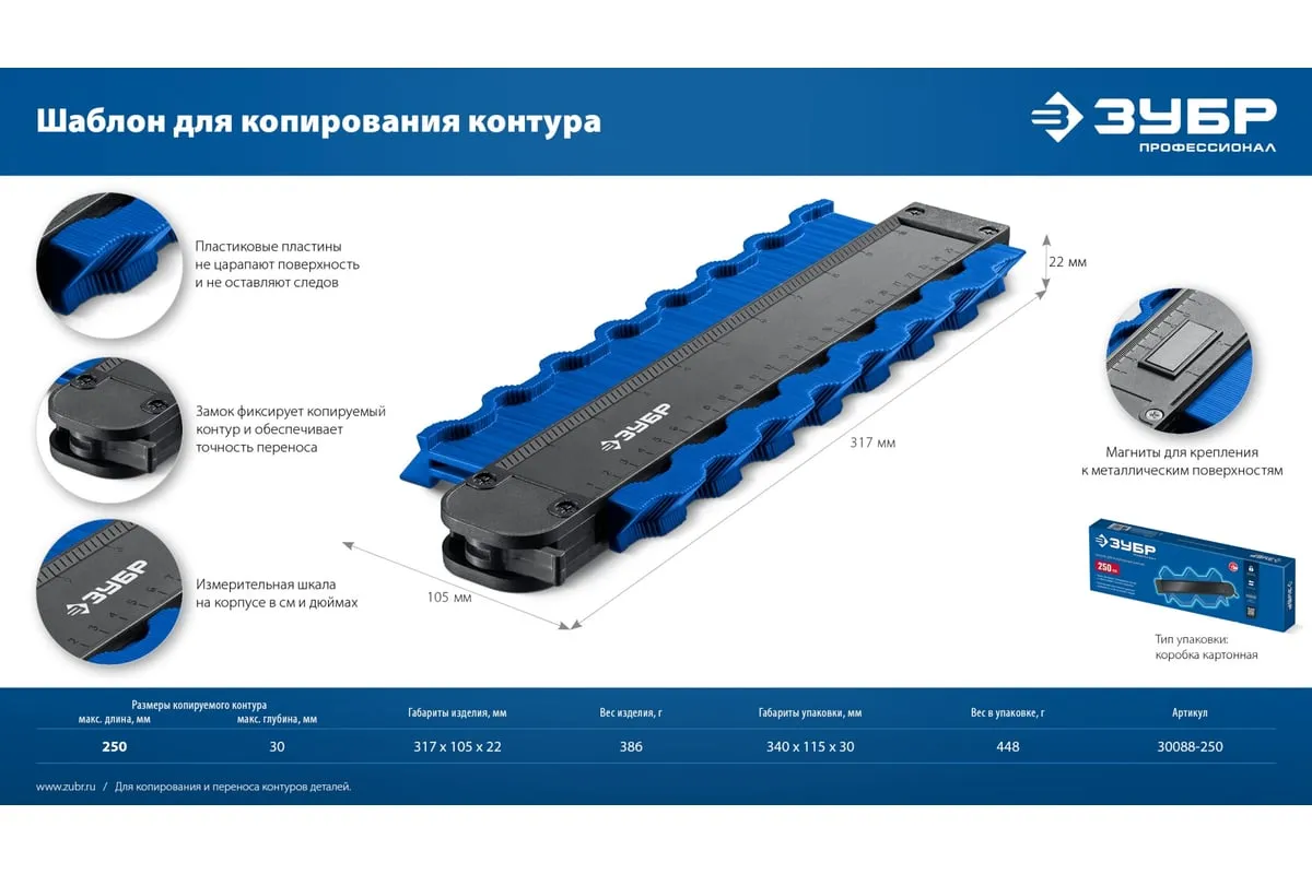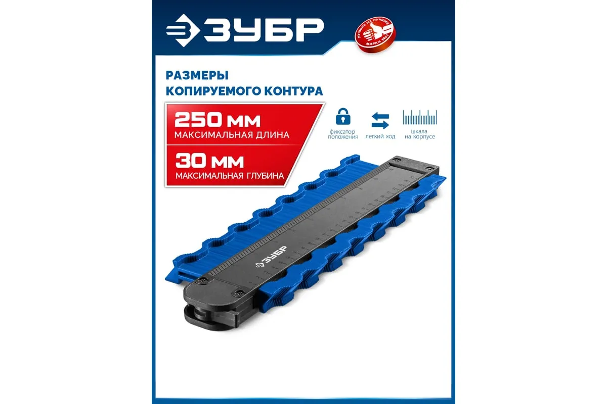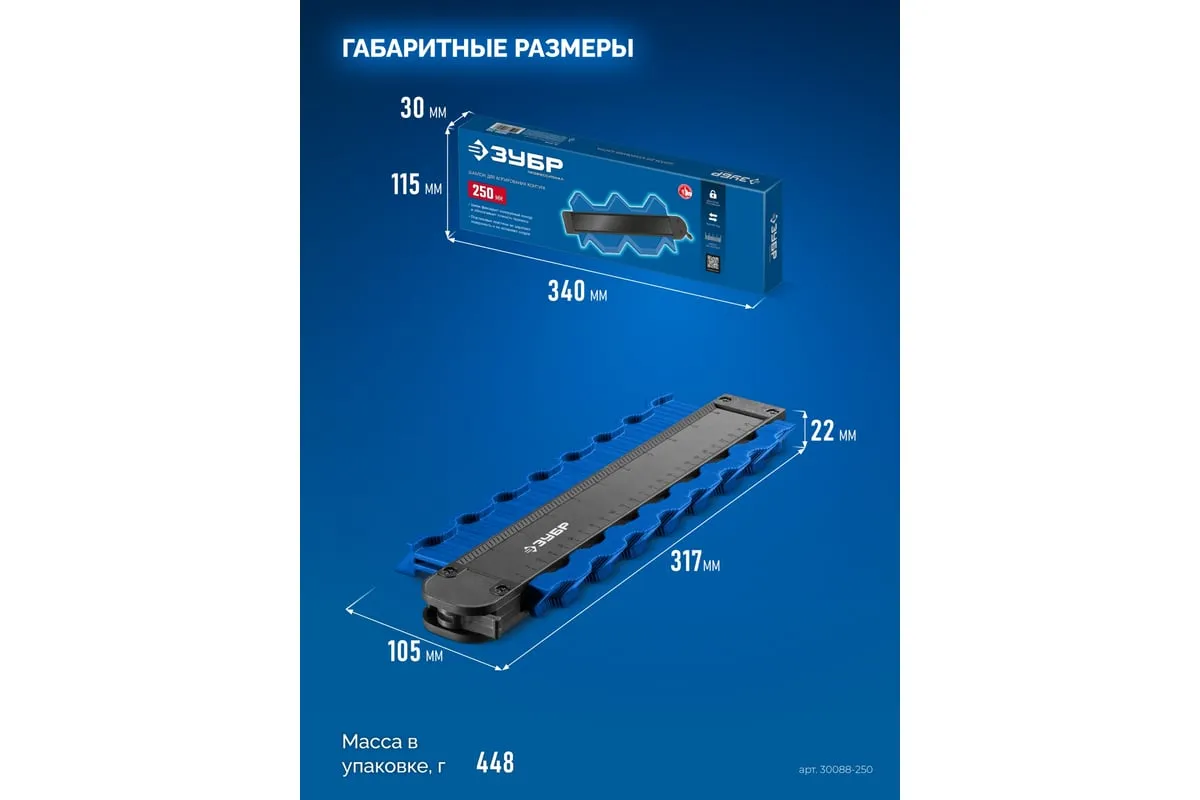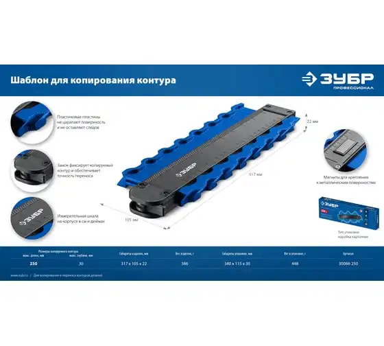 Шаблон ЗУБР 30088-250 предназначен для копирования и переноса контуров деталей. Широко используются в быту для подрезки отделочных материалов при обходе труб, углов и т.п. Размеры копируемого контура: макс. длина 250 мм, макс. глубина 30 мм.