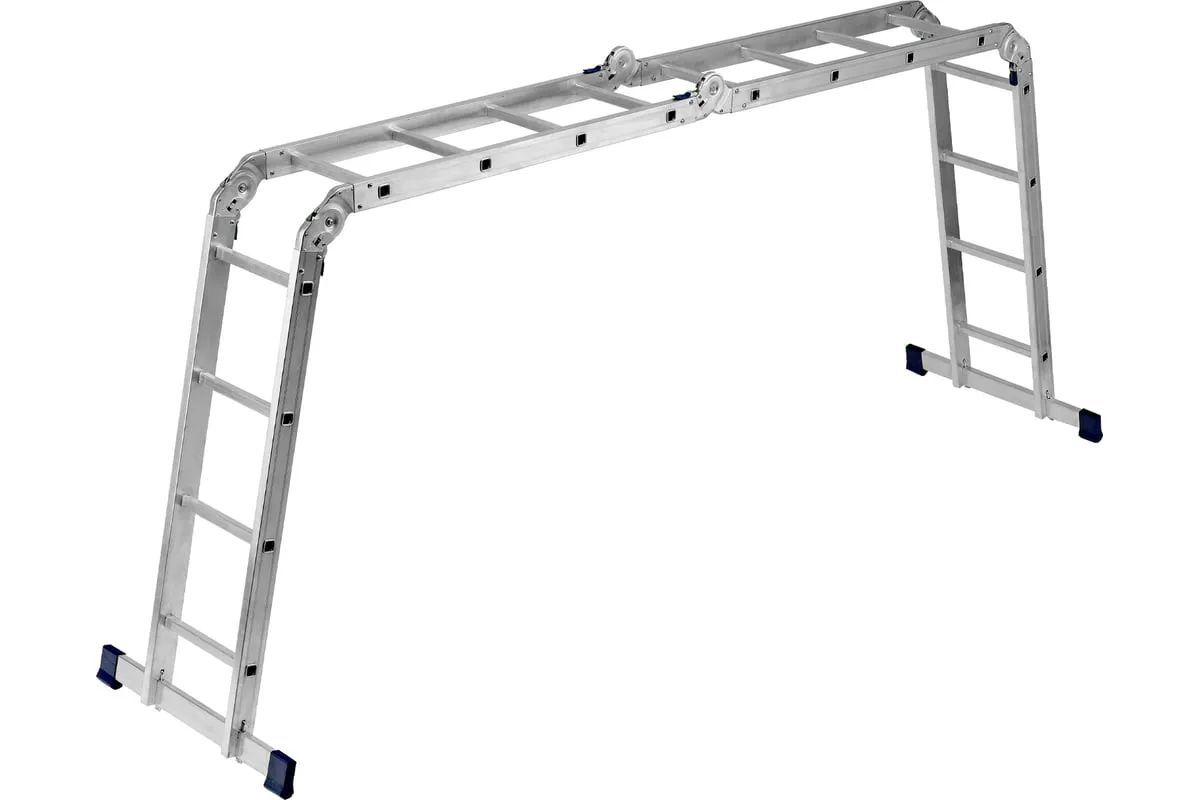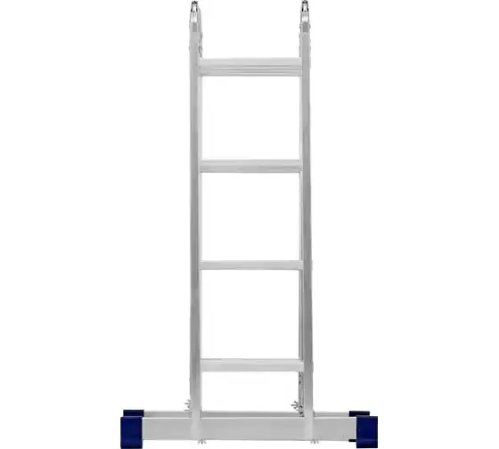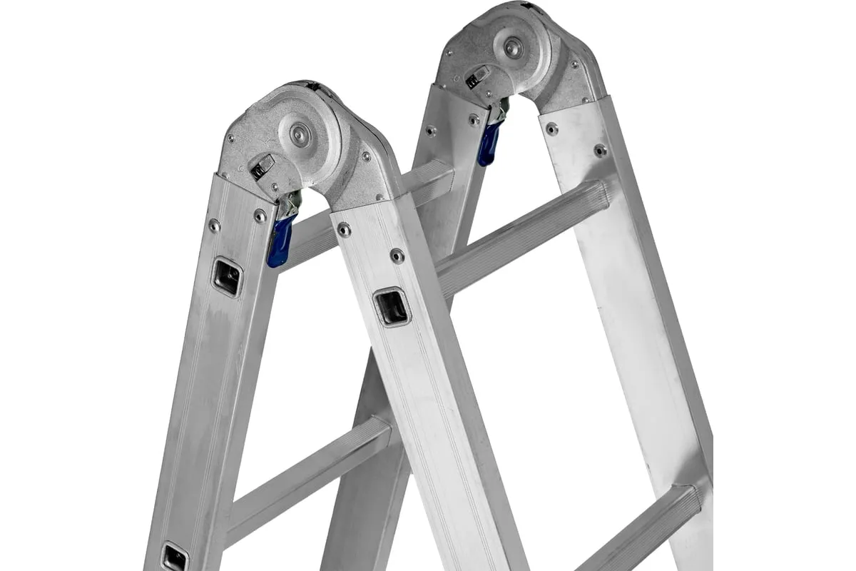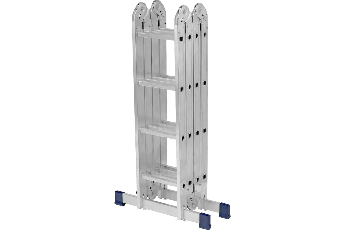 Шарнирная алюминиевая лестница СИБРТЕХ 4х4 97882 может трансформироваться в зависимости от выполняемых работ. Отличается надежной, устойчивой конструкцией, быстрой сменой положения за счет шарнирных механизмов. Защиту от скольжения на рабочих поверхностях обеспечивают заглушки и широкие траверсы.