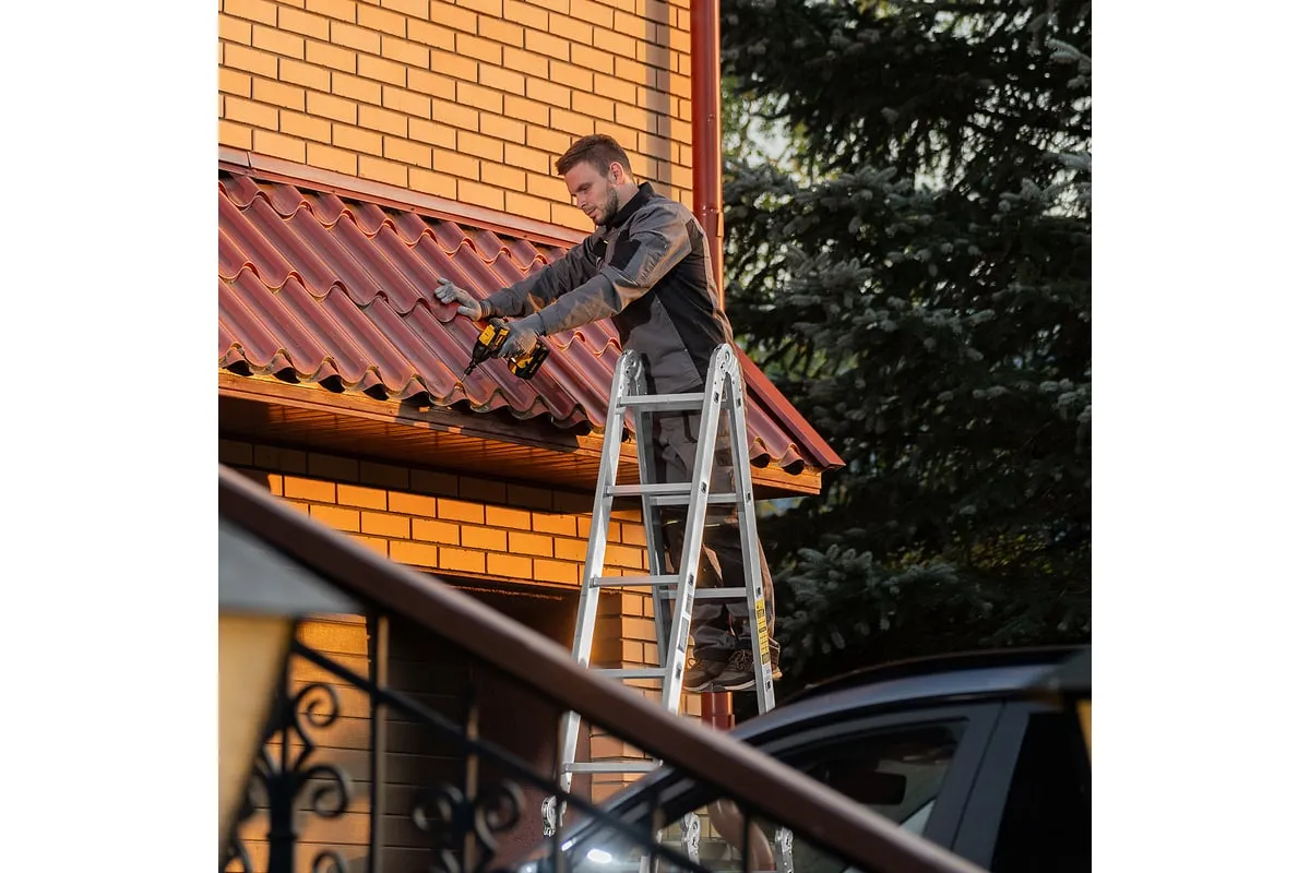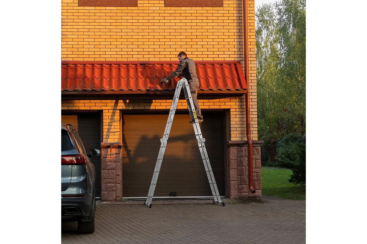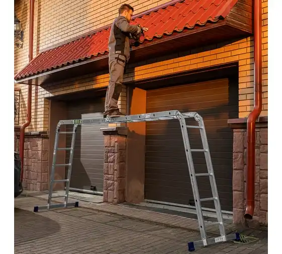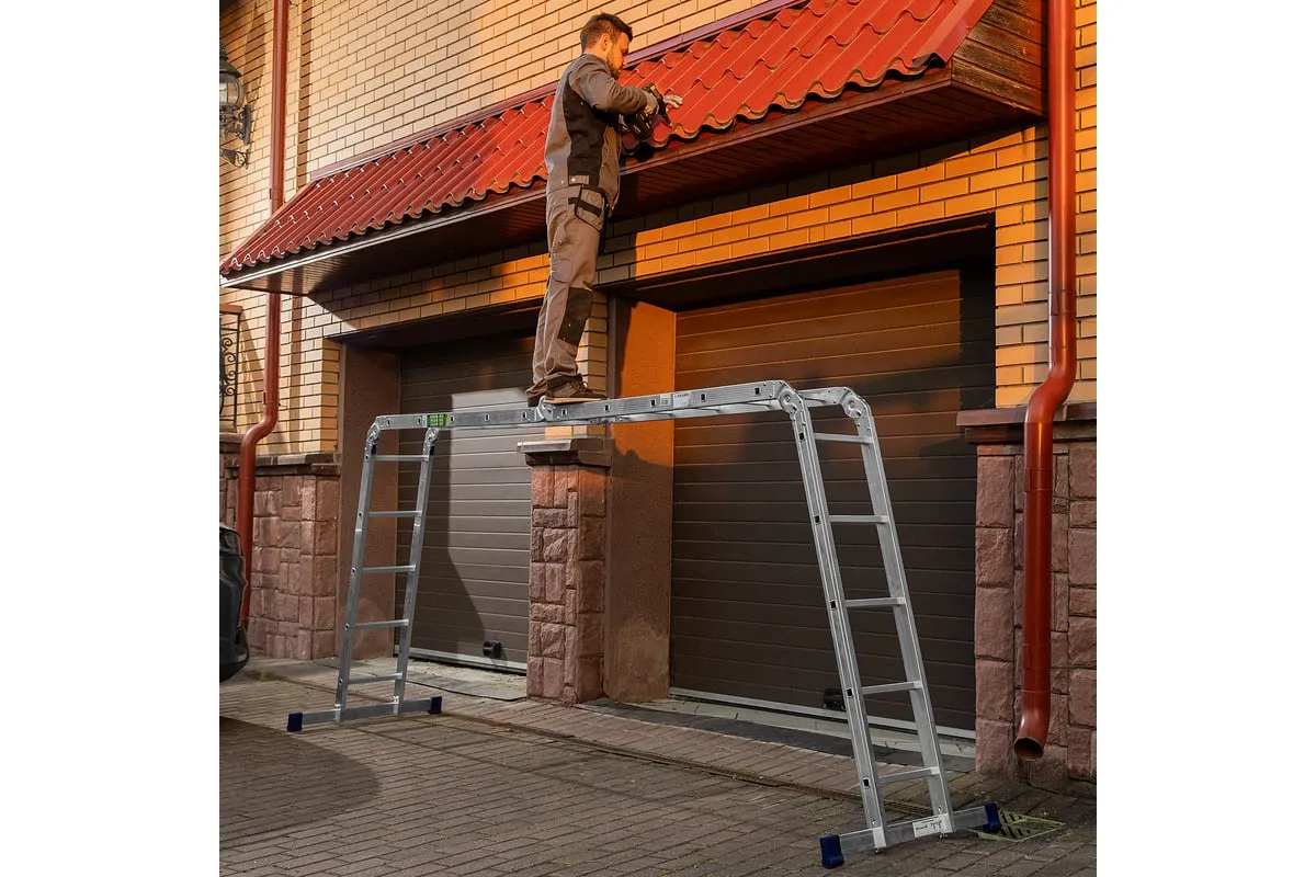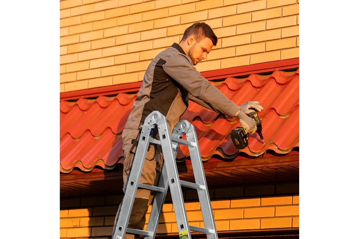 Шарнирная алюминиевая лестница СИБРТЕХ 4х5 97883 может трансформироваться в зависимости от выполняемых работ. Отличается надежной, устойчивой конструкцией, быстрой сменой положения за счет шарнирных механизмов. Защиту от скольжения на рабочих поверхностях обеспечивают заглушки и широкие траверсы.
