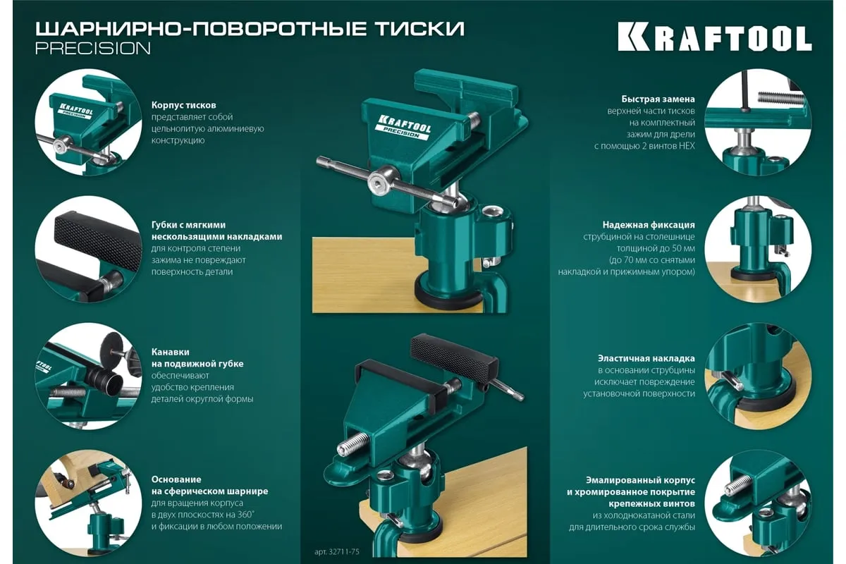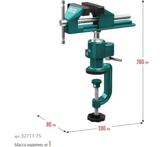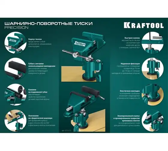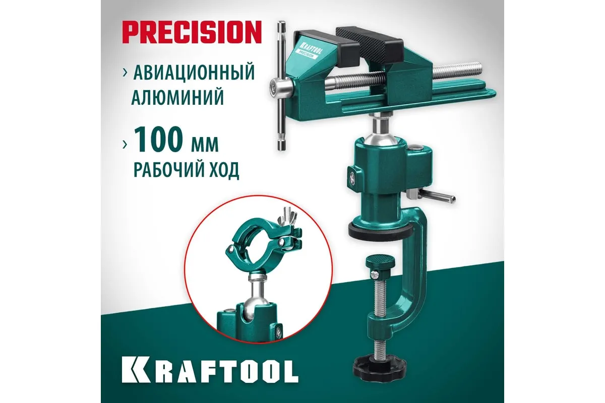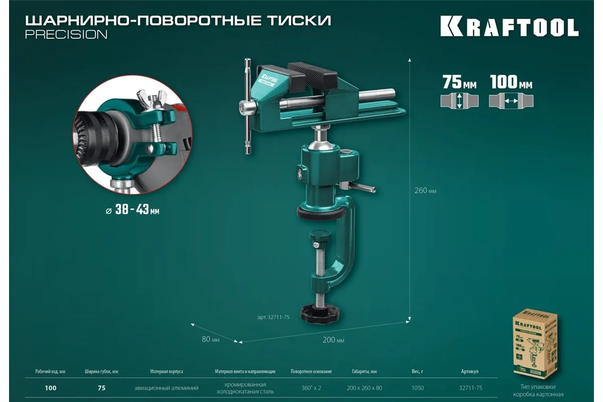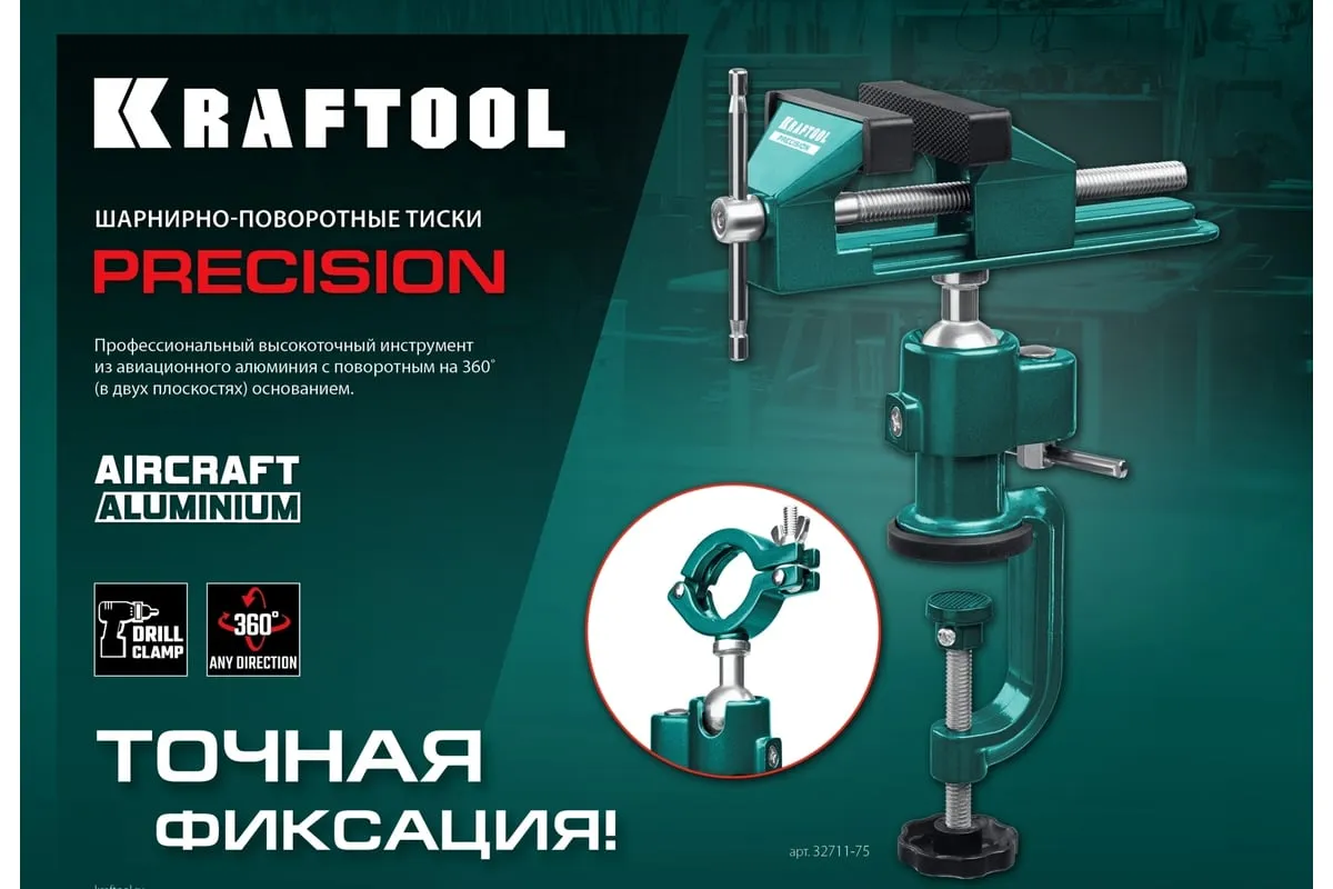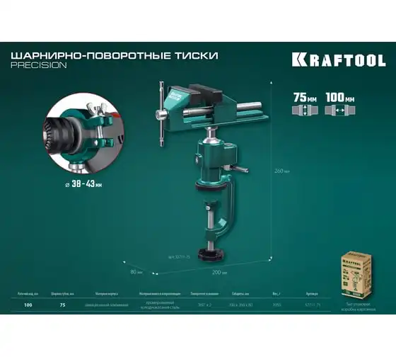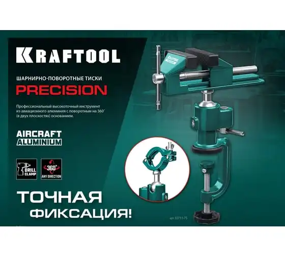 Шарнирно-поворотные тиски KRAFTOOL Precision 75 мм 32711-75 - профессиональный шарнирно-поворотный инструмент с ручным приводом для выполнения точных работ. Предназначены для зажима различных предметов или их отдельных составных элементов.