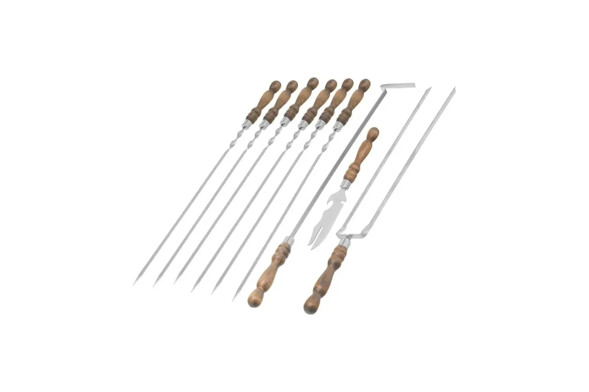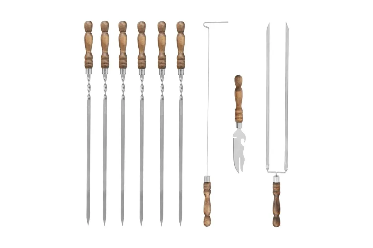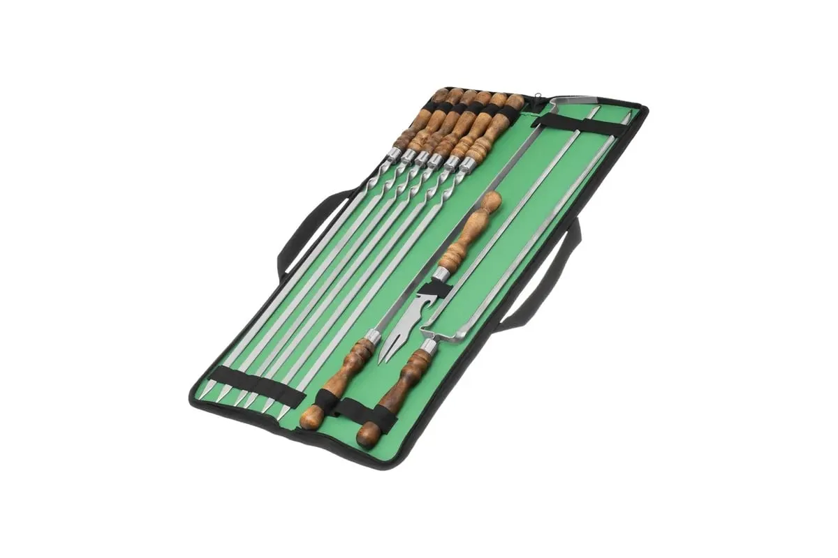 Шашлычный набор PALISAD Camping 9 предметов в сумке 69754 представляет собой практичный и удобный комплект для приготовления шашлыков на природе. Изготовленный из нержавеющей стали, он обеспечивает долговечность и устойчивость к коррозии, что особенно важно при использовании на открытом воздухе. Деревянные ручки обеспечивают комфортное и надежное удержание, что делает процесс приготовления более удобным. Набор включает шесть предметов, упакованных в удобный чехол, который облегчает транспортировку и хранение. Общая длина каждого предмета составляет 650 мм, что позволяет готовить большие порции мяса. Толщина в 2,5 мм гарантирует прочность и надежность в использовании. Вес набора составляет 1,85 кг, что делает его достаточно легким для переноски.