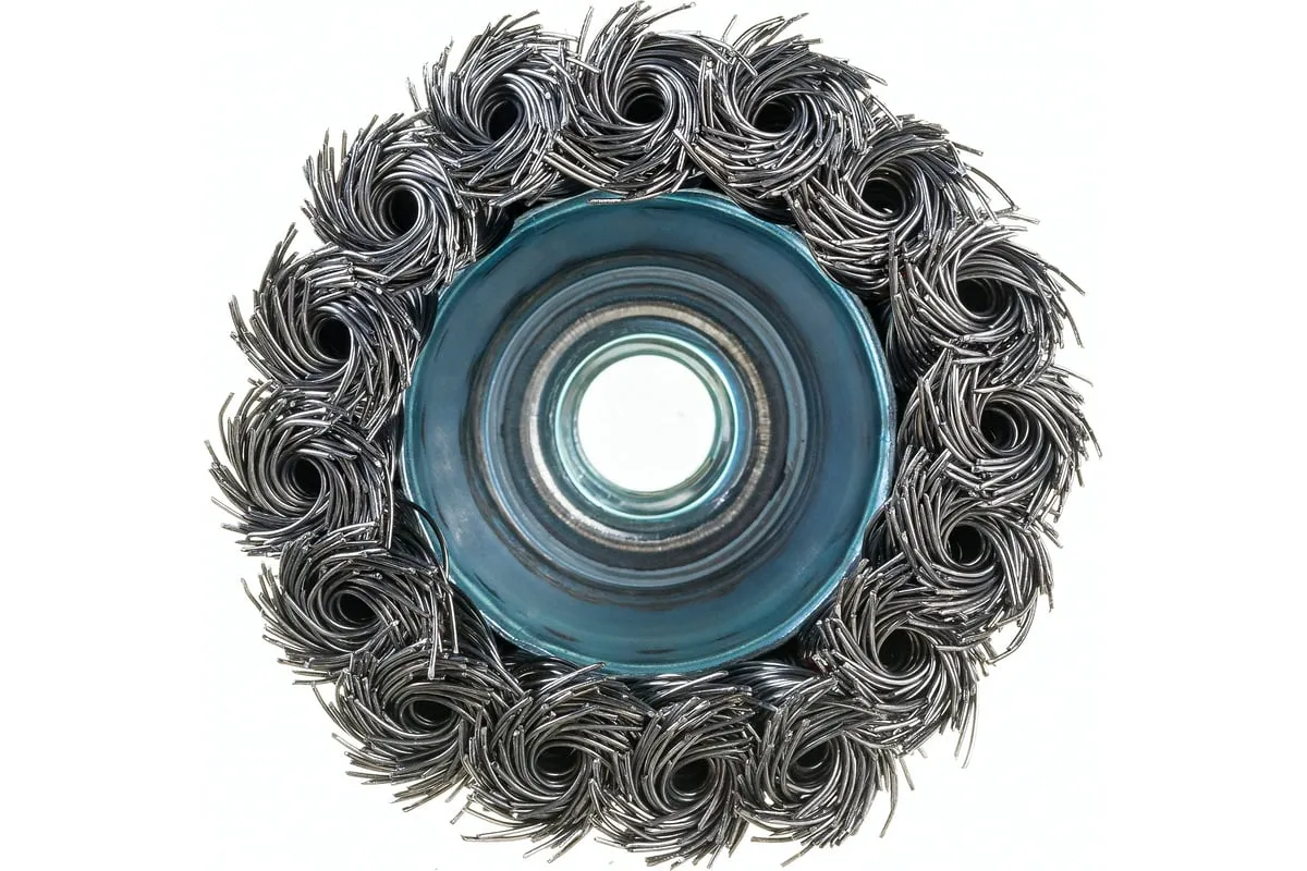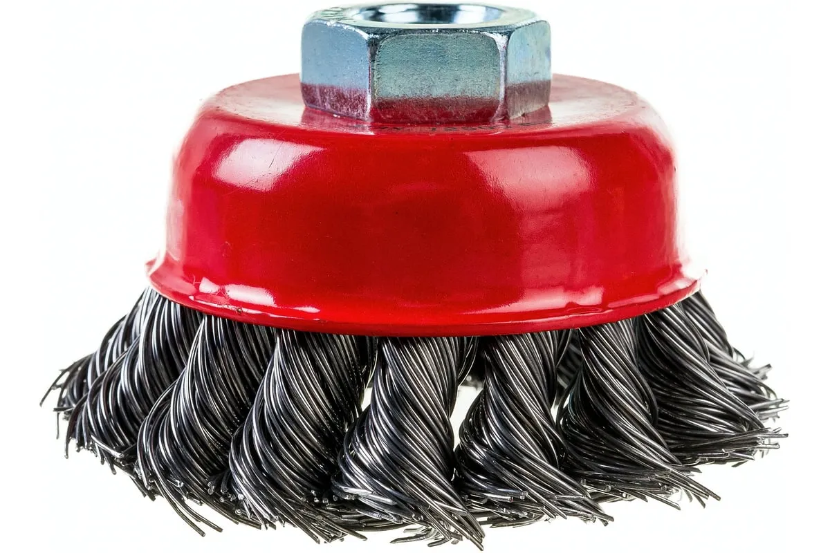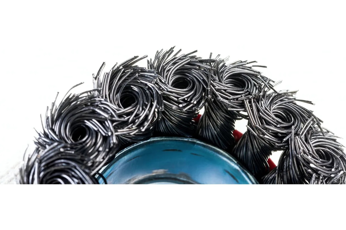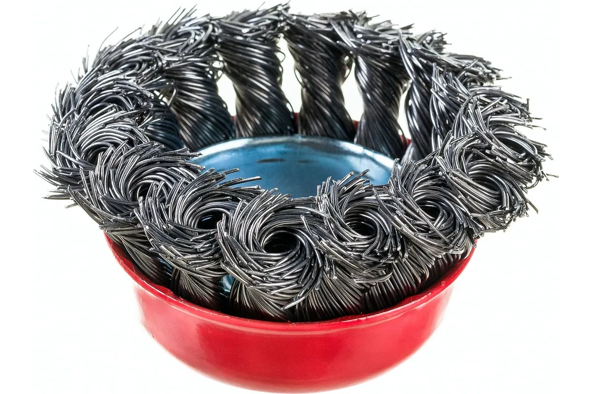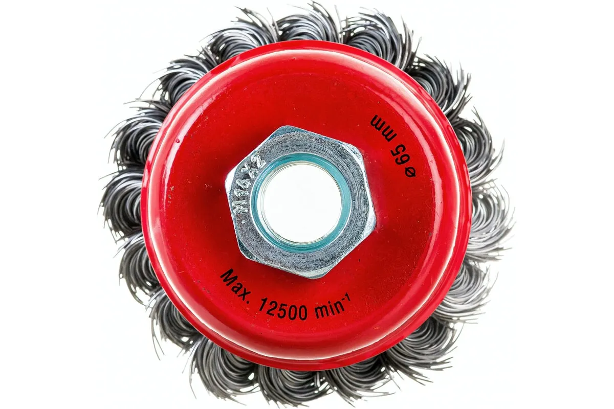 Щетка-крацовка чашечная для УШМ MIRAX 35104-065 быстро и эффективноснимает слой старых покрытий с металлических поверхностей. Также удаляет ржавчину и окалину.