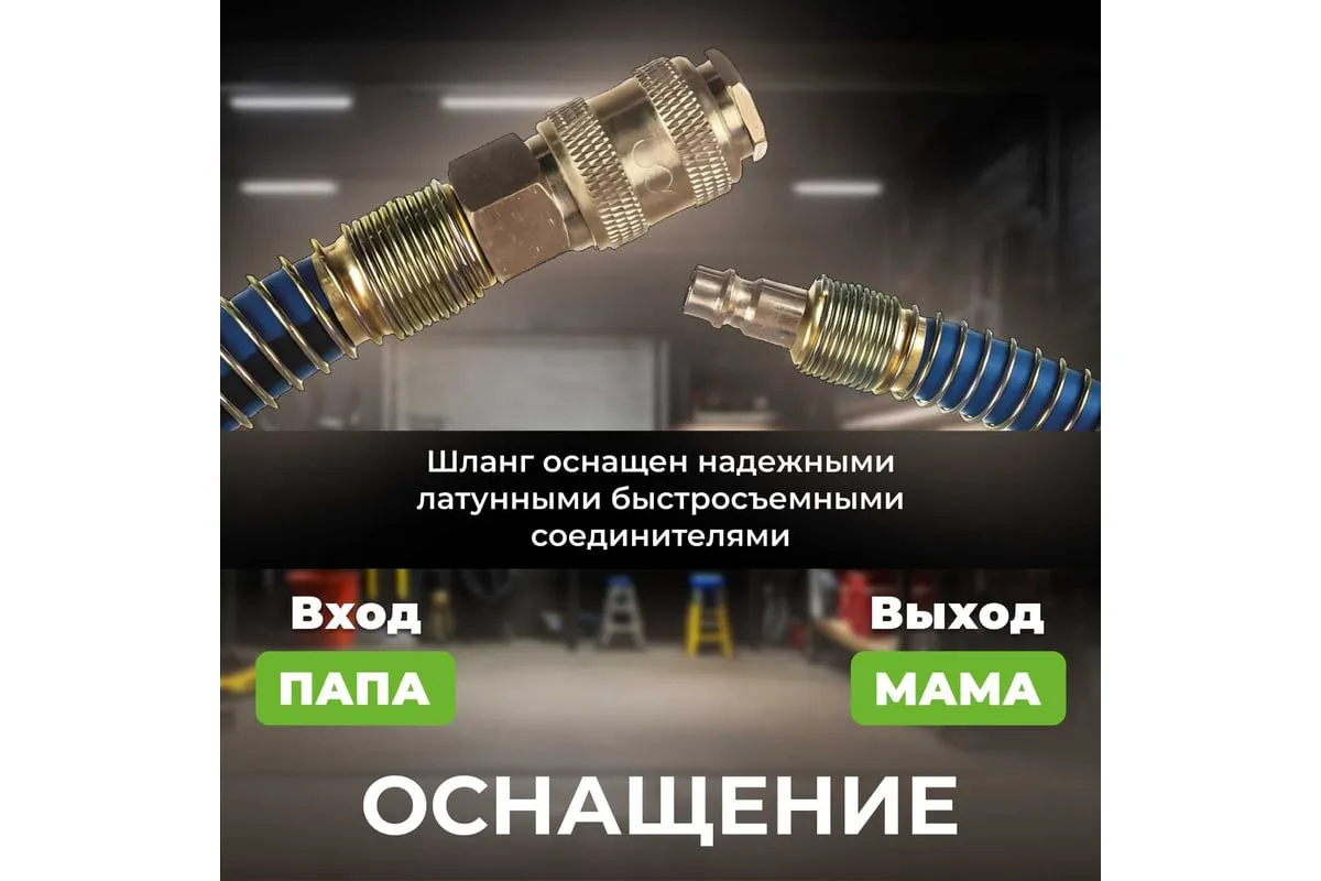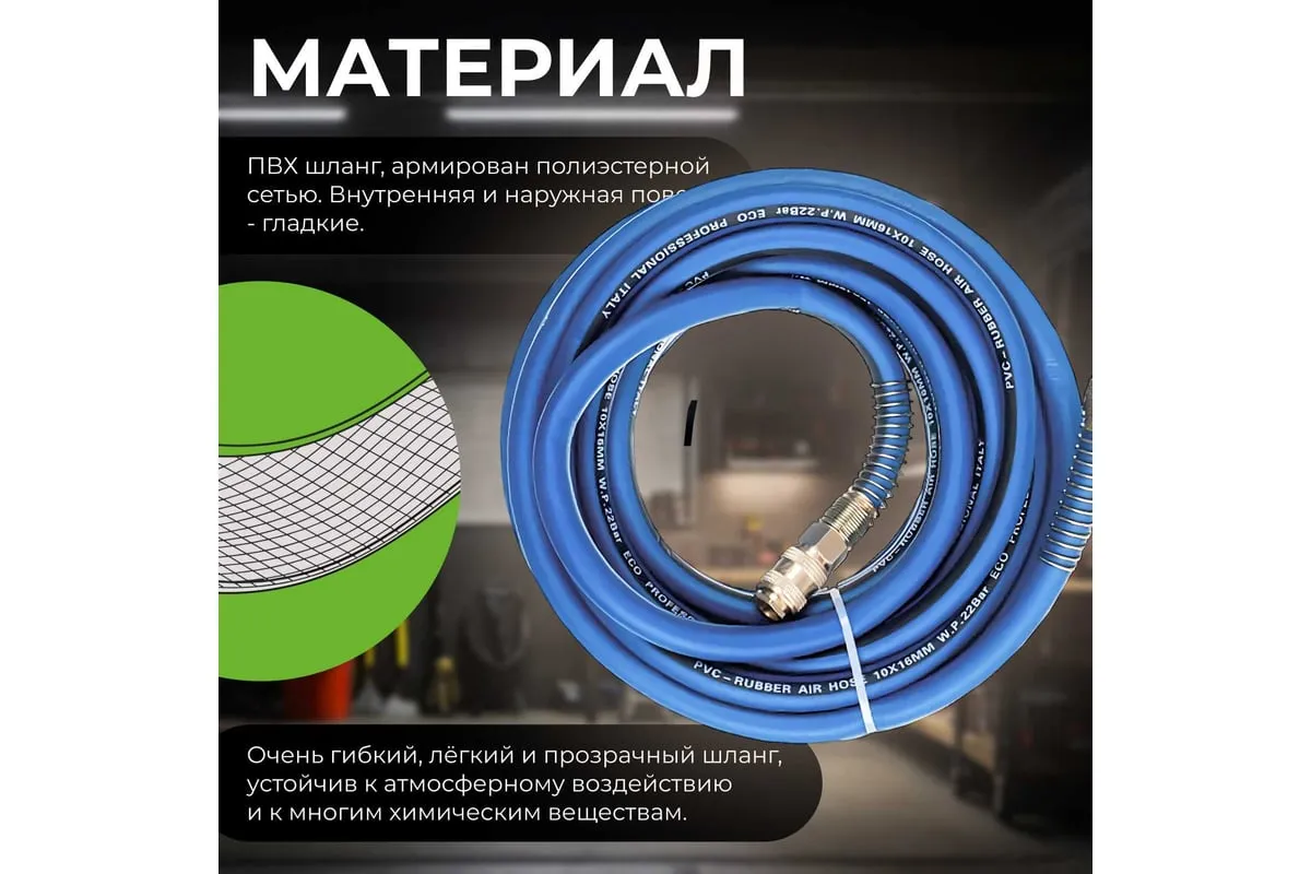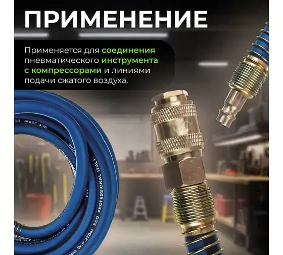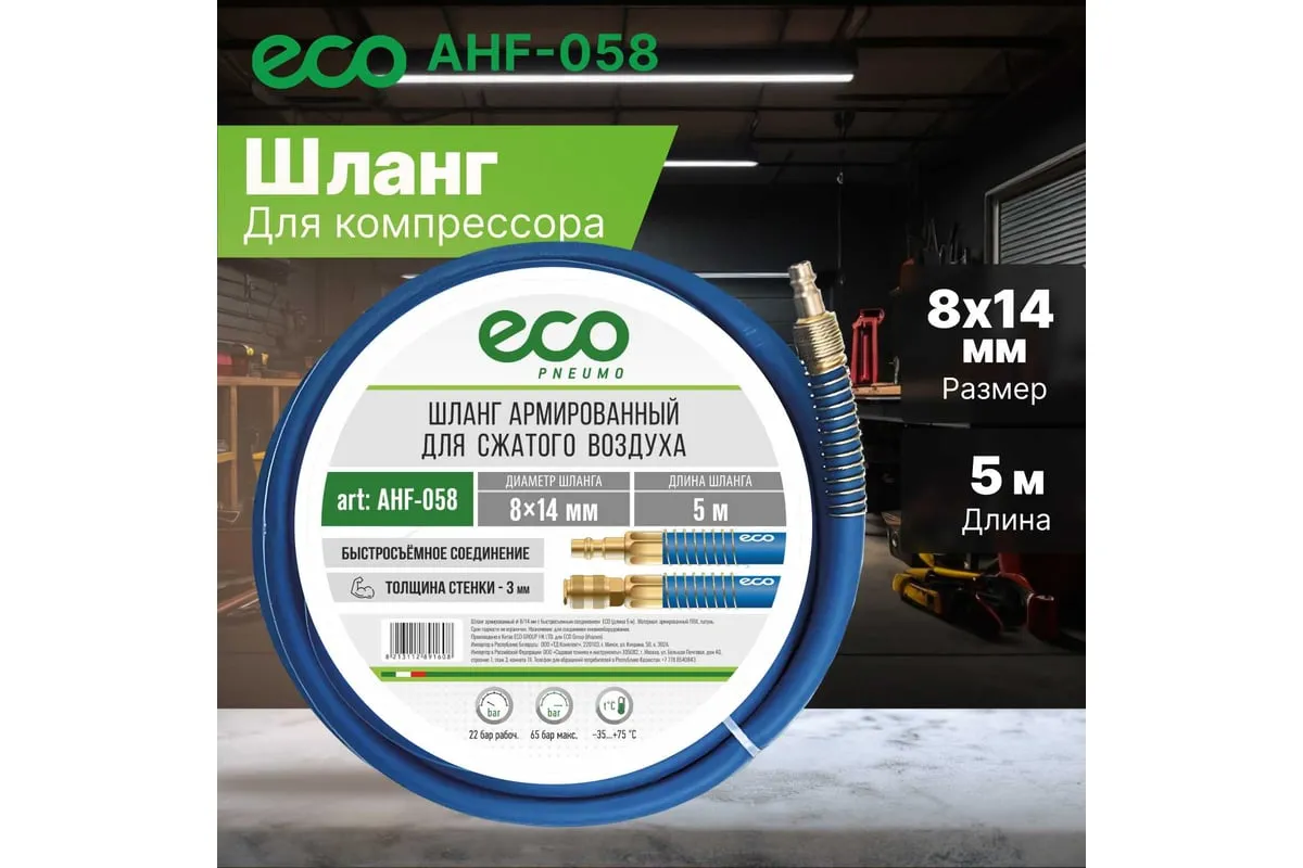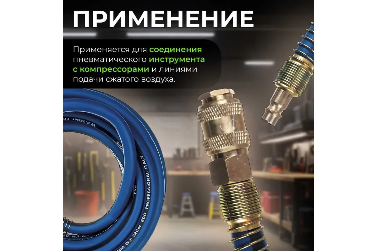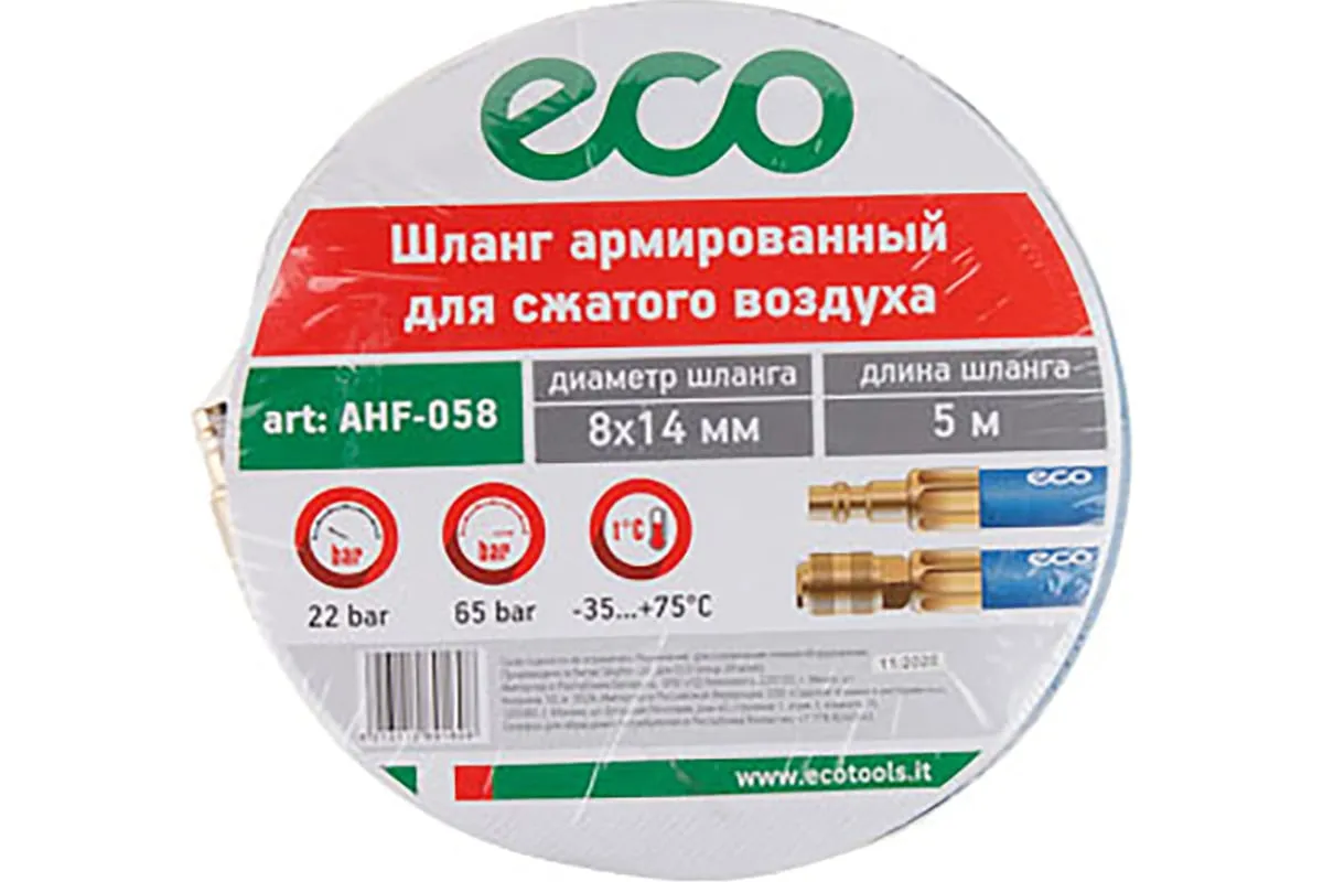 Шланг 8х14 мм, 5 м, ПВХ ECO AHF-058 оснащен быстросъемными соединителями и применяется для соединения пневматического инструмента с компрессорами и линиями подачи сжатого воздуха. Шланг оборудован латунными быстросъемными соединениями ПАПА и МАМА.